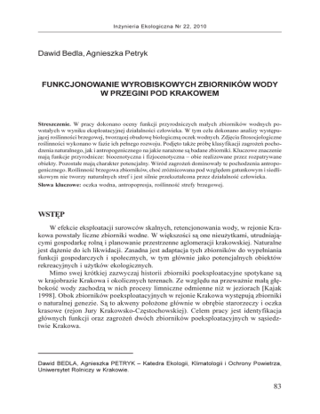 In¿ynieria Ekologiczna Nr 22, 2010 Dawid Bedla, Agnieszka Petryk FUNKCJONOWANIE WYROBISKOWYCH ZBIORNIKÓW WODY W PRZEGINI POD KRAKOWEM Streszczenie. W pracy dokonano oceny funkcji przyrodniczych ma³ych zbiorników wodnych powsta³ych w wyniku eksploatacyjnej dzia³alnoci cz³owieka. W tym celu dokonano analizy wystêpuj¹cej rolinnoci brzegowej, tworz¹cej obudowê biologiczn¹ oczek wodnych. Zdjêcia fitosocjologiczne rolinnoci wykonano w fazie ich pe³nego rozwoju. Podjêto tak¿e próbê klasyfikacji zagro¿eñ pochodzenia naturalnego, jak i antropogenicznego na jakie nara¿one s¹ badane zbiorniki. Kluczowe znaczenie maj¹ funkcje przyrodnicze: biocenotyczna i fizjocenotyczna obie realizowane przez rozpatrywane obiekty. Pozosta³e maj¹ charakter potencjalny. Wród zagro¿eñ dominowa³y te pochodzenia antropogenicznego. Rolinnoæ brzegowa zbiorników, choæ zró¿nicowana pod wzglêdem gatunkowym i siedliskowym nie tworzy naturalnych stref i jest silnie przekszta³cona przez dzia³alnoæ cz³owieka. S³owa kluczowe: oczka wodna, antropopresja, rolinnoæ strefy brzegowej. WSTÊP W efekcie eksploatacji surowców skalnych, retencjonowania wody, w rejonie Krakowa powsta³y liczne zbiorniki wodne. W wiêkszoci s¹ one nieu¿ytkami, utrudniaj¹cymi gospodarkê roln¹ i planowanie przestrzenne aglomeracji krakowskiej. Naturalne jest d¹¿enie do ich likwidacji. Zasadna jest adaptacja tych zbiorników do wype³niania funkcji gospodarczych i spo³ecznych, w tym g³ównie jako potencjalnych obiektów rekreacyjnych i u¿ytków ekologicznych. Mimo swej krótkiej zazwyczaj historii zbiorniki poeksploatacyjne spotykane s¹ w krajobrazie Krakowa i okolicznych terenach. Ze wzglêdu na przewa¿nie ma³¹ g³êbokoæ wody zachodz¹ w nich procesy limniczne odmienne ni¿ w jeziorach [Kajak 1998]. Obok zbiorników poeksploatacyjnych w rejonie Krakowa wystêpuj¹ zbiorniki o naturalnej genezie. S¹ to akweny po³o¿one g³ównie w obrêbie starorzeczy i oczka krasowe (rejon Jury Krakowsko-Czêstochowskiej). Celem pracy jest identyfikacja g³ównych funkcji oraz zagro¿eñ dwóch zbiorników poeksploatacyjnych w s¹siedztwie Krakowa. Dawid BEDLA, Agnieszka PETRYK Katedra Ekologii, Klimatologii i Ochrony Powietrza, Uniwersytet Rolniczy w Krakowie. 83 In¿ynieria Ekologiczna Nr 22, 2010 PRZEGL¥D LITERATURY Zachowanie i ochrona oczek wodnych mo¿e byæ k³opotliwa w kontekcie dynamicznie rozwijaj¹cej siê aglomeracji miejskiej i przemys³owej, gdzie jest ekspansja wszelkiego typu infrastruktury. Omawiane zbiorniki wody s¹ elementami rodowiska przyrodniczego pe³ni¹cymi szereg wa¿nych funkcji. Funkcja krajobrazowa rozumiana jest jako estetyka terenu i zawiera element subiektywnej oceny atrakcyjnoci rodowiska. Funkcje naukowo-dydaktyczna i rekreacyjna ³¹cz¹ w sobie zarówno elementy przyrodnicze jak i aspekty estetyczne. Funkcja naukowo-dydaktyczna realizowana winna byæ przez obiekty o wyró¿niaj¹cych siê walorach przyrodniczych m. in. poprzez tworzenie cie¿ek edukacyjnych, tablic informacyjnych. Przez funkcjê produkcyjn¹ nale¿y rozumieæ potencjaln¹ mo¿liwoæ prowadzenia hodowli i po³owu ryb [Panek, Bedla 2008]. G³ównymi wadami ma³ych zbiorników wodnych jest ich podatnoæ na dynamiczne zarastanie, zamulanie i zanikanie. Procesy te podzieliæ mo¿na na naturalne i antropogeniczne [Surmacki 1998]. Naturalnymi procesami s¹ sukcesja ekologiczna prowadz¹ca do samorzutnego, stopniowego zarastania zbiorników oraz okresowe niedobory opadów (anomalia pogodowe), powoduj¹ce obni¿enie zwierciad³a wód gruntowych. Wród antropogenicznych wymieniæ nale¿y: wypalanie rolinnoci brzegowej, prace melioracyjne w s¹siedztwie zbiorników, wycinanie drzew i zakrzewieñ wokó³ akwenów, zrzuty cieków, sk³adowanie odpadów, rozbudowa osiedli mieszkaniowych. Zbiorniki wodne wystêpuj¹ce w otoczeniu gruntów ornych s¹ nara¿one na proces sp³ywu powierzchniowego i eutrofizacji, a tak¿e na zape³nianie ziemi¹ w celu powiêkszenia area³u produkcyjnego. S¹siedztwo dróg i innych elementów infrastruktury wymusza nietypowe w naturalnych uk³adach przyrodniczych trasy migracji organizmów [Chmielewski 2000]. Rezultatem opisanych zmian jest zanikanie ma³ych zbiorników, co nasila zjawisko degradacji rodowiska, obserwowane w Polsce pó³nocnej [Pieñkowski 2003]. Brak jest analogicznych opracowañ do Polski po³udniowej. MATERIA£ I METODY Obiektami badañ s¹ dwa zbiorniki w miejscowoci Przeginia 25 km na zachód od Krakowa w gminie Czernichów (rys. 1, rys. 2.), powsta³e w wyniku eksploatacji pisaku. S¹ to zbiorniki wyrobiskowe, do których zalicza siê równie¿ zawodnione sztuczne zag³êbienia terenowe powsta³e w wyniku wyrobiska po eksploatacji gliny, piasku, ¿wiru, czy torfu. Funkcjonowanie zbiorników w Przegini oceniono w oparciu o dostêpn¹ literaturê oraz badania w³asne. Oceny funkcji dokonano na podstawie kilkunastu wizji terenowych, oraz prac kameralnych, w tym: analizy map topograficznych, glebowych, dokumentów i planów. Zaproponowany zosta³ ujednolicony schemat opisu obiektów, obejmuj¹cy: szczegó³ow¹ lokalizacjê, cechy fizyczne (powierzchnia lustra wody i umowna wielkoæ), charakterystykê przyrodnicz¹, pe³nione funkcje oraz zagro¿enia. Charakterystyka przyrodnicza obiektów obejmuje: stan zachowania (obiekt sta³y/okresowy), 84 In¿ynieria Ekologiczna Nr 22, 2010 Rys. 1. Lokalizacja obiektu badañ Bonar Rys. 2. Lokalizacja obiektu badañ Przeginia typ (ródleny, ródpolny, ródpolno-ródleny), obudowê biologiczn¹ brzegów (drzewa, zarola, rolinnoæ ³¹kowa, rolinnoæ szuwarowa, brak pasa rolinnoci). Szczególn¹ uwagê zwrócono na rolinn¹ obudowê biologiczn¹ brzegów zbiorników, opisuj¹c g³ówne zbiorowiska rolinne w s¹siedztwie oczek wodnych, wykonuj¹c seriê zdjêæ fitosocjologicznych metod¹ Braun Blanqueta. 85 In¿ynieria Ekologiczna Nr 22, 2010 WYNIKI BADAÑ I DYSKUSJA Wielkoæ i stan zbiorników wodnych s¹ podstawowymi kryteriami w ocenie ich 