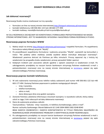 ZASADY REZERWACJI ORLA STUDIO Jak dokonać rezerwacji? Rezerwację Studio można zrealizować na trzy sposoby: formularz on-line na naszej stronie internetowej http://fotograf-reklamowy.pl/rezerwacja/ kontakt telefoniczny +48 506-061-122 lub +48 663-177-494 kontakt mailowy: [email protected] lub [email protected] W CELU REZERWACJI ZACHĘCAMY DO KORZYSTANIA Z FORMULARZA PRZYGOTOWANEGO NA NASZEJ STRONIE INTERNETOWEJ. JEST TO NAJBARDZIEJ WYGODNA I NAJSZYBSZA FORMA REZERWACJI STUDIO. Rezerwacja poprzez formularz WWW 1. Należy wejść na stronę http://fotograf-reklamowy.pl/rezerwacja/ i wypełnić formularz. Po wypełnieniu formularza należy kliknąć przycisk "Wyślij". 2. Po prawidłowym wypełnieniu formularza i wybraniu przycisku "Wyślij", wyświetli się komunikat o treści: "Na podany adres mailowy zostały wysłane dalsze instrukcje dotyczące rezerwacji". Wiadomość powinna dotrzeć do Państwa po kilku minutach. Proszę zapoznać się z treścią tej wiadomości (w przypadku braku wiadomości, proszę sprawdzić folder spamu). 3. Kolejnym krokiem jest uiszczenie zaliczki zgodnie z opisem zawartym w wiadomości e-mail. Po zaksięgowaniu przedpłaty na naszym koncie bankowym otrzymają Państwo wiadomość e-mail z potwierdzeniem rezerwacji oraz na naszej stronie internetowej w terminarzu pojawi się wpis odzwierciedlający Państwa rezerwację. Rezerwacja poprzez kontakt telefoniczny 1. W celu wykonania rezerwacji przez telefon należy zadzwonić pod numer +48 506-061-122 lub +48 663-177-494. Zostaną Państwo poproszeni o podanie następujących danych: o imię i nazwisko, o telefon kontaktowy, o adres e-mail, o dane dotyczące dnia oraz godzin wynajmu. 2. Zostanie Państwu udzielona informacja o kosztach wynajmu i o wysokości zaliczki, którą należy uiścić w ciągu 3 dni roboczych od daty dokonania rezerwacji. 3. Dane do wykonania przelewu zaliczki: Tytuł przelewu: "Zaliczka - imię i nazwisko, nr telefonu kontaktowego, adres e-mail". Numer rachunku bankowego: Marek Babirecki 62 1140 2004 0000 3302 0248 8540 BRAK DANYCH OSOBOWYCH I DANYCH KONTAKTOWYCH W TYTULE PRZELEWU NALEŻNOŚCI ZA REZERWACJĘ MOŻE SPOWODOWAĆ PROBLEMY Z IDENTYFIKACJĄ OSOBY REZERWUJĄCEJ. 4. Po zaksięgowaniu przedpłaty na naszym koncie bankowym otrzymają Państwo wiadomość e-mail z potwierdzeniem rezerwacji oraz na naszej stronie internetowej w terminarzu pojawi się wpis odzwierciedlający Państwa rezerwację. Rezerwacja poprzez kontakt mailowy 1. W celu wykonania rezerwacji pocztą elektroniczną, należy wysłać na adres mailowy [email protected] lub [email protected], poniższe informacje: o imię i nazwisko, o telefon kontaktowy, o adres e-mail, o dane dotyczące dnia oraz godzin wynajmu. 2. Zostanie Państwu udzielona zwrotna informacja o kosztach wynajmu i o wysokości zaliczki, którą należy uiścić w ciągu 3 dni roboczych od daty dokonania rezerwacji. 3. Dane do wykonania przelewu zaliczki: Tytuł przelewu: "Zaliczka - imię i nazwisko, nr telefonu kontaktowego, adres e-mail". Numer rachunku bankowego: Marek Babirecki 62 1140 2004 0000 3302 0248 8540 BRAK DANYCH OSOBOWYCH I DANYCH KONTAKTOWYCH W TYTULE PRZELEWU NALEŻNOŚCI ZA REZERWACJĘ MOŻE SPOWODOWAĆ PROBLEMY Z IDENTYFIKACJĄ OSOBY REZERWUJĄCEJ. 4. Po zaksięgowaniu przedpłaty na naszym koncie bankowym otrzymają Państwo wiadomość e-mail z potwierdzeniem rezerwacji oraz na naszej stronie internetowej w terminarzu pojawi się wpis odzwierciedlający Państwa rezerwację. Warunki ogólne 1. Jeżeli zależy Państwu na szybkim potwierdzeniu rezerwacji, można przesłać do nas drogą mailową potwierdzenie wpłaty. Adres mailowy [email protected] lub [email protected] 2. W każdym opisanym powyżej przypadku, brak wpłaty zaliczki powoduje że rezerwacja zostanie anulowana. 3. Obowiązuje kolejność zgłoszeń rezerwacji. Pozdrawiamy, Zespół Orla Studio