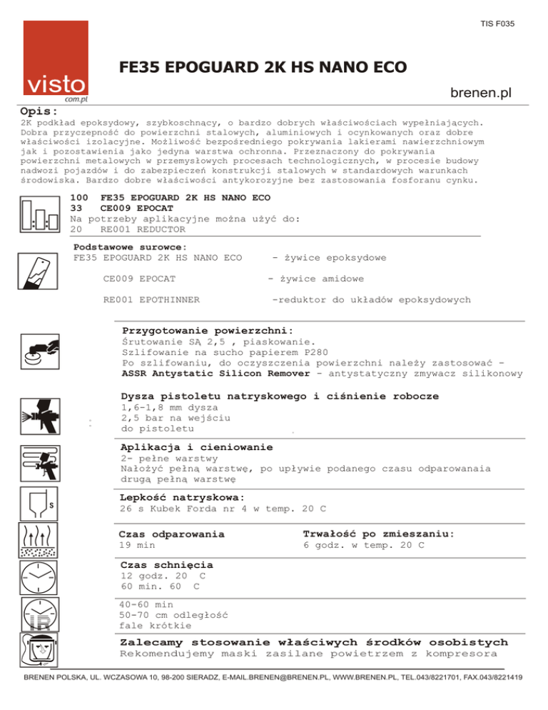 TIS F035 FE35 EPOGUARD 2K HS NANO ECO brenen.pl Opis: 2K podkład epoksydowy, szybkoschnący, o bardzo dobrych właściwościach wypełniających. Dobra przyczepność do powierzchni stalowych, aluminiowych i ocynkowanych oraz dobre właściwości izolacyjne. Możliwość bezpośredniego pokrywania lakierami nawierzchniowym jak i pozostawienia jako jedyna warstwa ochronna. Przeznaczony do pokrywania powierzchni metalowych w przemysłowych procesach technologicznych, w procesie budowy nadwozi pojazdów i do zabezpieczeń konstrukcji stalowych w standardowych warunkach środowiska. Bardzo dobre właściwości antykorozyjne bez zastosowania fosforanu cynku. 100 FE35 EPOGUARD 2K HS NANO ECO 33 CE009 EPOCAT Na potrzeby aplikacyjne można użyć do: 20 RE001 REDUCTOR Podstawowe surowce: FE35 EPOGUARD 2K HS NANO ECO CE009 EPOCAT - żywice epoksydowe - żywice amidowe RE001 EPOTHINNER -reduktor do układów epoksydowych Przygotowanie powierzchni: Śrutowanie SĄ 2,5 , piaskowanie. Szlifowanie na sucho papierem P280 Po szlifowaniu, do oczyszczenia powierzchni należy zastosować ASSR Antystatic Silicon Remover - antystatyczny zmywacz silikonowy Dysza pistoletu natryskowego i ciśnienie robocze o o 1,6-1,8 mm dysza 2,5 bar na wejściu do pistoletu O Aplikacja i cieniowanie 2- pełne warstwy Nałożyć pełną warstwę, po upływie podanego czasu odparowanaia drugą pełną warstwę O Lepkość natryskowa: 26 s Kubek Forda nr 4 w temp. 20 C Czas odparowania Trwałość po zmieszaniu: 19 min 6 godz. w temp. 20 C Czas schnięcia 12 godz. 20 C 60 min. 60 C 40-60 min 50-70 cm odległość fale krótkie Zalecamy stosowanie właściwych środków osobistych Rekomendujemy maski zasilane powietrzem z kompresora BRENEN POLSKA, UL. WCZASOWA 10, 98-200 SIERADZ, [email protected], WWW.BRENEN.PL, TEL.043/8221701, FAX.043/8221419 TIS F035 FE35 EPOGUARD 2K HS NANO ECO brenen.pl Dysze pistoletów natryskowych i ciśnienia: Wielkość dyszy 1,6 - 1,8 mm Konwencjonalny DeVilbiss, Sata Trans-Tech grawitacyjny 1,6 - 1,8 mm DeVilbiss, Sata Trans-Tech ssący 1,8 - 2,0 mm Natrysk hydrodynamiczny Airmix lub Airless 0,28 mm Ciśnienie robocze 3,5-4 bar na wejściu do pistoletu 2,5 bar na wejściu do pistoletu 2,5 bar na wejściu do pistoletu 120-140 bar na wejściu do pistoletu Grubość powłoki: Według rekomendowanej aplikacji - 120-180 um Suszenie: O 20 C Czas odparowania Pyłosuchość 60 min O 60 C Promiennik IR (fale krótkie) odległość 50-70 cm 5-8 min 5-8 min 10 min 2-3 min Możliwość 30 min 8-10 min 8 godz manipulacji Uwaga: po suszeniu w temperaturze 60 C i promiennikiem IR należy wystudzić objekt do temperatury otoczenia przed przystąpieniem do dalszych czynności technologicznych. Czasy suszenia podane dla rekomendowanej aplikacji i zalecanej temperatury objektu. Temperatura objektu podczas suszenia nie może przekroczyć 100 C . O O Polerowanie: Nie polerujemy Wydajność: Praktyczne zużycie materiału zależy od wielu czynników, między innymi: kształt obiektu, chropowatość podłoża, metody nakładania, warunki pracy oraz przede wszystkim grubości powłoki itp. Przy rekomendowanej aplikacji wydajność teoretyczna 3m2/l lub 1,8m2/kg. Czyszczenie sprzętu: Rozcieńczalniki do mycia pistoletów, rozcieńczalnik nitrocelulozowy. Rekomendujemy rozcieńczalnik do myjek i mycia sprzętu lakierniczego RC001 CLEANSOL BRENEN POLSKA, UL. WCZASOWA 10, 98-200 SIERADZ, [email protected], WWW.BRENEN.PL, TEL.043/8221701, FAX.043/8221419 TIS F035 FE35 EPOGUARD 2K HS NANO ECO brenen.pl Lotne Związki Organiczne (VOC): Lakier spełnia wymagania Dyrektywy UE 2004/42/CE z 21 kwietnia 2004 roku, wg której limit wynosi 540 g/l VOC z mieszanki gotowej do użycia. Zawartość VOC dla tego produktu gotowego do użycia wynosi maksymalnie 420 g/l. % Przechowywanie: Przechowuj produkt szczelnie zamknięty. Unikaj dużych różnic temperatur. Temperatura przechowywania 15-20 C. Okres magazynowania 12 miesięcy. O Przepisy BHP: Wyłącznie do profesjonalnego użytku. Sprawdź etykietę produktu. Użytkownik tego produktu jest zobowiązany do przestrzegania ustawowo obowiązujących w danym kraju przepisów BHP i postępowania z odpadami. O Informacje i sugestie zawarte w tej instrukcji wynikają z naszego doświadczenia i przeprowadzonych badań. Zapewniamy, że nasze produkty posiadają najwyższą jakość. Nie bierzemy odpowiedzialności za wpływ na rezultat końcowy czynników będących poza naszą kontrolą. Klient ponosi odpowiedzialność za właściwy dobór produktów do określonej sytuacji i warunków jakimi dysponuje. Zapoznaj się z Kartą Charakterystyki FE35 BRENEN POLSKA, UL. WCZASOWA 10, 98-200 SIERADZ, [email protected], WWW.BRENEN.PL, TEL.043/8221701, FAX.043/8221419