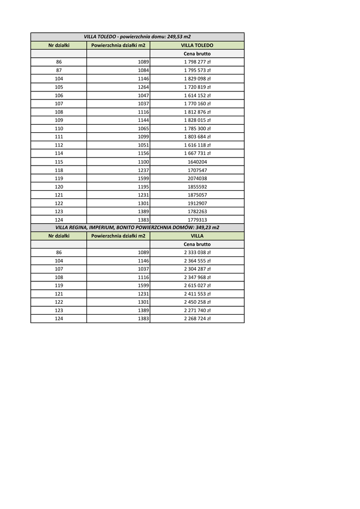 VILLA TOLEDO - powierzchnia domu: 249,53 m2 Nr działki Powierzchnia działki m2 VILLA TOLEDO Cena brutto 86 1089 1 798 277 zł 87 1084 1 795 573 zł 104 1146 1 829 098 zł 105 1264 1 720 819 zł 106 1047 1 614 152 zł 107 1037 1 770 160 zł 108 1116 1 812 876 zł 109 1144 1 828 015 zł 110 1065 1 785 300 zł 111 1099 1 803 684 zł 112 1051 1 616 118 zł 114 1156 1 667 731 zł 115 1100 1640204 118 1237 1707547 119 1599 2074038 120 1195 1855592 121 1231 1875057 122 1301 1912907 123 1389 1782263 124 1383 1779313 VILLA REGINA, IMPERIUM, BONITO POWIERZCHNIA DOMÓW: 349,23 m2 Nr działki Powierzchnia działki m2 VILLA Cena brutto 86 1089 2 333 038 zł 104 1146 2 364 555 zł 107 1037 2 304 287 zł 108 1116 2 347 968 zł 119 1599 2 615 027 zł 121 1231 2 411 553 zł 122 1301 2 450 258 zł 123 1389 2 271 740 zł 124 1383 2 268 724 zł