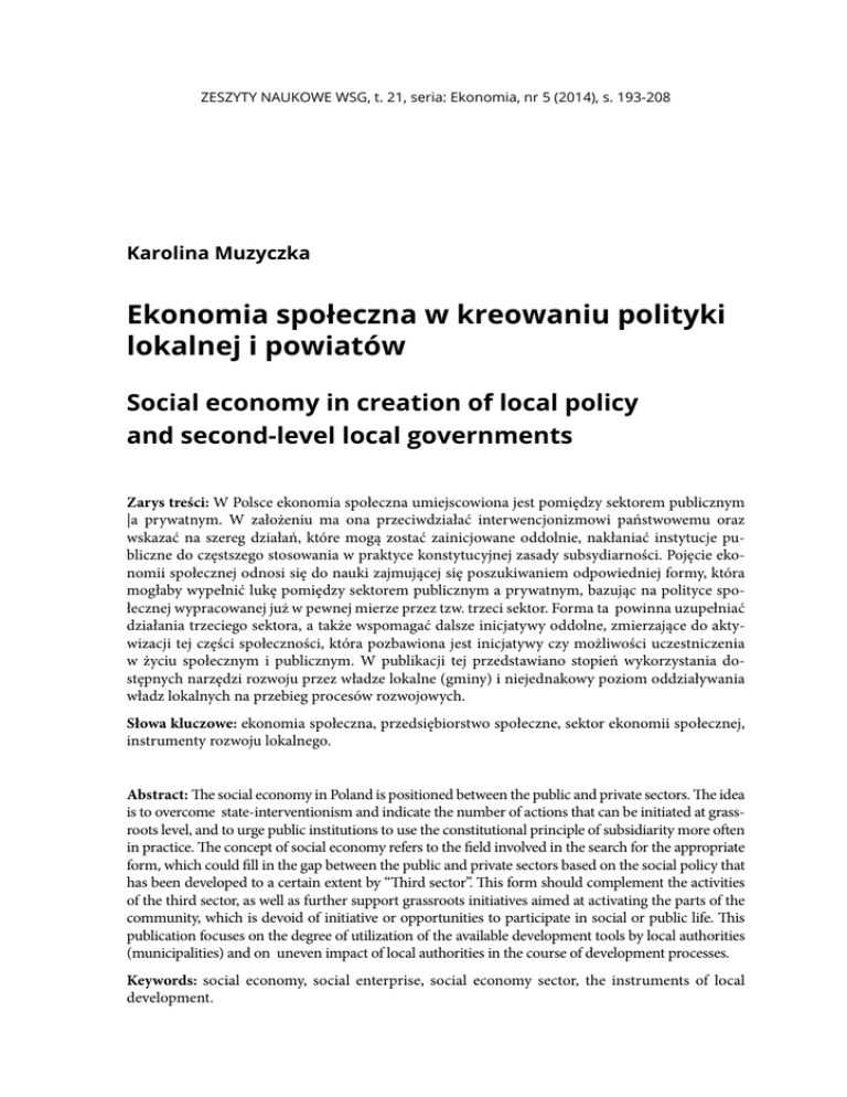 ZESZYTY NAUKOWE WSG, t. 21, seria: Ekonomia, nr 5 (2014), s. 193-208 Karolina Muzyczka Ekonomia społeczna w kreowaniu polityki lokalnej i powiatów Social economy in creation of local policy and second-level local governments Zarys treści: W Polsce ekonomia społeczna umiejscowiona jest pomiędzy sektorem publicznym |a prywatnym. W założeniu ma ona przeciwdziałać interwencjonizmowi państwowemu oraz wskazać na szereg działań, które mogą zostać zainicjowane oddolnie, nakłaniać instytucje publiczne do częstszego stosowania w praktyce konstytucyjnej zasady subsydiarności. Pojęcie ekonomii społecznej odnosi się do nauki zajmującej się poszukiwaniem odpowiedniej formy, która mogłaby wypełnić lukę pomiędzy sektorem publicznym a prywatnym, bazując na polityce społecznej wypracowanej już w pewnej mierze przez tzw. trzeci sektor. Forma ta powinna uzupełniać działania trzeciego sektora, a także wspomagać dalsze inicjatywy oddolne, zmierzające do aktywizacji tej części społeczności, która pozbawiona jest inicjatywy czy możliwości uczestniczenia w życiu społecznym i publicznym. W publikacji tej przedstawiano stopień wykorzystania dostępnych narzędzi rozwoju przez władze lokalne (gminy) i niejednakowy poziom oddziaływania władz lokalnych na przebieg procesów rozwojowych. Słowa kluczowe: ekonomia społeczna, przedsiębiorstwo społeczne, sektor ekonomii społecznej, instrumenty rozwoju lokalnego. Abstract: The social economy in Poland is positioned between the public and private sectors. The idea is to overcome state-interventionism and indicate the number of actions that can be initiated at grassroots level, and to urge public institutions to use the constitutional principle of subsidiarity more often in practice. The concept of social economy refers to the field involved in the search for the appropriate form, which could fill in the gap between the public and private sectors based on the social policy that has been developed to a certain extent by “Third sector”. This form should complement the activities of the third sector, as well as further support grassroots initiatives aimed at activating the parts of the community, which is devoid of initiative or opportunities to participate in social or public life. This publication focuses on the degree of utilization of the available development tools by local authorities (municipalities) and on uneven impact of local authorities in the course of development processes. Keywords: social economy, social enterprise, social economy sector, the instruments of local development. 194 Karolina Muzyczka Wstęp Globalizujący się gospodarczo i politycznie świat powoduje, iż poszukuje się rozwiązań, które zezwoliłyby na zmierzenie się z nowymi wymiarami problemów ekonomicznych. Ekonomia społeczna w różnych formach pojawia się na całym świecie i to niezależnie od poziomu zamożności, systemu politycznego i dominującej w danym kraju religii. Państwa dostrzegają rolę tego nurtu w rozwoju społeczno-gospodarczym i polityce spójności. Środowisko biznesu spogląda na ideę przedsiębiorstw społecznych jako sposób dotarcia ze swoimi usługami do najbiedniejszych. Idea ta zyskuje popularność w środowisku organizacji pozarządowych, które poszukują mechanizmów ekonomicznej samodzielności dla siebie oraz trwałych rozwiązań dla swoich podopiecznych. Próby definiowania ekonomii1 społecznej (określanej również jako gospodarka społeczna, ekonomia solidarna) oraz przedsiębiorstwa społecznego rozpoczęły się w 2004 r. Podstawą dyskusji nad definiowaniem sektora była od początku Karta zasad gospodarki społecznej CEP-CMAF z 2002 r., w której stwierdzono, iż organizacje ekonomii społecznej są to podmioty gospodarcze i społeczne działające we wszystkich sektorach. Wyróżniają się one głównie swoimi celami oraz charakterystyczną formą przedsiębiorczości. Ekonomia społeczna obejmuje organizacje takie, jak: spółdzielnie, towarzystwa wzajemnościowe, stowarzyszenia i fundacje. Przedsiębiorstwa te są szczególnie aktywne w obszarach takich, jak: ochrona socjalna, usługi społeczne, ochrona zdrowia, bankowość, ubezpieczenia, produkcja rolnicza, kwestie konsumenckie, praca stowarzyszeniowa, rzemiosło, mieszkalnictwo, dostawy, usługi sąsiedzkie, edukacja i szkolenia oraz obszar kultury, sportu i rekreacji2. Pojęcie ekonomii społecznej nie jest jednak szczegółowo zdefiniowane. Eksperci kierują się potrzebą zdefiniowania pojęcia przedsiębiorstwa społecznego jako rdzenia ekonomii społecznej. Na poziomie europejskim Europejska Sieć Badawcza European Research Network (EMES)3 zaproponowała zbiór wspólnych 1 W dokumencie przygotowawczym przed I Europejską Konferencją Ekonomii Społecznej w Krajach Europy Środkowo-Wschodniej, która odbyła się w październiku 2002 r. w Pradze, Bruno Roelants napisał o ekonomii społecznej: „każdy wie, że istnieje, ale nikt nie wie, co to jest”. Chociaż od napisania tych słów minęło wiele lat, spory definicyjne wokół sektora ekonomii społecznej nadal nie dały jednoznacznej odpowiedzi na pytanie czym jest ekonomia społeczna i jakie rodzaje podmiotów można do niej zaliczyć. M. Bohdziewicz-Lulewicz, J. Brzozowska, B. Grodowska, A. Krampus-Sepielak, S. Krupnik, A. Spurek, A. Szczucka, K. Wiecha, B. Worek, Społeczny biznes. Teoria i praktyka, Małopolska Agencja Rozwoju Regionalnego, Kraków 2008. 2 Europejska Stała Konferencja Spółdzielni, Towarzystw Wzajemnych, Stowarzyszeń i Fundacji. W roku 2008 CEP-CMAF przyjęła nazwę „Europejska Ekonomia Społeczna” (Social Economy Europe). Tekst karty opublikowano w: „Ekonomia Społeczna Kraków 2004, II Europejska Konferencja Ekonomii Społecznej. Materiały”, MPIPS, ZLSP, Warszawa 2005, <www.pozytek.gov.pl/files/KPRES.pdf>, 24 listopada 2013 r. 3 EMES – European Research Network (Europejska Sieć Badawcza) określa szereg kryteriów ekono- E