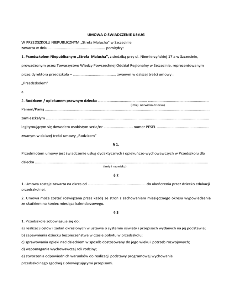 UMOWA O ŚWIADCZENIE USŁUG W PRZEDSZKOLU NIEPUBLICZNYM „Strefa Malucha” w Szczecinie zawarta w dniu ...................................................... pomiędzy: 1. Przedszkolem Niepublicznym „Strefa Malucha”, z siedzibą przy ul. Niemierzyńskiej 17 a w Szczecinie, prowadzonym przez Towarzystwo Wiedzy Powszechnej Oddział Regionalny w Szczecinie, reprezentowanym przez dyrektora przedszkola – …………………………………….., zwanym w dalszej treści umowy : „Przedszkolem” a 2. Rodzicem / opiekunem prawnym dziecka ………………...………………………… ……………………………….……………………… (imię i nazwisko dziecka) Panem/Panią ………………………………………………………………………………………………………………………………………….………….. zamieszkałym …………………………………………………....................................................................................................... legitymującym się dowodem osobistym seria/nr …………….............. numer PESEL .................................................. zwanym w dalszej treści umowy „Rodzicem” § 1. Przedmiotem umowy jest świadczenie usług dydaktycznych i opiekuńczo-wychowawczych w Przedszkolu dla dziecka ……………………………………………………………………………………………………………………………………………………………… (imię i nazwisko) §2 1. Umowa zostaje zawarta na okres od ………….............................................do ukończenia przez dziecko edukacji przedszkolnej. 2. Umowa może zostać rozwiązana przez każdą ze stron z zachowaniem miesięcznego okresu wypowiedzenia ze skutkiem na koniec miesiąca kalendarzowego. §3 1. Przedszkole zobowiązuje się do: a) realizacji celów i zadań określonych w ustawie o systemie oświaty i przepisach wydanych na jej podstawie; b) zapewnienia dziecku bezpieczeństwa w czasie pobytu w przedszkolu; c) sprawowania opieki nad dzieckiem w sposób dostosowany do jego wieku i potrzeb rozwojowych; d) wspomagania wychowawczej roli rodziny; e) stworzenia odpowiednich warunków do realizacji podstawy programowej wychowania przedszkolnego zgodnej z obowiązującymi przepisami. 2. Przedszkole zapewnia dziecku uczestnictwo w następujących zajęciach ponadprogramowych: a) angielski; b) zajęcia muzyczne, bajko i muzyko terapia; c) rytmika i taniec; d) opieka logopedyczna; e) opieka psychologa i diagnoza osiągnięć dziecka; f) gimnastyka korekcyjna; g) treningi pamięci oraz twórczego myślenia; h) zajęcia komputerowe; i) imprezy okolicznościowe, uroczystości odbywające się na terenie placówki i poza nią. 3. Przedszkole zapewnia 5 posiłków dziennie: a) Śniadanie b) Śniadanie II c) Obiad– drugie danie, d) Obiad - zupa e) Podwieczorek 4. Zasady i zakres świadczonych usług, a także funkcjonowania przedszkola określa statut. §4 Rodzice zobowiązują się do: a) zapoznania się i przestrzegania statutu przedszkola ; b) osobistego przyprowadzania dziecka do Przedszkola i odprowadzania go po zakończeniu zajęć lub pisemnego upoważnienia do tego osoby trzeciej – pełnoletniej; c) przyprowadzenia do przedszkola dziecka zdrowego i zdolnego do zajęć; d) informowania dyrektora lub nauczyciela grupy o przyczynach nieobecności dziecka w Przedszkolu trwającego powyżej pięciu dni; e) terminowego uiszczania do 5 dnia każdego miesiąca, z góry, miesięcznej opłaty za Przedszkole. f) wpłacenia przy podpisaniu umowy bezzwrotnej opłaty rocznej (wpisowej), a następnie w kolejnych latach pobytu dziecka w placówce - raz do roku, w miesiącu wrześniu (wraz z pierwszym czesnym) opłaty rocznej (opłata ta nie podlega zwrotowi); g) w przypadku zapisania dziecka w trakcie roku szkolnego (po zakończeniu rekrutacji) opłata roczna jest dzielona na 12 części i pobierana proporcjonalnie do ilości miesięcy pozostałych do zakończenia bieżącego roku szkolnego, w których dziecko będzie uczęszczało do przedszkola. §5 1. Rodzic zobowiązany jest do wnoszenia na rzecz przedszkola następujących opłat: a) Comiesięczna opłata czesnego, płatna przez 12 miesięcy kalendarzowych (od września danego roku do sierpnia roku następnego) Czesne płatne jest z góry do 05-tego dnia każdego miesiąca za dany miesiąc na konto bankowe nr 16 1240 3930 1111 0000 4228 7629 b) Opłata roczna (wpisowa) płatna w ciągu 7 dni od daty otrzymanie informacji o przyjęciu dziecka do przedszkola, nie podlegającej zwrotowi. W przypadku nieuregulowania opłaty w podanym terminie następuje automatyczne rozwiązanie niniejszej umowy. 2. Wysokość opłat obowiązujących na dany rok oświatowy ustala organ prowadzący i podawany jest do wiadomości rodziców na piśmie lub na stronie internetowej przedszkola. Opłaty w roku oświatowym 2015/2016 wynoszą: a) Opłata roczna (wpisowa): 250,00zł b) Czesne miesięczne: 750, 00zł w tym stawka żywieniowa w kwocie 6 zł/osobodzień. 3. Przedszkole zastrzega sobie prawo do zmiany opłat na kolejne lata edukacji przedszkolnej dziecka. Opłaty ustalane są na rok oświatowy, a ich wysokość podawana jest najpóźniej do końca miesiąca czerwca poprzedzającego kolejny rok oświatowy. 4. W przypadku nieterminowego wnoszenia opłat pobierane będą ustawowe odsetki za każdy dzień zwłoki. 5. W razie nieobecności dziecka nie podlega zwrotowi stawka żywieniowa za pierwszy dzień. Rodzice zobowiązani są powiadomić przedszkole o długości nieobecności dziecka. W takim przypadku przedszkole odlicza stawkę żywieniową za ten okres. §6 Przedszkole może rozwiązać umowę i skreślić dziecko z listy wychowanków w przypadku: a) nieprzestrzegania przez Rodziców statutu Przedszkola, b) zalegania odpłatnością za pobyt dziecka w Przedszkolu za okres powyżej jednego miesiąca, c) nieobecności Dziecka