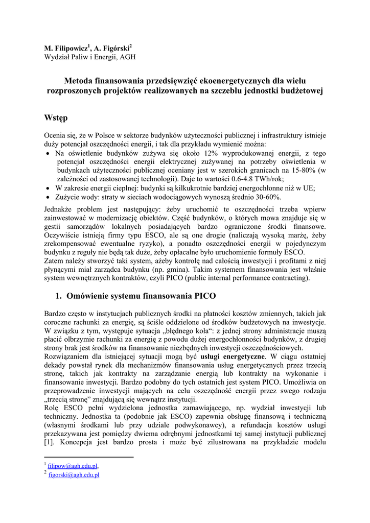 M. Filipowicz1, A. Figórski2 Wydział Paliw i Energii, AGH Metoda finansowania przedsięwzięć ekoenergetycznych dla wielu rozproszonych projektów realizowanych na szczeblu jednostki budżetowej Wstęp Ocenia się, że w Polsce w sektorze budynków użyteczności publicznej i infrastruktury istnieje duży potencjał oszczędności energii, i tak dla przykładu wymienić można: • Na oświetlenie budynków zużywa się około 12% wyprodukowanej energii, z tego potencjał oszczędności energii elektrycznej zużywanej na potrzeby oświetlenia w budynkach użyteczności publicznej oceniany jest w szerokich granicach na 15-80% (w zależności od zastosowanej technologii). Daje to wartości 0.6-4.8 TWh/rok; • W zakresie energii cieplnej: budynki są kilkukrotnie bardziej energochłonne niż w UE; • Zużycie wody: straty w sieciach wodociągowych wynoszą średnio 30-60%. Jednakże problem jest następujący: żeby uruchomić te oszczędności trzeba wpierw zainwestować w modernizację obiektów. Część budynków, o których mowa znajduje się w gestii samorządów lokalnych posiadających bardzo ograniczone środki finansowe. Oczywiście istnieją firmy typu ESCO, ale są one drogie (naliczają wysoką marżę, żeby zrekompensować ewentualne ryzyko), a ponadto oszczędności energii w pojedynczym budynku z reguły nie będą tak duże, żeby opłacalne było uruchomienie formuły ESCO. Zatem należy stworzyć taki system, ażeby kontrolę nad całością inwestycji i profitami z niej płynącymi miał zarządca budynku (np. gmina). Takim systemem finansowania jest właśnie system wewnętrznych kontraktów, czyli PICO (public internal performance contracting). 1. Omówienie systemu finansowania PICO Bardzo często w instytucjach publicznych środki na płatności kosztów zmiennych, takich jak coroczne rachunki za energię, są ściśle oddzielone od środków budżetowych na inwestycje. W związku z tym, występuje sytuacja „błędnego koła“: z jednej strony administracje muszą płacić olbrzymie rachunki za energię z powodu dużej energochłonności budynków, z drugiej strony brak jest środków na finansowanie niezbędnych inwestycji oszczędnościowych. Rozwiązaniem dla istniejącej sytuacji mogą być usługi energetyczne. W ciągu ostatniej dekady powstał rynek dla mechanizmów finansowania usług energetycznych przez trzecią stronę, takich jak kontrakty na zarządzanie energią lub kontrakty na wykonanie i finansowanie inwestycji. Bardzo podobny do tych ostatnich jest system PICO. Umożliwia on przeprowadzenie inwestycji mających na celu oszczędność energii przez swego rodzaju „trzecią stronę” znajdującą się wewnątrz instytucji. Rolę ESCO pełni wydzielona jednostka zamawiającego, np. wydział inwestycji lub techniczny. Jednostka ta (podobnie jak ESCO) zapewnia obsługę finansową i techniczną (własnymi środkami lub przy udziale podwykonawcy), a refundacja kosztów usługi przekazywana jest pomiędzy dwiema odrębnymi jednostkami tej samej instytucji publicznej [1]. Koncepcja jest bardzo prosta i może być zilustrowana na przykładzie modelu 1 2 [email protected], [email protected] zrealizowanego w Stuttgarcie (rysunek 1). Była to jedna z pierwszych pomyślnych inicjatyw tego rodzaju w Niemczech. Rys. 1. Model systemu finansowania PICO na przykładzie Stuttgartu. Wewnątrz administracji zostaje utworzony fundusz odnawialny (rewolwingowy), pełniący rolę bufora w przepływie gotówki. Najpierw środki z funduszu przekazywane są na wykonanie inwestycji, a następnie jest on uzupełniany przez fundusze uzyskane dzięki oszczędnościom energii, tj. wydział zamawiający spłaca w ten sposób inwestycję. Podobnie jak w przypadku finansowania przez „trzecią stronę”, uzyskane oszczędności pozwalają na obniżenie rocznych wydatków na energię, ponoszonych przez wydział zamawiający i umożliwiają spłatę inwestycji w ramach umowy o podziale uzyskanych oszczędności (rys. 2). Rys. 2. Schematyczna ilustracja przepływów gotówki w systemie PICO Oprócz opisanej powyżej podstawowej wersji PICO, zastosowanej przez miasta Stuttgart, Kilonia, Wuppertal i Drezno, możliwe są jeszcze inne jej warianty, przedstawione w Tabeli 1. Patrząc od strony odbiorcy usług energetycznych, finansowanie projektów przez PICO i ESCO może wydawać się bardzo podobne, zatem można zadać pytanie, w jakich okolicznościach dany schemat finansowania powinien być zastosowany. Każde podejście ma zalety ujawniające się w różnych okolicznościach tzn. uzupełniają się one w zależności od warunków. Zatem przy podejmowaniu decyzji przez miasto, region czy władze państwowe, należy rozważyć właściwe warunki brzegowe, cele i ograniczenia jak również akceptowany poziom ryzyka, strategie rozwoju itd. Tab.1. Krótka charakterystyka czterech wariantów PICO stosowanych w Niemczech. Wariant PICO Model podstawowy Centrum profitowe Komercjalizacja Model mieszany Opis Wydział wykonawczy pełni rolę dostawcy usług energetycznych wraz ze wsparciem technicznym ze strony innych wydziałów Odpowiedzialność za zagadnienia energetyczne przeniesiona do wewnętrznego centrum profitowego posiadającego własny budżet Odpowiedzialność za zagadnienia energetyczne przeniesiona do nowoutworzonego zakładu usługowego będącego własnością miasta Jednoczesne zastosowanie PICO i finansowania przez trzecią stronę tak jak w modelu ESCO Z Tabeli 2 wynika, że PICO jest odpowiednie raczej dla wielu małych czy średnich projektów, realizowanych przez administrację samorządową. Małe inwestycje mogą stanowić atrakcyjną niszę dla PICO, gdyż nie są one opłacalne dla zewnętrznych firm. Tab.2. Porównanie kontraktowania zgodnie ze schematem PICO i ESCO. Sposób kontraktowania korzystny w przypadku, gdy: PICO ESCO -ilość zaoszczędzonej energii jest za mała, aby -poszukuje się nowych źródeł finansowania i/lub przezwyciężania wąskich g