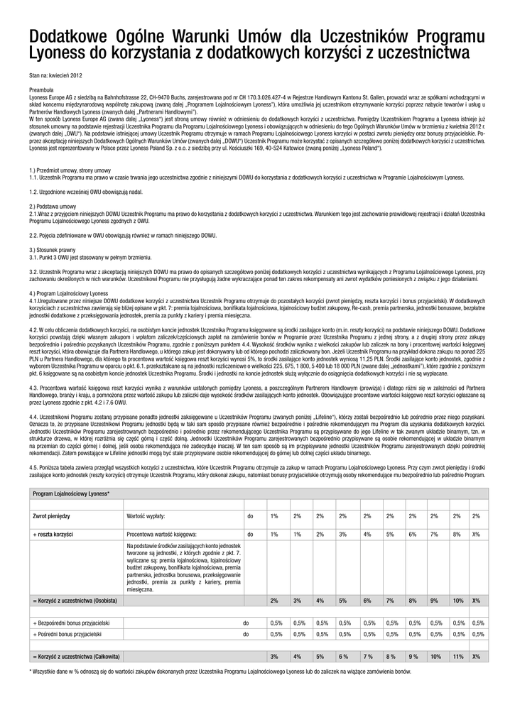 Dodatkowe Ogólne Warunki Umów dla Uczestników Programu Lyoness do korzystania z dodatkowych korzyści z uczestnictwa Stan na: kwiecień 2012 Preambuła Lyoness Europe AG z siedzibą na Bahnhofstrasse 22, CH-9470 Buchs, zarejestrowana pod nr CH 170.3.026.427-4 w Rejestrze Handlowym Kantonu St. Gallen, prowadzi wraz ze spółkami wchodzącymi w skład koncernu międzynarodową wspólnotę zakupową (zwaną dalej „Programem Lojalnościowym Lyoness”), która umożliwia jej uczestnikom otrzymywanie korzyści poprzez nabycie towarów i usług u Partnerów Handlowych Lyoness (zwanych dalej „Partnerami Handlowymi”). W ten sposób Lyoness Europe AG (zwana dalej „Lyoness“) jest stroną umowy również w odniesieniu do dodatkowych korzyści z uczestnictwa. Pomiędzy Uczestnikiem Programu a Lyoness istnieje już stosunek umowny na podstawie rejestracji Uczestnika Programu dla Programu Lojalnościowego Lyoness i obowiązujących w odniesieniu do tego Ogólnych Warunków Umów w brzmieniu z kwietnia 2012 r. (zwanych dalej „OWU“). Na podstawie istniejącej umowy Uczestnik Programu otrzymuje w ramach Programu Lojalnościowego Lyoness korzyści w postaci zwrotu pieniędzy oraz bonusy przyjacielskie. Poprzez akceptację niniejszych Dodatkowych Ogólnych Warunków Umów (zwanych dalej „DOWU“) Uczestnik Programu może korzystać z opisanych szczegółowo poniżej dodatkowych korzyści z uczestnictwa. Lyoness jest reprezentowany w Polsce przez Lyoness Poland Sp. z o.o. z siedzibą przy ul. Kościuszki 169, 40-524 Katowice (zwaną poniżej „Lyoness Poland“). 1.) Przedmiot umowy, strony umowy 1.1. Uczestnik Programu ma prawo w czasie trwania jego uczestnictwa zgodnie z niniejszymi DOWU do korzystania z dodatkowych korzyści z uczestnictwa w Programie Lojalnościowym Lyoness. 1.2. Uzgodnione wcześniej OWU obowiązują nadal. 2.) Podstawa umowy 2.1.Wraz z przyjęciem niniejszych DOWU Uczestnik Programu ma prawo do korzystania z dodatkowych korzyści z uczestnictwa. Warunkiem tego jest zachowanie prawidłowej rejestracji i działań Uczestnika Programu Lojalnościowego Lyoness zgodnych z OWU. 2.2. Pojęcia zdefiniowane w OWU obowiązują również w ramach niniejszego DOWU. 3.) Stosunek prawny 3.1. Punkt 3 OWU jest stosowany w pełnym brzmieniu. 3.2. Uczestnik Programu wraz z akceptacją niniejszych DOWU ma prawo do opisanych szczegółowo poniżej dodatkowych korzyści z uczestnictwa wynikających z Programu Lojalnościowego Lyoness, przy zachowaniu określonych w nich warunków. Uczestnikowi Programu nie przysługują żadne wykraczające ponad ten zakres rekompensaty ani zwrot wydatków poniesionych z związku z jego działaniami. 4.) Program Lojalnościowy Lyoness 4.1.Uregulowane przez niniejsze DOWU dodatkowe korzyści z uczestnictwa Uczestnik Programu otrzymuje do pozostałych korzyści (zwrot pieniędzy, reszta korzyści i bonus przyjacielski). W dodatkowych korzyściach z uczestnictwa zawierają się bliżej opisane w pkt. 7: premia lojalnościowa, bonifikata lojalnościowa, lojalnościowy budżet zakupowy, Re-cash, premia partnerska, jednostki bonusowe, bezpłatne jednostki dodatkowe z przeksięgowania jednostek, premia za punkty z kariery i premia miesięczna. 4.2. W celu obliczenia dodatkowych korzyści, na osobistym koncie jednostek Uczestnika Programu księgowane są środki zasilające konto (m.in. reszty korzyści) na podstawie niniejszego DOWU. Dodatkowe korzyści powstają dzięki własnym zakupom i wpłatom zaliczek/częściowych zapłat na zamówienie bonów w Programie przez Uczestnika Programu z jednej strony, a z drugiej strony przez zakupy bezpośrednio i pośrednio pozyskanych Uczestników Programu, zgodnie z poniższym punktem 4.4. Wysokość środków wynika z wielkości zakupów lub zaliczek na bony i procentowej wartości księgowej reszt korzyści, która obowiązuje dla Partnera Handlowego, u którego zakup jest dokonywany lub od którego pochodzi zaliczkowany bon. Jeżeli Uczestnik Programu na przykład dokona zakupu na ponad 225 PLN u Partnera Handlowego, dla którego ta procentowa wartość księgowa reszt korzyści wynosi 5%, to środki zasilające konto jednostek wyniosą 11,25 PLN. Środki zasilające konto jednostek, zgodnie z wyborem Uczestnika Programu w oparciu o pkt. 6.1. przekształcane są na jednostki rozliczeniowe o wielkości 225, 675, 1 800, 5 400 lub 18 000 PLN (zwane dalej „jednostkami”), które zgodnie z poniższym pkt. 6 księgowane są na osobistym koncie jednostek Uczestnika Programu. Środki i jednostki na koncie jednostek służą wyłącznie do osiągnięcia dodatkowych korzyści i nie są wypłacane. 4.3. Procentowa wartość księgowa reszt korzyści wynika z warunków ustalonych pomiędzy Lyoness, a poszczególnym Partnerem Handlowym (prowizja) i dlatego różni się w zależności od Partnera Handlowego, branży i kraju, a pomnożona przez wartość zakupu lub zaliczki daje wysokość środków zasilających konto jednostek. Obowiązujące procentowe wartości księgowe reszt korzyści ogłaszane są przez Lyoness zgodnie z pkt. 4.2 i 7.6 OWU. 4.4. Uczestnikowi Programu zostaną przypisane ponadto jednostki zaksięgowane u Uczestników Programu (zwanych poniżej „Lifeline“), którzy zostali bezpośrednio lub pośrednio przez niego pozyskani. Oznacza to, że przypisane Uczestnikowi Programu jednostki będą w taki sam sposób przypisane również bezpośrednio i pośrednio rekomendującym mu Program dla uzyskania dodatkowych korzyści. Jednostki Uczestników Programu zarejestrowanych bezpośrednio i pośrednio przez rekomendującego Uczestnika Programu są przypisywane do jego Lifeline w tak zwanym układzie binarnym, tzn. w strukturze drzewa, w której rozróżnia się część górną i część dolną. Jednostki Uczestników Programu zarejestrowanych bezpośrednio przypisywane są osobie rekomendującej w układzie binarnym na przemian do części górnej i dolnej, jeśli osoba rekomendująca nie zadecyduje inaczej. 