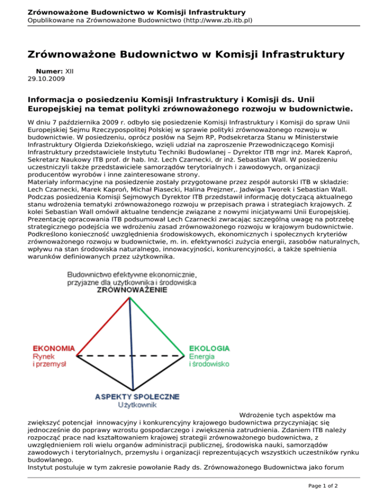 Zrównoważone Budownictwo w Komisji Infrastruktury Opublikowane na Zrównoważone Budownictwo (http://www.zb.itb.pl) Zrównoważone Budownictwo w Komisji Infrastruktury Numer: XII 29.10.2009 Informacja o posiedzeniu Komisji Infrastruktury i Komisji ds. Unii Europejskiej na temat polityki zrównoważonego rozwoju w budownictwie. W dniu 7 października 2009 r. odbyło się posiedzenie Komisji Infrastruktury i Komisji do spraw Unii Europejskiej Sejmu Rzeczypospolitej Polskiej w sprawie polityki zrównoważonego rozwoju w budownictwie. W posiedzeniu, oprócz posłów na Sejm RP, Podsekretarza Stanu w Ministerstwie Infrastruktury Olgierda Dziekońskiego, wzięli udział na zaproszenie Przewodniczącego Komisji Infrastruktury przedstawiciele Instytutu Techniki Budowlanej – Dyrektor ITB mgr inż. Marek Kaproń, Sekretarz Naukowy ITB prof. dr hab. Inż. Lech Czarnecki, dr inż. Sebastian Wall. W posiedzeniu uczestniczyli także przedstawiciele samorządów terytorialnych i zawodowych, organizacji producentów wyrobów i inne zainteresowane strony. Materiały informacyjne na posiedzenie zostały przygotowane przez zespół autorski ITB w składzie: Lech Czarnecki, Marek Kaproń, Michał Piasecki, Halina Prejzner,. Jadwiga Tworek i Sebastian Wall. Podczas posiedzenia Komisji Sejmowych Dyrektor ITB przedstawił informację dotyczącą aktualnego stanu wdrożenia tematyki zrównoważonego rozwoju w przepisach prawa i strategiach krajowych. Z kolei Sebastian Wall omówił aktualne tendencje związane z nowymi inicjatywami Unii Europejskiej. Prezentację opracowania ITB podsumował Lech Czarnecki zwracając szczególną uwagę na potrzebę strategicznego podejścia we wdrożeniu zasad zrównoważonego rozwoju w krajowym budownictwie. Podkreślono konieczność uwzględnienia środowiskowych, ekonomicznych i społecznych kryteriów zrównoważonego rozwoju w budownictwie, m. in. efektywności zużycia energii, zasobów naturalnych, wpływu na stan środowiska naturalnego, innowacyjności, konkurencyjności, a także spełnienia warunków definiowanych przez użytkownika. Wdrożenie tych aspektów ma zwiększyć potencjał innowacyjny i konkurencyjny krajowego budownictwa przyczyniając się jednocześnie do poprawy wzrostu gospodarczego i zwiększenia zatrudnienia. Zdaniem ITB należy rozpocząć prace nad kształtowaniem krajowej strategii zrównoważonego budownictwa, z uwzględnieniem roli wielu organów administracji publicznej, środowiska nauki, samorządów zawodowych i terytorialnych, przemysłu i organizacji reprezentujących wszystkich uczestników rynku budowlanego. Instytut postuluje w tym zakresie powołanie Rady ds. Zrównoważonego Budownictwa jako forum Page 1 of 2 Zrównoważone Budownictwo w Komisji Infrastruktury Opublikowane na Zrównoważone Budownictwo (http://www.zb.itb.pl) współpracy, merytorycznej dyskusji, weryfikacji i systemowej oceny postępów zrównoważenia. Krajowa strategia wpisująca się w politykę europejską będzie warunkiem efektywnego udziału w programach UE i możliwości kształtowania tej polityki przy uwzględnieniu krajowych priorytetów i uzyskaniu dla nich wsparcia w postaci instrumentów europejskich. Wdrożenie zasad oceny spełnienia kryteriów zrównoważonego rozwoju w odniesieniu do wyrobów i obiektów budowlanych będzie także narzędziem do stymulowania pożądanych zachowań rynku, sprzyjających: – zwiększeniu efektywności energetycznej obiektów budowlanych, – zmniejszeniu obciążeń środowiskowych powodowanych przez budownictwo, – zapewnieniu spełnienia wymagań funkcjonalnych użytkownika, – optymalizacji kosztów pełnego cyklu życia wyrobów i obiektów budowlanych. Podsekretarz Stanu w Ministerstwie Infrastruktury Olgierd Dziekoński zaprezentował szeroką gamę podejmowanych działań, z uwzględnieniem prac związanych z nowelizacją dyrektywy 2002/91/WE, a także projektem rozporządzenia zastępującego dyrektywę 89/106/EWG. Ministerstwo Infrastruktury planuje także działania w zakresie ustalenia optymalnej drogi wdrożenia zasad zrównoważonego rozwoju w budownictwie i identyfikacji narzędzi strategicznych. W dyskusji posłowie wyrażali obawy związane z przewidywanym podwyższeniem kosztów inwestycyjnych innowacyjnych rozwiązań mogących być problemem zarówno w przypadku inwestorów, wykonawców, konsumentów, jak i wytwórców komponentów, podkreślano także potrzebę ochrony rynku wewnętrznego. Zwracano uwagę na potrzebę upowszechniania wiedzy w zakresie zrównoważonego budownictwa, jednocześnie wskazując na możliwość rozpoczęcia programów pilotażowych finansowanych ze środków UE, mających weryfikować akceptację społeczną nowych rozwiązań. Podkreślano również potrzebę zastosowania szerokiego podejścia obejmującego pełen zakres gałęzi budownictwa. Posiedzenie połączonych Komisji Sejmu RP rozpoczyna dyskusję nad krajowymi działaniami związanymi z wdrożeniem zasad zrównoważonego rozwoju do budownictwa wskazując jednocześnie na potrzebę utworzenia strategii krajowej uwzględniającej szczególną rolę procesu konsultacji. mgr inż. Jadwiga Tworek dr inż. Sebastian Wall Instytut Techniki Budowlanej Adres URL źródła: http://www.zb.itb.pl/informator/zrownowazone-budownictwo-w-komisjiinfrastruktury Page 2 of 2 Powered by TCPDF (www.tcpdf.org)