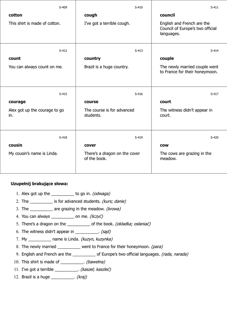 S-409 S-410 S-411 cotton cough council This shirt is made of cotton. I’ve got a terrible cough. English and French are the Council of Europe’s two official languages. S-412 S-413 S-414 count country couple You can always count on me. Brazil is a huge country. The newly married couple went to France for their honeymoon. S-415 S-416 S-417 courage course court Alex got up the courage to go in. The course is for advanced students. The witness didn’t appear in court. S-418 S-419 S-420 cousin cover cow My cousin’s name is Linda. There’s a dragon on the cover of the book. The cows are grazing in the meadow. Uzupełnij brakujące słowa: 1. Alex got up the __________ to go in. (odwaga) 2. The __________ is for advanced students. (kurs; danie) 3. The __________ are grazing in the meadow. (krowa) 4. You can always __________ on me. (liczyć) 5. There’s a dragon on the __________ of the book. (okładka; osłaniać) 6. The witness didn’t appear in __________. (sąd) 7. My __________ name is Linda. (kuzyn, kuzynka) 8. The newly married __________ went to France for their honeymoon. (para) 9. English and French are the __________ of Europe’s two official languages. (rada, narada) 10. This shirt is made of __________. (bawełna) 11. I’ve got a terrible __________. (kaszel; kaszleć) 12. Brazil is a huge __________. (kraj) S-411 S-410 S-409 rada, narada kaszel; kaszleć bawełna Angielski i francuski to dwa oficjalne języki Rady Europy. Mam okropny kaszel. Ta koszula jest (zrobiona) z bawełny. www.isel.edu.pl www.isel.edu.pl www.isel.edu.pl S-414 S-413 S-412 para kraj liczyć Nowożeńcy wyjechali w podróż poślubną do Francji. Brazylia to ogromny kraj. Zawsze możesz na mnie liczyć. www.isel.edu.pl www.isel.edu.pl www.isel.edu.pl S-417 S-416 S-415 sąd kurs; danie odwaga Świadek nie pojawił się w sądzie. Kurs jest dla zaawansowanych studentów. Alex zebrał się na odwagę, aby wejść do środka. www.isel.edu.pl www.isel.edu.pl www.isel.edu.pl S-420 S-419 S-418 krowa okładka; osłaniać kuzyn, kuzynka Krowy pasą się na łące. Na okładce książki jest smok. Moja kuzynka nazywa się Linda. www.isel.edu.pl Odpowiedzi: 1. courage 2. course 3. cows 4. count 5. cover 6. court 7. cousin’s 8. couple 9. Council 10. cotton 11. cough 12. country www.isel.edu.pl www.isel.edu.pl