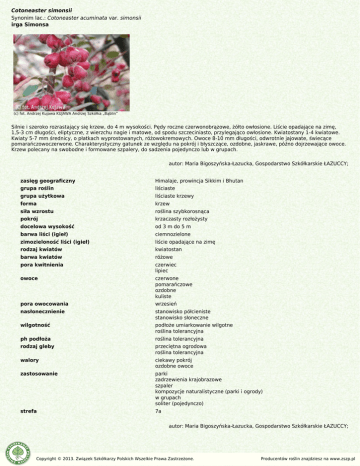 Cotoneaster simonsii Synonim lac.: Cotoneaster acuminata var. simonsii irga Simonsa (c) fot. Andrzej Kujawa KUJAWA Andrzej Szkółka „Bąblin” Silnie i szeroko rozrastający się krzew, do 4 m wysokości. Pędy roczne czerwonobrązowe, żółto owłosione. Liście opadające na zimę, 1,5-3 cm długości, eliptyczne, z wierzchu nagie i matowe, od spodu szczeciniasto, przylegająco owłosione. Kwiatostany 1-4 kwiatowe. Kwiaty 5-7 mm średnicy, o płatkach wyprostowanych, różowokremowych. Owoce 8-10 mm długości, odwrotnie jajowate, świecące pomarańczowoczerwone. Charakterystyczny gatunek ze względu na pokrój i błyszczące, ozdobne, jaskrawe, późno dojrzewające owoce. Krzew polecany na swobodne i formowane szpalery, do sadzenia pojedynczo lub w grupach. autor: Maria Bigoszyńska-Łazucka, Gospodarstwo Szkółkarskie ŁAZUCCY; zasięg geograficzny Himalaje, prowincja Sikkim i Bhutan grupa roślin liściaste grupa użytkowa liściaste krzewy forma krzew siła wzrostu roślina szybkorosnąca pokrój krzaczasty rozłożysty docelowa wysokość od 3 m do 5 m barwa liści (igieł) ciemnozielone zimozieloność liści (igieł) liście opadające na zimę rodzaj kwiatów kwiatostan barwa kwiatów różowe pora kwitnienia czerwiec lipiec owoce czerwone pomarańczowe ozdobne kuliste pora owocowania wrzesień nasłonecznienie stanowisko półcieniste stanowisko słoneczne wilgotność podłoże umiarkowanie wilgotne roślina tolerancyjna ph podłoża roślina tolerancyjna rodzaj gleby przeciętna ogrodowa roślina tolerancyjna walory ciekawy pokrój ozdobne owoce zastosowanie parki zadrzewienia krajobrazowe szpaler kompozycje naturalistyczne (parki i ogrody) w grupach soliter (pojedynczo) strefa 7a autor: Maria Bigoszyńska-Łazucka, Gospodarstwo Szkółkarskie ŁAZUCCY; Copyright © 2013. Związek Szkółkarzy Polskich Wszelkie Prawa Zastrzeżone. Producentów roślin znajdziesz na www.zszp.pl