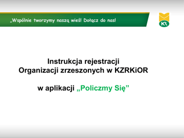 „Wspólnie tworzymy naszą wieś! Dołącz do nas! Instrukcja rejestracji Organizacji zrzeszonych w KZRKiOR w aplikacji „Policzmy Się” Strona startowa Opcję „Zarejestruj się” wybierają osoby które: nie mają jeszcze konta na portalu mojeKGW nie otrzymały drogą listowną indywidualnego loginu i hasła Opcję „Zaloguj się” wybierają osoby które: dokonały rejestracji, posiadają już login i hasło otrzymały drogą listowną indywidualny login i hasło – w takim przypadku podczas pierwszego zalogowania, prosimy o zweryfikowanie i/lub uzupełnienie brakujących danych na koncie użytkownika Strona startowa – wybór rejestrowanego podmiotu – Organizacji lub Członka Organizację może zarejestrować tylko osoba ją reprezentująca w statucie lub KRS-ie Zarejestruj się jako członek w najniższej organizacji do jakiej należysz. Nawet będąc prezesem Regionalnego Związku, jesteś również w KR lub KGW i właśnie tam się dopisz się jako członek! Instrukcja rejestracji Organizacji Formularz rejestracyjny – Krok 1 „Wybierz lokalizacje” Po naciśnięciu strzałki znajdującej się po prawej stronie pola, pojawi się lista Organizacji np. Kółko Rolnicze (KR) lub Koło Gospodyń Wiejskich (KGW). Wybierz z listy swoją Organizację Uzupełnij pole Kod pocztowy a pozostałe pola: Gmina, Powiat, Region KZRKiOR uzupełnią się automatycznie. W polu Miejscowość wybierz swoją miejscowość z listy. UWAGA: Region KZRKIOR odzwierciedla strukturę związkową i odpowiada podziałowi na 49 starych województw. Formularz rejestracyjny – Krok 2 „Uzupełnij Dane” W polu „Nazwa własna organizacji” wpisujemy jej nazwę np. KGW Jaskółki. W przypadku braku nazwy własnej wpisujemy nazwę organizacji + miasto z jakiego pochodzi np. GZRKiOR w Miechowie/KGW w Starachowicach. Uzupełnij dokładnie wszystkie pola formularza. Jeżeli Twoja Organizacja nie posiada jeszcze nr KRS, NIP czy adresu e-mail pozostaw pole puste. Część pól jest obowiązkowa – jeżeli nie zostaną uzupełnione, na ekranie pojawi się komunikat „Pole jest wymagalne” Formularz rejestracyjny – Krok 2 „Uzupełnij Dane cd…” W tym polu podaj dane osoby upoważnionej do reprezentowania Twojej Organizacji (Przewodnicząca(y), Prezes) zgodnie ze Statutem Twojej Organizacji lub wpisem do KRS(dla organizacji które posiadają wpis) W tym polu podaj obowiązkowo nr telefonu komórkowego, na który otrzymasz SMS z kodem aktywującym Twoje konto. Formularz rejestracyjny – Krok 3 „Organizacja nadrzędna” Wybierz z listy rodzaj Organizacji Zrzeszającej w KZRKiOR, w której jest zrzeszona Twoja Organizacja Podaj nazwę tej Organizacji lub wybierz z rozwijanej listy Wybierz tę opcję, jeżeli nie wiesz gdzie jest zrzeszona Twoja organizacja. My to sprawdzimy i skontaktujemy się z Tobą! Formularz rejestracyjny – Krok 4 „Aktywacja konta” Po prawidłowym wypełnieniu formularza, na Twój numer telefonu komórkowego (podany w danych osoby rejestrującej), wyślemy SMS z kodem aktywującym Twoje konto. Wpisz otrzymany Kod aktywacyjny i przejdź DALEJ. Po chwili otrzymasz kolejny SMS z loginem i hasłem do Twojego konta. Instrukcja rejestracji Członka Formularz rejestracyjny Członka - Krok 1 „Dane członka” Wybierz i wpisz dowolny Login (minimum 6 znaków), którego będziesz używać przy logowaniu. W tym polu podaj obowiązkowo nr telefonu komórkowego, na który otrzymasz SMS-em kod aktywujący konto użytkownika. Wybierz z listy szczebel organizacji do której należysz Wybierz konkretną nazwę organizacji do której należysz. Jeżeli Twoja organizacja się już zarejestrowała, znajdziesz ją w rozwijanej liście, jeżeli jej nie ma, wpisz ją ręcznie np. KGW Moszczenica. Formularz rejestracyjny członka - „Aktywacja konta” Po prawidłowym wypełnieniu Formularza, na Twój numer telefonu komórkowego wyślemy SMS-em kod aktywujący Twoje konto. Wpisz otrzymany ciąg znaków w pole Kod aktywacyjny i przejdź DALEJ. Po chwili otrzymasz kolejny SMS z loginem i hasłem do Twojego konta. Instrukcja rejestracji członka przez przewodniczącego organizacji Rejestracja członka przez przewodniczącego/ą 1 Po zalogowaniu na konto organizacji, najedź na pole „Lista członków” i kliknij lewym klawiszem myszy 2 Kliknij klawisz „Dodaj”. Formularz rejestracyjny Członka - „Dane członka” Wybierz i wpisz dowolny Login (minimum 6 znaków), którego będzie używał członek przy logowaniu. Login ten będzie wysłany wiadomością SMS do członka. W tym polu podaj obowiązkowo nr telefonu komórkowego rejestrowanego członka, na który otrzyma SMS z kodem aktywującym jego konto. Kliknij „Zapisz” i gotowe Formularz rejestracyjny członka - „Aktywacja konta” Po prawidłowym wypełnieniu Formularza, na numer telefonu komórkowego rejestrowanego członka wyślemy SMS z kodem aktywującym jego konto.