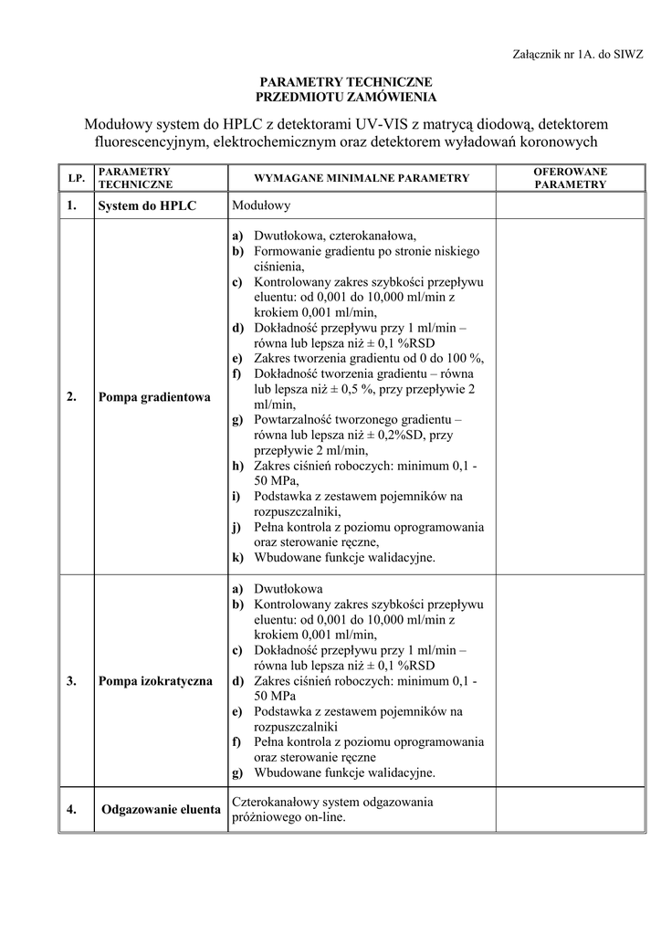 Załącznik nr 1A. do SIWZ PARAMETRY TECHNICZNE PRZEDMIOTU ZAMÓWIENIA Modułowy system do HPLC z detektorami UV-VIS z matrycą diodową, detektorem fluorescencyjnym, elektrochemicznym oraz detektorem wyładowań koronowych LP. PARAMETRY TECHNICZNE 1. System do HPLC Modułowy Pompa gradientowa a) Dwutłokowa, czterokanałowa, b) Formowanie gradientu po stronie niskiego ciśnienia, c) Kontrolowany zakres szybkości przepływu eluentu: od 0,001 do 10,000 ml/min z krokiem 0,001 ml/min, d) Dokładność przepływu przy 1 ml/min – równa lub lepsza niŜ ± 0,1 %RSD e) Zakres tworzenia gradientu od 0 do 100 %, f) Dokładność tworzenia gradientu – równa lub lepsza niŜ ± 0,5 %, przy przepływie 2 ml/min, g) Powtarzalność tworzonego gradientu – równa lub lepsza niŜ ± 0,2%SD, przy przepływie 2 ml/min, h) Zakres ciśnień roboczych: minimum 0,1 50 MPa, i) Podstawka z zestawem pojemników na rozpuszczalniki, j) Pełna kontrola z poziomu oprogramowania oraz sterowanie ręczne, k) Wbudowane funkcje walidacyjne. 3. Pompa izokratyczna a) Dwutłokowa b) Kontrolowany zakres szybkości przepływu eluentu: od 0,001 do 10,000 ml/min z krokiem 0,001 ml/min, c) Dokładność przepływu przy 1 ml/min – równa lub lepsza niŜ ± 0,1 %RSD d) Zakres ciśnień roboczych: minimum 0,1 50 MPa e) Podstawka z zestawem pojemników na rozpuszczalniki f) Pełna kontrola z poziomu oprogramowania oraz sterowanie ręczne g) Wbudowane funkcje walidacyjne. 4. Odgazowanie eluenta Czterokanałowy system odgazowania próŜniowego on-line. 2. WYMAGANE MINIMALNE PARAMETRY OFEROWANE PARAMETRY a) Na minimum 100 próbek po 2 ml, b) Zakres nastrzykiwanej próbki od 0,1ul do 100 ul – strzykawka standardowa lub od 0,1 ul do 2500 ul przy zmianie strzykawki, c) Precyzja nastrzyku nie gorsza niŜ 0,3% RSD dla nastrzyku 5 µl, d) Pełna kontrola z poziomu oprogramowania, e) MoŜliwość podawania próby o róŜnej objętości, f) MoŜliwość wielokrotnego powtórzenia nastrzyku z jednej fiolki, g) Carryover: <0.005% , h) Wbudowane funkcje walidacyjne, i) Pełna kontrola z poziomu oprogramowania oraz sterowanie ręczne. 5. Autosampler 6. a) Termostat do kolumn na min. 6 kolumn o długości do 30 cm, b) Chłodzenie i grzanie w zakresie min. +5 do +85 oC, c) Stabilność temperatury: min. +/-0,1 °C, d) Precyzja ustawienia temperatury: min. +/0,1 °C, Termostat do kolumn e) Dokładność temperatury: ±0.5 °C, f) MoŜliwość ustawienia gradientu temperaturowego, g) Wbudowane funkcje walidacyjne, h) Pełna kontrola z poziomu oprogramowania oraz sterowanie ręczne. 7. Detoktor UV-VIS z matrycą diodową a) Zakres długości fali co najmniej 190-800nm b) Ilość elementów światłoczułych: min. 1024 c) -źródło światła: lampy deuterowa i wolframowa d) Dokładność długości fali: ±1.0 nm, e) Kalibracja liniami D2, weryfikacja poprzez wbudowany filtr z tlenku holmu f) Szum linii podstawowej: ≤ 1 x 10־5 AU (pik/pik) przy 254 nm,. g) Dryf sygnału: ≤ 1 x 10־3 AU/h przy 254 nm h) Cela analityczna przepływowa – długość drogi optycznej ≤ 10 mm; objętość celki ≤ 13 ul i) Kontrola pracy detektora z poziomu oprogramowania Detektor fluorescencyjny a) źródło światła 150 W, lampa ksenonowa, b) zakres EX 200 - 650 nm, c) zakres EM 200 - 650 nm, d) szerokość spektralna 15 nm, e) dokładność nastawy długości fali ± 2 nm, f) powtarzalność nastawy długości fali ± 0.2 nm, g) objętość celki do 12 ul, max. ciśnienie 20 bar, h) czułość - stosunek sygnału do szumów >300 dla linii Ramana dla wody, i) biblioteka widm - moŜliwość rejestracji widm, tworzenia biblioteki widm oraz jej przeszukiwania, j) Identyfikacja związków: poprzez obliczanie współczynników dopasowania. Detektor wyładowań koronowych a) Aerozol wyładowań koronowych, b) Nebulizacja w temperaturze otoczenia, c) Odpowiedz detektora: niezaleŜna od budowy chemicznej, d) Zakres przepływu fazy ruchomej: do 2 ml/min, e) Gaz: azot, f) Ciśnienie gazu 2.4 bara, g) Czułość – poniŜej 10 ng , h) Zakres sygnału przynajmniej 10 pA do 300 pA., i) MoŜliwość oznaczeń ilościowych w szerokim zakresie stęŜeń , j) MoŜliwość pracy w gradiencie. 10. Cyfrowy detektor elektrochemiczny a) Pracujący w trybie przewodnościowym w zakresie od 0,01 do 3000 µS, b) Pracujący w trybie zintegrowanej amperometrii pulsowej w zakresie od 50 pC do 200 µC, c) Praca w trybie amperometrii stałoprądowej w zakresie od 50 pA do 300 µA, d) Cela amperometryczna trójelektrodowa z wymienną złotą elektrodą roboczą, e) Objętość celi (elektroda robocza) < 0,5µl. 11. Wstrzykiwacz ręczny Wykonany z materiału inertnego 12. Do analizy mono- i disacharydów: a) wykonanie z PEEK-u, Kolumna analityczna b) kompatybilna z fazami ruchomymi o pH w (4x250mm) wraz z zakresie 0-14, kolumną ochronną c) pojemność: 1450 µeq, (4x50mm) d) wypełnienie: ziarno: 7,5 µm, sieciowanie: 15%. 8. 9. 13. 14. 15. Do analizy oligosacharydów: a) wykonanie z PEEK-u, Kolumna analityczna b) kompatybilna z fazami ruchomymi o pH w zakresie 0-14 oraz rozpuszczalnikami (4x250mm) wraz z organicznymi, kolumną ochronną c) pojemność: 90 µeq, (4x50mm) d) wypełnienie: ziarno: 8,5µm, sieciowanie: 55%. Zestaw uruchomieniowy Oprogramowanie Złączki, nakrętki, kapilary, bezpieczniki, kable itp. konieczne do połączenia ze sobą poszczególnych elementów zestawu i uruchomienia chromatografu. a) Pracujące pod systemem operacyjnym Microsoft Windows XP lub Windows Vista, b) oprogramowanie typu klient-serwer , c) Kontrola wszystkich modułów chromatografu, d) Wbudowana baza danych, e) Wbudowany moduł tworzenia raportów, f) Wbudowany moduł zarządzania uŜytkownikami i ich uprawnieniami, g) elektroniczny podpis zgodnie z normą 21 CFR 11, h) Automatyczne monitorowanie wszelkich operacji wykonanych na systemie, zmian oraz ich autorzy, i) Wbudowane procedury kwalifikacji IQ, OQ/PQ. a) Kolumna chromatograficzna typu Hypercarb lub równowaŜna o wymiarach 100 x 4.6mm