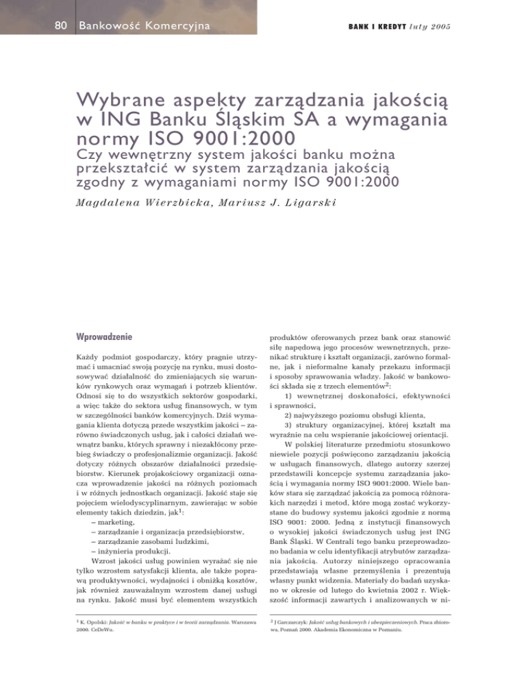 80 BankowoÊç Komercyjna BANK I KREDYT l u t y 2 0 0 5 Wybrane aspekty zarzàdzania jakoÊcià w ING Banku Âlàskim SA a wymagania normy ISO 9001:2000 Czy wewn´trzny system jakoÊci banku mo˝na przekszta∏ciç w system zarzàdzania jakoÊcià zgodny z wymaganiami normy ISO 9001:2000 M a g d a l e n a Wi e rz b i c k a , M a r i u s z J . L i g a r s k i Wprowadzenie Ka˝dy podmiot gospodarczy, który pragnie utrzymaç i umacniaç swojà pozycj´ na rynku, musi dostosowywaç dzia∏alnoÊç do zmieniajàcych si´ warunków rynkowych oraz wymagaƒ i potrzeb klientów. Odnosi si´ to do wszystkich sektorów gospodarki, a wi´c tak˝e do sektora us∏ug finansowych, w tym w szczególnoÊci banków komercyjnych. DziÊ wymagania klienta dotyczà przede wszystkim jakoÊci – zarówno Êwiadczonych us∏ug, jak i ca∏oÊci dzia∏aƒ wewnàtrz banku, których sprawny i niezak∏ócony przebieg Êwiadczy o profesjonalizmie organizacji. JakoÊç dotyczy ró˝nych obszarów dzia∏alnoÊci przedsi´biorstw. Kierunek projakoÊciowy organizacji oznacza wprowadzenie jakoÊci na ró˝nych poziomach i w ró˝nych jednostkach organizacji. JakoÊç staje si´ poj´ciem wielodyscyplinarnym, zawierajàc w sobie elementy takich dziedzin, jak1: – marketing, – zarzàdzanie i organizacja przedsi´biorstw, – zarzàdzanie zasobami ludzkimi, – in˝ynieria produkcji. Wzrost jakoÊci us∏ug powinien wyra˝aç si´ nie tylko wzrostem satysfakcji klienta, ale tak˝e poprawà produktywnoÊci, wydajnoÊci i obni˝kà kosztów, jak równie˝ zauwa˝alnym wzrostem danej us∏ugi na rynku. JakoÊç musi byç elementem wszystkich produktów oferowanych przez bank oraz stanowiç si∏´ nap´dowà jego procesów wewn´trznych, przenikaç struktur´ i kszta∏t organizacji, zarówno formalne, jak i nieformalne kana∏y przekazu informacji i sposoby sprawowania w∏adzy. JakoÊç w bankowoÊci sk∏ada si´ z trzech elementów2: 1) wewn´trznej doskona∏oÊci, efektywnoÊci i sprawnoÊci, 2) najwy˝szego poziomu obs∏ugi klienta, 3) struktury organizacyjnej, której kszta∏t ma wyraênie na celu wspieranie jakoÊciowej orientacji. W polskiej literaturze przedmiotu stosunkowo niewiele pozycji poÊwi´cono zarzàdzaniu jakoÊcià w us∏ugach finansowych, dlatego autorzy szerzej przedstawili koncepcje systemu zarzàdzania jakoÊcià i wymagania normy ISO 9001:2000. Wiele banków stara si´ zarzàdzaç jakoÊcià za pomocà ró˝norakich narz´dzi i metod, które mogà zostaç wykorzystane do budowy systemu jakoÊci zgodnie z normà ISO 9001: 2000. Jednà z instytucji finansowych o wysokiej jakoÊci Êwiadczonych us∏ug jest ING Bank Âlàski. W Centrali tego banku przeprowadzono badania w celu identyfikacji atrybutów zarzàdzania jakoÊcià. Autorzy niniejszego opracowania przedstawiajà w∏asne przemyÊlenia i prezentujà w∏asny punkt widzenia. Materia∏y do badaƒ uzyskano w okresie od lutego do kwietnia 2002 r. Wi´kszoÊç informacji zawartych i analizowanych w ni- 1 K. Opolski: JakoÊç w banku w praktyce i w teorii zarzàdzania. Warszawa 2 J Garczarczyk: JakoÊç us∏ug bankowych i ubezpieczeniowych. Praca zbioro- 2000. CeDeWu. wa, Poznaƒ 2000. Akademia Ekonomiczna w Poznaniu. BANK I KREDYT l u t y 2 0 0 5 niejszym opracowaniu pochodzi z dokumentów wewn´trznych, udost´pnionych za zgodà w∏adz Banku, i wywiadów z pracownikami Centrali ING Banku Âlàskiego w Katowicach. Analizy dokonano wg stanu na 1 czerwca 2002 r. Autorzy niniejszej publikacji nie byli bezpoÊrednio zwiàzani z ING Bankiem Âlàskim. Analiza jest wynikiem ich inicjatywy i zgody w∏adz badanej instytucji. Stosowanie normy ISO jest ca∏kowicie dobrowolne. System jakoÊci zgodny z wymaganiami normy jest potwierdzony certyfikatem, który staje si´ swego rodzaju wizytówkà majàcej go organizacji. Jak ka˝da organizacja deklarujàca ukierunkowanie na klienta, podejmuje ona pewne kroki w celu doskonalenia zarówno produktów (ich przydatnoÊç dla odbiorców), jak i sposobu obs∏ugi klientów. Dlatego analizie poddano procesy zachodzàce w Banku pod kàtem jakoÊciowego zarzàdzania procesami. Identyfikujàc atrybuty zarzàdzania jakoÊcià, wskazano najbardziej znaczàce jednostki zaanga˝owane w osiàganie celów projakoÊciowych, a tak˝e ich wp∏yw na kszta∏towanie jakoÊci w instytucji, na której rzecz pracujà. Przedmiotem rozwa˝aƒ jest tak˝e zarzàdzanie zasobami ludzkimi, w tym system motywacji pracowników, i sposób kszta∏towania kultury organizacyjnej jako czynniki „jakoÊciotwórczych”. Poprzez analiz´ uzyskanych informacji i danych podj´to prób´ diagnozy i oceny elementów zarzàdzania jakoÊcià w ING Banku Âlàskiem w konfrontacji z wymaganiami normy ISO 9001:2000. W badaniach pos∏u˝ono si´ metodà porównaƒ, analizujàc zalecenia normy i obecne przygotowanie Banku do ich spe∏nienia. Starano si´ tak˝e zaprezentowaç, w jaki sposób organizacja dà˝y do ciàg∏ego Êwiadczenia us∏ug spe∏niajàcych oczekiwania klienta i wymagania prawne, jak równie˝ do zwi´kszenia zadowolenia klienta. Elementy te charakteryzujà bowiem zakres stosowania normy ISO 9001:2000. Dane pochodzàce z Banku pogrupowano wed∏ug zagadnieƒ tematycznych na podstawie rozdzia∏ów normy ISO 9001:2000 – Wymagania. Dodatkowym zagadnieniem jest podejÊcie procesowe do zarzàdzania jakoÊcià, gdy˝ stanowi ono element przewodni wymagaƒ normy. Sam Bank nigdy nie rozpatrywa∏ mo˝liwoÊci wprowadzenia systemu zarzàdzania jakoÊcià wed∏ug normy ISO 9001. Konkurencja i tendencje na rynku us∏ug bankowych wskazujà, ˝e mo˝e to byç tematem rozwa˝aƒ w∏adz Banku w przysz∏oÊci. Narz´dziem budowy systemu zarzàdzania jakoÊcià w dowolnej organizacji, w tym w bankowoÊci, jest norma ISO 9001:2000. Opublikowana 15 grudnia 2000 r. nowa edycja norm ISO serii 9000, której pierwsze wydanie ukaza∏o si´ w 1987 r., a której geneza si´ga lat 30. XX wieku, charakteryzuje si´ podejÊciem procesowym. I