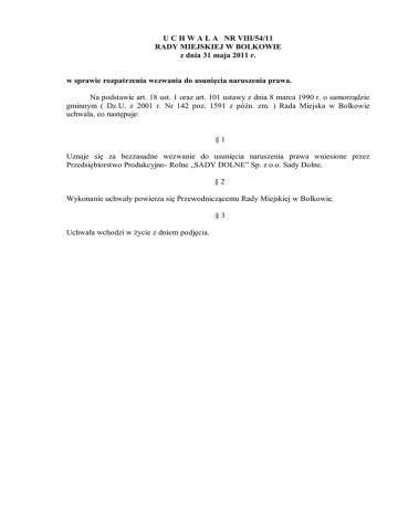 U C H W A Ł A NR VIII/54/11 RADY MIEJSKIEJ W BOLKOWIE z dnia 31 maja 2011 r. w sprawie rozpatrzenia wezwania do usunięcia naruszenia prawa. Na podstawie art. 18 ust. 1 oraz art. 101 ustawy z dnia 8 marca 1990 r. o samorządzie gminnym ( Dz.U. z 2001 r. Nr 142 poz. 1591 z późn. zm. ) Rada Miejska w Bolkowie uchwala, co następuje: §1 Uznaje się za bezzasadne wezwanie do usunięcia naruszenia prawa wniesione przez Przedsiębiorstwo Produkcyjno- Rolne „SADY DOLNE” Sp. z o.o. Sady Dolne. §2 Wykonanie uchwały powierza się Przewodniczącemu Rady Miejskiej w Bolkowie. §3 Uchwała wchodzi w życie z dniem podjęcia. UZASADNIENIE W dniu 12 maja 2011 r. do Urzędu Miejskiego w Bolkowie wpłynęło pismo Przedsiębiorstwa Produkcyjno-Rolnego „SADY DOLNE” Sp. z o.o. Sady Dolne wzywające Radę Miejską w Bolkowie do usunięcia naruszenia prawa w trybie art. 101 ust. 1 ustawy o samorządzie gminnym. W ocenie wzywającego naruszenie prawa nastąpiło podczas XLIX sesji Rady Miejskiej w Bolkowie, która odbyła się w dniu 27.08.2010 r. poprzez podjęcie następujących uchwał: 1. uchwała nr XLIX/346/10 w sprawie uchwalenia zmiany studium uwarunkowań i kierunków zagospodarowania przestrzennego Gminy Bolków, 2. uchwała nr XLIX/347/10 w sprawie uchwalenia miejscowego planu zagospodarowania przestrzennego dla strefy aktywności gospodarczej w rejonie kopalni diabazu ze złoża Sady I w gminie Bolków, 3. uchwała nr XLIX/348/10 w sprawie uchwalenia miejscowego planu zagospodarowania przestrzennego dla rejonu kopalni diabazu ze złoża Sady I w gminie Bolków. Wezwanie do usunięcia naruszenia prawa nie zasługuje na uwzględnienie z następujących powodów: Z mocy art. 3 ustawy o planowaniu i zagospodarowaniu przestrzennym z dnia 27 marca 2003 r. ( Dz.U. Nr 80, poz. 717 z późn. zm.) kształtowanie i prowadzenie polityki przestrzennej na terenie gminy, w tym uchwalanie studium uwarunkowań i kierunków zagospodarowania przestrzennego gminy oraz miejscowych planów zagospodarowania przestrzennego, należy do zadań gminy i to gmina decyduje o przeznaczeniu terenów w planach zagospodarowania przestrzennego. W przedmiotowej sprawie procedura zmiany studium i planu zagospodarowania przestrzennego Gminy Bolków w zakresie rejonu kopalni diabazu w Sadach Dolnych rozpoczęta została zgodnie z wolą radnych, którzy na sesji w dniu 30 maja 2008 r. jednogłośnie podjęli uchwałę o przystąpieniu do sporządzenia zmiany studium uwarunkowań i kierunków zagospodarowania przestrzennego Gminy Bolków oraz uchwałę w sprawie przystąpienia do sporządzenia zmiany miejscowego planu zagospodarowania przestrzennego gminy Bolków. Procedura ta przeprowadzona została zgodnie z obowiązującymi przepisami, a Rada Miejska w Bolkowie uchwalając w dniu 27 sierpnia 2010 r. zmianę studium uwarunkowań i kierunków zagospodarowania przestrzennego oraz miejscowy plan zagospodarowania przestrzennego dla strefy aktywności gospodarcze oraz dla rejonu kopalni diabazu działała w oparciu o przepisy prawa i w granicach własnych kompetencji. Przyjęte w/w uchwałami zmiana studium oraz miejscowy plan zagospodarowania przestrzennego ustosunkowują się do każdego zagadnienia wymienionego w art. 11 i 15 ust. 2 pkt 1-12 powołanej wyżej ustawy, przez co wyczerpują wymagania ustawowe w tym zakresie. Postępowanie planistyczne, w tym i konsultacje społeczne, przeprowadzone zostało zgodnie z wszelkimi wymogami określonymi przepisami prawa. Należy wyraźnie podkreślić, iż przy rozpatrywaniu studium i planu wzięte zostały pod uwagę wszystkie zgłoszone do niego protesty oraz uwagi. Bez rozpatrzenia pozostały jedynie pisma wniesione z pominięciem procedury planistycznej. Niezgodne z treścią protokołu z przytoczonej wyżej sesji Rady Miejskiej w Bolkowie, jak również z jej przebiegiem, jest stwierdzenie wzywającego, jakoby radny Marek Kwiatkowski złożył merytoryczny wniosek „o przygotowanie uchwały Rady Miejskiej w sprawie przeprowadzenia referendum lokalnego, w którym mieszkańcy Gminy Bolków mieliby odpowiedzieć na pytanie: Czy w Sadach Dolnych ma powstać kamieniołom?”. Jak wynika z treści protokołu z sesji z dnia 27 sierpnia 2010 r. str. 18 radny Marek Kwiatkowski zgłosił wniosek „o referendum w sprawie budowy kopalni dla mieszkańców Sady Dolne, Wolbromek, Bolków”. Tak więc zarzut nieprzegłosowania stawiany jest wobec sytuacji, która nie miała miejsca. Niezależnie od powyższego Rada Miejska w Bolkowie wskazuje również, iż szczegółowe zasady i tryb przeprowadzania referendum lokalnego określone zostały w ustawie z dnia 15 września 2000 r. o referendum lokalnym. W zapisie art. 4 tej ustawy określono w sposób wyczerpujący podmioty, które mają prawo zainicjować bądź wnioskować o przeprowadzenie referendum lokalnego. Są to wyłącznie: organ stanowiący danej jednostki samorządu terytorialnego i mieszkańcy tej jednostki. Żaden inny podmiot - poza wyraźnie wskazanymi w ustawie - nie posiada inicjatywy w zakresie przeprowadzenia referendum lokalnego i nie występując w imieniu mieszkańców, nie może skutecznie wszcząć postępowania zamierzającego do przeprowadzenia referendum. W szczególności uprawnienia takiego nie posiada radny, ani jakikolwiek organ władzy czy administracji państwowej, albo działająca we własnym imieniu partia polityczna czy organizacja społeczna. Wzywający wydaje się nie rozróżniać pojęcia "inicjatywy uchwałodawczej" od czynności technicznych, jakim jest przygotowanie projektu stosownej uchwały. Inicjatywą uchwałodawczą w odniesieniu do organów jednostek samorządu terytorialnego jest bowiem uprawnienie określonego podmiotu do przedłożenia projektu uchwały radzie gminy. Na wnioskodawcy ciąży również obowiązek przygotowania projektu uchwały. Uprawnienie, o którym mowa powyżej, nie polega - jakby to wynikało z treści wezwania - na sporządzeniu projektu stosownej uchwały na wniosek 