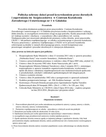 Polityka ochrony dzieci przed krzywdzeniem przez dorosłych i zapewnienia im bezpieczeństwa w Centrum Kształcenia Zawodowego i Ustawicznego nr 1 w Gdańsku Preambuła Wszystkim działaniom podjętym przez pracowników Centrum Kształcenia Zawodowego i ustawicznego nr 1 w Gdańsku przyświeca troska o bezpieczeństwo i ochronę dobra dziecka, ze szczególnym zwróceniem uwagi na jego potrzeby. Każdy pracownik CKZiU nr1 traktuje uczniów i słuchaczy z szacunkiem i dba o prawidłowy ich rozwój. Niedopuszczalne jest stosowanie jakiejkolwiek przemocy wobec dziecka przez pracownika CKZiU 1 lub partnera współpracującego ze szkołą a uczestniczącego w procesie kształcenia . Wszyscy pracownicy i partnerzy współpracujący z CKZiU nr1w procesie kształcenia zobowiązani są działać w ramach obowiązującego prawa, swoich kompetencji oraz przestrzegać zarządzeń i procedur określonych w niniejszym dokumencie. Akty prawne na których oparta jest polityka: 1. Rozporządzenie Rady Ministrów z dnia 13 września 2011 roku w sprawie procedury „Niebieskie Karty” oraz wzorów formularzy „Niebieska Karta”; 2. Ustawa o przeciwdziałaniu przemocy w rodzinie z dnia 29 lipca 2005 roku, artykuł 12; 3. Ustawa z dnia 26 stycznia 1982 roku- Karta Nauczyciela, pkt 1 art.6; 4. Rozporządzenie Ministra Edukacji Narodowej z dnia 2 sierpnia 2013 r. zmieniające rozporządzenie w sprawie warunków organizowania kształcenia, wychowania i opieki dla dzieci i młodzieży niepełnosprawnych oraz niedostosowanych społecznie w przedszkolach, szkołach i oddziałach ogólnodostępnych lub integracyjnych 5. Ustawa o systemie oświaty 6. Ustawa z dnia 26 października 1882 roku o postępowaniu w sprawach nieletnich 7. Kodeksu postępowania karnego – art. 304, Kodeksu karnego – art.162, 8. Konwencja o Prawach Dziecka przyjęta przez Zgromadzenie Ogólne Narodów Zjednoczonych dnia 20 listopada 1989 r. [Dz.U. z 1991 r. Nr 120, poz. 526] 9. Uchwała Rady Ministrów nr 130/2014 z dnia 8 lipca 2014 roku – rządowy program na lata 2014-2016 „Bezpieczna i przyjazna szkoła” Rozdział I Objaśnienie terminów 1. Pracownikiem placówki jest osoba zatrudniona na podstawie umowy o pracę, umowy o dzieło, umowy zlecenia, umowy wolontariackiej. 2. Partnerem współpracującym ze szkołą – pracodawcy u których uczeń ma praktyki 3. Dzieckiem jest każda osoba do ukończenia 18 roku życia. 4. Opiekunem dziecka jest osoba uprawniona do reprezentacji i stanowieniu o dziecku w szczególności jego przedstawiciel ustawowy (rodzic/opiekun prawny ). 5. Zgoda opiekuna dziecka oznacza zgodę co najmniej jednego z opiekunów dziecka. Gdy brak porozumienia między opiekunami dziecka, należy poinformować ich o konieczności rozstrzygnięcia sprawy przez sąd. 6. Przez krzywdzenie dziecka należy rozumieć popełnienie czynu zabronionego na szkodę dziecka 1 przez jakąkolwiek osobę. Krzywdzeniem jest: Przemoc fizyczna- jest to celowe uszkodzenie ciała, zadawanie bólu lub groźba uszkodzenia ciała. Skutkiem przemocy fizycznej mogą być złamania, siniaki, rany cięte, poparzenia, obrażenia wewnętrzne. Przemoc emocjonalna - to powtarzające się poniżanie, upokarzanie i ośmieszanie dziecka, wciąganie dziecka w konflikt osób dorosłych, manipulowanie nim, brak odpowiedniego wsparcia, stawianie dziecku wymagań i oczekiwań, którym nie jest ono w stanie sprostać. Przemoc seksualna - to angażowanie dziecka w aktywność seksualną przez osobę dorosłą. Wykorzystywanie seksualne odnosi się do zachowań z kontaktem fizycznym (np. dotykanie dziecka, współżycie z dzieckiem) oraz zachowania bez kontaktu fizycznego (np. pokazywanie dziecku materiałów pornograficznych, podglądanie, ekshibicjonizm). Przemoc ekonomiczna – przejawia się poprzez niewypłacanie należnego wynagrodzenia w sposób przewidziany prawem oraz nieprzestrzegania przez pracodawców kodeksu pracy w szczególności praw pracowników młodocianych. Zaniedbywanie - to niezaspokajanie podstawowych potrzeb materialnych i emocjonalnych dziecka przez rodzica lub opiekuna prawnego, niezapewnienie mu odpowiedniego jedzenia, ubrań, schronienia, opieki medycznej, bezpieczeństwa, brak dozoru nad wypełnianiem obowiązku szkolnego. 7. Osoba odpowiedzialna za Internet-to pracownik wyznaczony przez dyrektora placówki, który sprawuje nadzór nad korzystaniem z Internetu na terenie placówki przez dzieci oraz odpowiada za bezpieczeństwo dzieci w Internecie. 8. Osobą odpowiedzialną za Politykę ochrony dzieci przed krzywdzeniem przez dorosłych i zapewnienie im bezpieczeństwa jest wyznaczony przez dyrektora szkoły pracownik, sprawujący nadzór nad jej realizacją w placówce. 9. Zespół interdyscyplinarny to utworzony przez prezydenta miasta zespół przedstawicieli jednostek organizacyjnych pomocy społecznej, gminnej komisji rozwiązywania problemów alkoholowych, Policji, oświaty, ochrony zdrowia i organizacji pozarządowych. W skład zespołu interdyscyplinarnego wchodzą także kuratorzy sądowi jak również prokuratorzy oraz przedstawiciele instytucji działających na rzecz przeciwdziałania przemocy. 10. Daną osobową dziecka jest każda informacja umożliwiająca pełną identyfikację dziecka. 2 Rozdział II Rozpoznawanie i reagowanie na czynniki ryzyka krzywdzenia dzieci 1. Pracownicy placówki posiadają wiedzę i w ramach wykonywanych obowiązków zwracają uwagę na czynniki ryzyka krzywdzenia dzieci. Takie jak : - dziecko jest często brudne, nieprzyjemnie pachnie - dziecko kradnie jedzenie, pieniądze itp. - dziecko żebrze - dziecko jest głodne - dziecko nie otrzymuje potrzebnej mu opieki medycznej, szczepień, okularów itp. - dziecko nie ma przyborów szkolnych, odzieży i butów dostosowanych do warunków atmosferycznych - dziecko ma widoczne obrażenia ciała( siniaki, ugryzienia, rany) , których pochodzenie trudno jest wyjaśnić. Obrażenia są w różnej fazie gojenia - Podawane przez dziecko wyjaśnienia