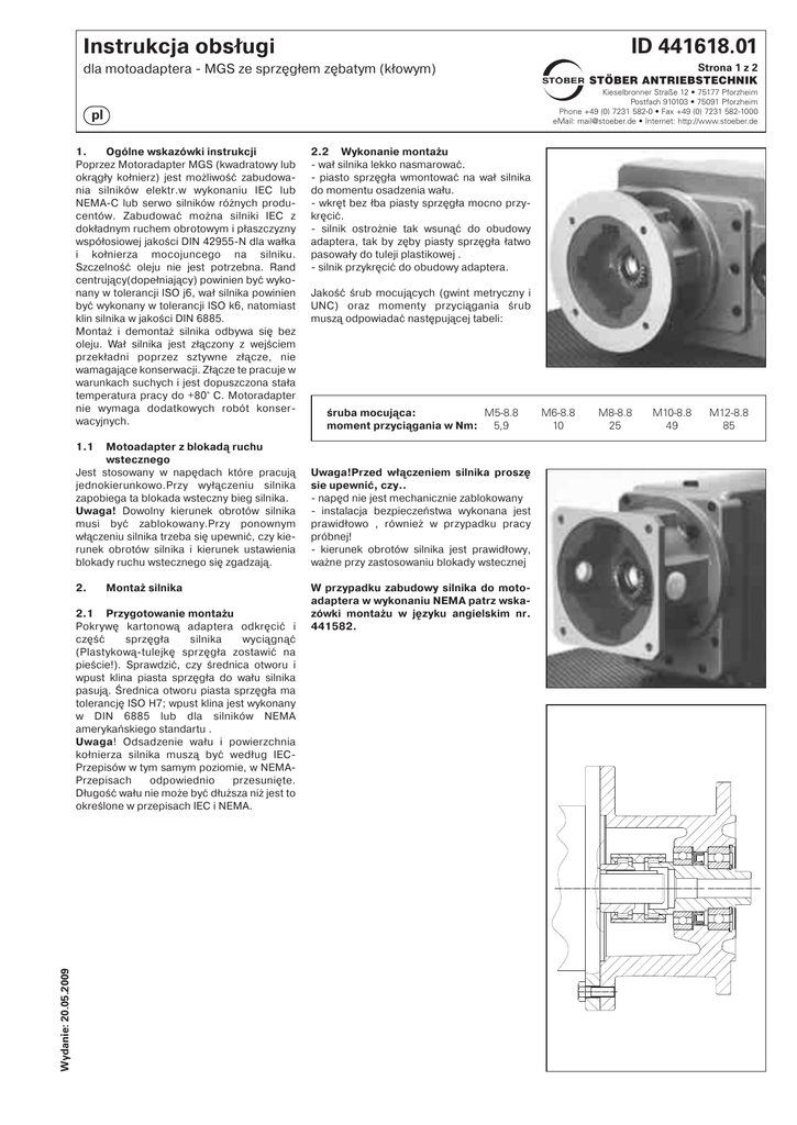 ID 441618.01 Instrukcja obs³ugi Strona 1 z 2 STÖBER ANTRIEBSTECHNIK dla motoadaptera - MGS ze sprzêg³em zêbatym (k³owym) Kieselbronner Straße 12 • 75177 Pforzheim Postfach 910103 • 75091 Pforzheim Phone +49 (0) 7231 582-0 • Fax +49 (0) 7231 582-1000 eMail: [email protected] • Internet: http://www.stoeber.de pl 1. Ogólne wskazówki instrukcji Poprzez Motoradapter MGS (kwadratowy lub okr¹g³y ko³nierz) jest mo¿liwoœæ zabudowania silników elektr.w wykonaniu IEC lub NEMA-C lub serwo silników ró¿nych producentów. Zabudowaæ mo¿na silniki IEC z dok³adnym ruchem obrotowym i p³aszczyzny wspó³osiowej jakoœci DIN 42955-N dla wa³ka i ko³nierza mocojuncego na silniku. Szczelnoœæ oleju nie jest potrzebna. Rand centruj¹cy(dope³niaj¹cy) powinien byæ wykonany w tolerancji ISO j6, wa³ silnika powinien byæ wykonany w tolerancji ISO k6, natomiast klin silnika w jakoœci DIN 6885. Monta¿ i demonta¿ silnika odbywa siê bez oleju. Wa³ silnika jest z³¹czony z wejœciem przek³adni poprzez sztywne z³¹cze, nie wamagaj¹ce konserwacji. Z³¹cze te pracuje w warunkach suchych i jest dopuszczona sta³a temperatura pracy do +80° C. Motoradapter nie wymaga dodatkowych robót konserwacyjnych. Motoadapter z blokad¹ ruchu wstecznego Jest stosowany w napêdach które pracuj¹ jednokierunkowo.Przy wy³¹czeniu silnika zapobiega ta blokada wsteczny bieg silnika. Uwaga! Dowolny kierunek obrotów silnika musi byæ zablokowany.Przy ponownym w³¹czeniu silnika trzeba siê upewniæ, czy kierunek obrotów silnika i kierunek ustawienia blokady ruchu wstecznego siê zgadzaj¹. 2.2 Wykonanie monta¿u - wa³ silnika lekko nasmarowaæ. - piasto sprzêg³a wmontowaæ na wa³ silnika do momentu osadzenia wa³u. - wkrêt bez ³ba piasty sprzêg³a mocno przykrêciæ. - silnik ostro¿nie tak wsun¹æ do obudowy adaptera, tak by zêby piasty sprzêg³a ³atwo pasowa³y do tuleji plastikowej . - silnik przykrêciæ do obudowy adaptera. Jakoœæ œrub mocuj¹cych (gwint metryczny i UNC) oraz momenty przyci¹gania œrub musz¹ odpowiadaæ nastêpuj¹cej tabeli: œruba mocuj¹ca: M5-8.8 moment przyci¹gania w Nm: 5,9 1.1 2. Monta¿ silnika Wydanie: 20.05.2009 2.1 Przygotowanie monta¿u Pokrywê kartonow¹ adaptera odkrêciæ i czêœæ sprzêg³a silnika wyci¹gn¹æ (Plastykow¹-tulejkê sprzêg³a zostawiæ na pieœcie!). Sprawdziæ, czy œrednica otworu i wpust klina piasta sprzêg³a do wa³u silnika pasuj¹. Œrednica otworu piasta sprzêg³a ma tolerancjê ISO H7; wpust klina jest wykonany w DIN 6885 lub dla silników NEMA amerykañskiego standartu . Uwaga! Odsadzenie wa³u i powierzchnia ko³nierza silnika musz¹ byæ wed³ug IECPrzepisów w tym samym poziomie, w NEMAPrzepisach odpowiednio przesuniête. D³ugoœæ wa³u nie mo¿e byæ d³u¿sza ni¿ jest to okreœlone w przepisach IEC i NEMA. Uwaga!Przed w³¹czeniem silnika proszê sie upewniæ, czy.. - napêd nie jest mechanicznie zablokowany - instalacja bezpieczeñstwa wykonana jest prawid³owo , równie¿ w przypadku pracy próbnej! - kierunek obrotów silnika jest prawid³owy, wa¿ne przy zastosowaniu blokady wstecznej W przypadku zabudowy silnika do motoadaptera w wykonaniu NEMA patrz wskazówki monta¿u w jêzyku angielskim nr. 441582. M6-8.8 10 M8-8.8 25 M10-8.8 49 M12-8.8 85 ID 441618.01 Pokyny pro montáž Strona 2 z 2 STÖBER ANTRIEBSTECHNIK Pokyny pro montáž adaptéru motoru MGS se zubovou spojkou Kieselbronner Straße 12 • 75177 Pforzheim Postfach 910103 • 75091 Pforzheim Phone +49 (0) 7231 582-0 • Fax +49 (0) 7231 582-1000 eMail: [email protected] • Internet: http://www.stoeber.de cs 1. Všeobecné pokyny Pomocí adaptéru motoru MGS (s kulatou nebo ètyøhrannou pøírubou) se k pøevodovce montují normované motory podle IEC nebo bì žné servomotory. Montovat lze normované motory s normální házivostí, rovnobì žností a soustøedností podle DIN 42955-N pro konec høídele a upevòovací pøírubu. Tì snost na olej není potøebná. Støedicí prùmì r musí mít toleranci ISO j6, konec høídele toleranci ISO k6 a zalícované pero musí být podle DIN 6885 list 1. Montáž a demontáž motoru je možná bez kontaktu s mazivem. Høídel motoru je s pohánì nou høídelí pøevodovky spojena volnì pohyblivou, v zkrutu tuhou a bezúdržbovou zubovou spojkou. Spojka bì ží nasucho a snáší trvalou provozní teplotu až +80° C. Adaptér motoru nevyžaduje žádnou zvláštní údržbu. 1.1 Adaptér motoru s blokováním zpì tného chodu Používá se pro pohony, které pracují pouze v jednom smì ru otáèení a u kterých se má po vypnutí motoru zabránit otáèení pøevodovky zpì t v dùsledku sil vyvolávajících zpì tný pohyb. Pozor! Povolený smì r otáèení pohonu musí být v objednávce urèen. Pøed zapnutím motoru bezpodmíneènì zajistì te, aby smì r otáèení motoru souhlasil s volným smì rem spojky! 2. Montáž motoru 2.1 Pøíprava pro montáž Odšroubujte kartonový kryt na tì lese adaptéru a hlavu spojky pro motor vyjmì te z tì lesa (plastové pouzdro spojky nechte nasazené na protilehlé hlavì !). Zkontrolujte, zda prùmì r otvoru a zalícované pero hlavy spojky pasují k høídeli motoru. Otvor hlavy spojky má toleranci ISO H7; zalícované pero je vyrobeno podle DIN 6885 list 1. Pozor! Osazení høídele a plocha pøíruby motoru musí být podle IEC ve stejné rovinì . Høídel motoru nesmí být delší, než norma uvádí! Upevòovací šroub: Utahovací moment v Nm: M5-8.8 5,9 M6-8.8 10 2.2 Postup montáže - Høídel motoru mírnì potøete tukem. - Hlavu spojky natlaète na høídel motoru až k osazení høídele (viz obr.). - Závitový kolík hlavy spojky pevnì utáhnì te. - Motor opatrnì nasaï te na tì leso adaptéru tak, aby ozubení hlavy spojky lehce zapadlo do vnitøního ozubení plastového pouzdra. - Na tì leso adaptéru pøišroubujte motor. Kvalita upevòovacích šroubù (metrický a UNC závit) a utahovací momenty mus