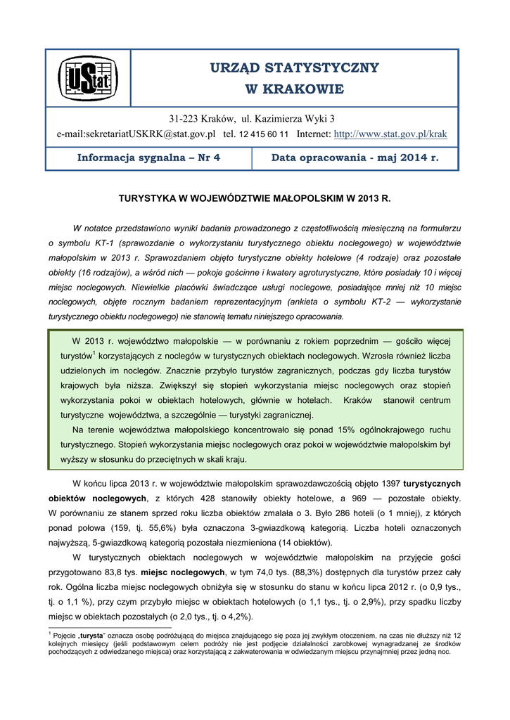 URZĄD STATYSTYCZNY W KRAKOWIE 31-223 Kraków, ul. Kazimierza Wyki 3 e-mail:[email protected] tel. 12 415 60 11 Internet: http://www.stat.gov.pl/krak Informacja sygnalna – Nr 4 Data opracowania - maj 2014 r. TURYSTYKA W WOJEWÓDZTWIE MAŁOPOLSKIM W 2013 R. W notatce przedstawiono wyniki badania prowadzonego z częstotliwością miesięczną na formularzu o symbolu KT-1 (sprawozdanie o wykorzystaniu turystycznego obiektu noclegowego) w województwie małopolskim w 2013 r. Sprawozdaniem objęto turystyczne obiekty hotelowe (4 rodzaje) oraz pozostałe obiekty (16 rodzajów), a wśród nich — pokoje gościnne i kwatery agroturystyczne, które posiadały 10 i więcej miejsc noclegowych. Niewielkie placówki świadczące usługi noclegowe, posiadające mniej niż 10 miejsc noclegowych, objęte rocznym badaniem reprezentacyjnym (ankieta o symbolu KT-2 — wykorzystanie turystycznego obiektu noclegowego) nie stanowią tematu niniejszego opracowania. W 2013 r. województwo małopolskie — w porównaniu z rokiem poprzednim — gościło więcej 1 turystów korzystających z noclegów w turystycznych obiektach noclegowych. Wzrosła również liczba udzielonych im noclegów. Znacznie przybyło turystów zagranicznych, podczas gdy liczba turystów krajowych była niższa. Zwiększył się stopień wykorzystania miejsc noclegowych oraz stopień wykorzystania pokoi w obiektach hotelowych, głównie w hotelach. Kraków stanowił centrum turystyczne województwa, a szczególnie — turystyki zagranicznej. Na terenie województwa małopolskiego koncentrowało się ponad 15% ogólnokrajowego ruchu turystycznego. Stopień wykorzystania miejsc noclegowych oraz pokoi w województwie małopolskim był wyższy w stosunku do przeciętnych w skali kraju. W końcu lipca 2013 r. w województwie małopolskim sprawozdawczością objęto 1397 turystycznych obiektów noclegowych, z których 428 stanowiły obiekty hotelowe, a 969 — pozostałe obiekty. W porównaniu ze stanem sprzed roku liczba obiektów zmalała o 3. Było 286 hoteli (o 1 mniej), z których ponad połowa (159, tj. 55,6%) była oznaczona 3-gwiazdkową kategorią. Liczba hoteli oznaczonych najwyższą, 5-gwiazdkową kategorią pozostała niezmieniona (14 obiektów). W turystycznych obiektach noclegowych w województwie małopolskim na przyjęcie gości przygotowano 83,8 tys. miejsc noclegowych, w tym 74,0 tys. (88,3%) dostępnych dla turystów przez cały rok. Ogólna liczba miejsc noclegowych obniżyła się w stosunku do stanu w końcu lipca 2012 r. (o 0,9 tys., tj. o 1,1 %), przy czym przybyło miejsc w obiektach hotelowych (o 1,1 tys., tj. o 2,9%), przy spadku liczby miejsc w obiektach pozostałych (o 2,0 tys., tj. o 4,2%). 1 Pojęcie „turysta” oznacza osobę podróżującą do miejsca znajdującego się poza jej zwykłym otoczeniem, na czas nie dłuższy niż 12 kolejnych miesięcy (jeśli podstawowym celem podróży nie jest podjęcie działalności zarobkowej wynagradzanej ze środków pochodzących z odwiedzanego miejsca) oraz korzystającą z zakwaterowania w odwiedzanym miejscu przynajmniej przez jedną noc. –2– Wzrosła liczba miejsc noclegowych w hotelach (łącznie o 0,8 tys., tj. o 2,8%). W hotelach o najwyższym standardzie, oznaczonych 5-gwiazdkową kategorią, było 2,1 tys. miejsc, w hotelach 4-gwiazdkowych znajdowało się 8,3 tys. miejsc, a najwięcej, tj. 13,9 tys. miejsc noclegowych (45,5% wszystkich miejsc hotelowych) mieściło się w hotelach średniej klasy, oznaczonych 3-gwiazdkową kategorią. TABL. 1. TURYSTYCZNE OBIEKTY NOCLEGOWE Stan w dniu 31 VII Obiekty 2012 Miejsca noclegowe 2013 RODZAJE OBIEKTÓW w liczbach bezwzględnych 2012 w odsetkach Liczba miejsc noclegowych na 1 obiekt 2013 w liczbach bezwzględnych w odsetkach 2012 2013 OGÓŁEM ............................... 1400 1397 100,0 84713 83797 100,0 60,5 60,0 Obiekty hotelowe ................. Hotele .................................... Motele .................................... Pensjonaty ............................. Inne obiekty hotelowe ............ 429 287 8 60 74 428 286 8 60 74 30,6 20,4 0,6 4,3 5,3 37001 29696 293 3362 3650 38087 30538 323 3661 3565 45,5 36,4 0,4 4,4 4,3 86,2 103,5 36,6 56,0 49,3 89,0 106,8 40,4 61,0 48,2 Pozostałe obiekty ................ Domy wycieczkowe ............... Schroniska ............................. Schroniska młodzieżowe ....... Szkolne schroniska młodzieżowe ......................... Ośrodki wczasowe ................. Ośrodki kolonijne ................... Ośrodki szkoleniowo-wypoczynkowe .................... Domy pracy twórczej ............. Zespoły domków turystycznych ....................... Kempingi ................................ Pola biwakowe ....................... Hostele ................................... Zakłady uzdrowiskowe............ Pokoje gościnne .................... Kwatery agroturystyczne ....... Pozostałe niesklasyfikowane . 971 11 24 5 969 9 23 5 69,4 0,6 1,6 0,4 47712 587 1384 439 45710 528 1279 439 54,5 0,6 1,5 0,5 49,1 53,4 57,7 87,8 47,2 58,7 55,6 87,8 24 104 8 24 99 9 1,7 7,1 0,6 1551 8393 514 1508 7915 589 1,8 9,5 0,7 64,6 80,7 64,3 62,8 79,9 65,4 59 12 59 10 4,2 0,7 4207 385 4482 312 5,3 0,4 71,3 32,1 76,0 31,2 16 9 8 37 36 462 67 89 16 10 8 39 36 450 90 82 1,2 0,7 0,6 2,8 2,6 32,2 6,5 5,9 944 916 585 1853 4887 11820 1111 8136 874 1052 390 2686 4771 11396 1423 6066 1,0 1,3 0,5 3,2 5,7 13,6 1,7 7,2 59,0 101,8 73,1 50,1 135,8 25,6 16,6 91,4 54,6 105,2 48,8 68,9 132,5 25,3 15,8 74,0 Liczba pokoi w obiektach hotelowych wyniosła 17,7 tys., w tym 17,4 tys. (98,8%) — z pełnym węzłem higieniczno-sanitarnym. W taki sposób wyposażone były wszystkie pokoje w motelach i pensjonatach, natomiast w hotelach i innych obiektach hotelowych ich odsetek wyniósł odpowiednio: 99,2% i 93,5%. Na 1 hotel przypadało średnio 51 pokoi, przeciętny motel liczył 19 pokoi, pensjonat — 26, a inny obiekt hotelowy — 20. W końcu lipca 2013 r. w turystycznych obiektach noclegowych było 96
