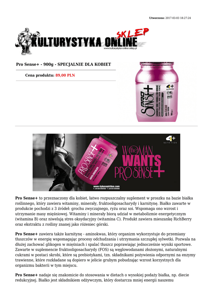 Utworzono: 2017-03-03 18:27:24 Pro Sense+ - 900g - SPECJALNIE DLA KOBIET Cena produktu: 89,00 PLN Pro Sense+ to przeznaczony dla kobiet, łatwo rozpuszczalny suplement w proszku na bazie białka roślinnego, który zawiera witaminy, minerały, fruktooligosacharydy i karnitynę. Białko zawarte w produkcie pochodzi z 3 źródeł: grochu zwyczajnego, ryżu oraz soi. Wspomaga ono wzrost i utrzymanie masy mięśniowej. Witaminy i minerały biorą udział w metabolizmie energetycznym (witamina B) oraz niwelują stres oksydacyjny (witamina C). Produkt zawiera mieszankę RichBerry oraz ekstraktu z rośliny znanej jako różeniec górski. Pro Sense+ zawiera także karnitynę - aminokwas, który organizm wykorzystuje do przemiany tłuszczów w energię wspomagając procesy odchudzania i utrzymania szczupłej sylwetki. Pozwala na dłużej zachować glikogen w mięśniach i spalać tłuszcz poprawiając jednocześnie wyniki sportowe. Zawarte w suplemencie fruktooligosacharydy (FOS) są węglowodanami złożonymi, naturalnymi cukrami w postaci skrobi, które są prebiotykami, tzn. składnikami pożywienia odpornymi na enzymy trawienne, które rozkładane są dopiero w jelicie grubym pobudzając wzrost korzystnych dla organizmu bakterii w tym miejscu. Pro Sense+ nadaje się znakomicie do stosowania w dietach o wysokiej podaży białka, np. diecie redukcyjnej. Białko jest składnikiem odżywczym, który dostarcza mniej energii naszemu organizmowi niż jest jej potrzeba do jego strawienia. Nasz organizm, kiedy nie ma do dyspozycji węglowodanów pobiera energię niezbędną do procesu trawienia białek ze zmagazynowanych w ciele tłuszczów, dzięki czemu dochodzi do ich spalenia. Białko dostarcza najwyższej klasy budulca, nie powodując przy tym zjawiska retencji wody, które często występuje przy spożyciu nadmiernej ilości węglowodanów. Składniki: Porcja: 30 g Porcji w opakowaniu: 30 Opakowanie: 900 g Wartość odżywcza: w 1 porcji 30g Wartość energetyczna 158 Kcal Białko (NX6, 25) 22,20 g węglowodan 0,31 g tłuszcz 1,12 g FOS 5,05 g karnityna 681 mg Soja (w tym izoflawony) 40 mg Czerwone winogrona (w tym PCO) 47,5 mg Rhodiola 1,5 mg Richberry 6000 50 mg enzymy trawienne 25 mg %ZDS magnez 56,25 mg 15% żelazo 2,10 mg 15% cynk 1,5 mg 15% chrom 6 mcg 15% selen 8,25 mcg 15% Witamina C 40 mg 50% Niacyna 4,8 mg 30% Kwas pantotenowy 1,8 mg 30% Witamina B6 0,42 mg 30% Witamina B2 0,42 mg 30% tiamina 0,33 mg 30% Kwas foliowy 60 mcg 30% biotyna 15 mcg 30% Witamina B12 0,75 mcg 30% Witamina D3 0,75 mcg 15% Witamina E 1,8 mg 15% Beta-karoten 0,75 mg Składniki: izolat białka sojowego, białko ryżu, emulgator: lecytyna sojowa, kakao w proszku, FOS (fruktooligosacharydy), winian karnityny, tlenek magnezu, soja (Glucine max L.) zaw. 40% izoflawonu, Uva rossa (Vitis vinifera L.)aw. 3% rozawin, Richberry 6000, substancje słodzące (sukraloza, sacharyna), witamina C (kwas l-askorbinowy), maltodekstryna, ENZYMIX (Aspergillus oryzae), glukanian żelaza, beta karoten, glukonian cynku, drożdże wzbogacone w selen, witamina E (octan DL-alfa tokoferolu), witamina B3 (nikotynamid), witamina D3 (cholekalcyferol), witamina B5 (pantotenian wapnia), witamina B6 (chlorowodorek pirydoksyny), witamina B1 (chlorowodorek tiaminy), witamina B2 (ryboflawina), pikolinian chromu, witamina B9 (kwas foliowy), biotyna, witamina B12 (cyjanokobalamina). Sposób użycia: 30g produktu rozpuścić w 250 ml-300 ml wody lub ulubionym napoju. Spożywać 1-2 porcje dziennie, bezpośrednio po przygotowaniu. Marka MP Adres: http://www.ko.sklep.pl/ - Telefon: kom. 782 010 880 Email: [email protected]
