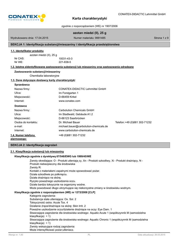 CONATEX-DIDACTIC Lehrmittel GmbH Karta charakterystyki zgodnie z rozporządzeniem (WE) nr 1907/2006 azotan miedzi (II), 25 g Wydrukowano dnia: 17.04.2015 Strona 1 z 9 Numer materiału: 9991485 SEKCJA 1: Identyfikacja substancji/mieszaniny i identyfikacja przedsiębiorstwa 1.1. Identyfikator produktu azotan miedzi (II), 25 g Nr CAS: Nr WE: 10031-43-3 221-838-5 1.2. Istotne zidentyfikowane zastosowania substancji lub mieszaniny oraz zastosowania odradzane Zastosowanie substancji/mieszaniny Chemikalia laboratoryjne 1.3. Dane dotyczące dostawcy karty charakterystyki Sprzedawca Nazwa firmy: Ulica: Miejscowość: Internet: CONATEX-DIDACTIC Lehrmittel GmbH Im Forstgarten 1 D-66459 Kirkel www.conatex.com Dostawca Nazwa firmy: Ulica: Carbolution Chemicals GmbH Im Stadtwald, Gebäude A1.2 Miejscowość: D-66123 Saarbrücken Osoba do kontaktu: Dr. Michael Bauer e-mail: [email protected] Internet: www.carbolution-chemicals.de 1.4. Numer telefonu alarmowego: Telefon: +49 (0)681 302-71232 +49 (0)681 302-71232 SEKCJA 2: Identyfikacja zagrożeń 2.1. Klasyfikacja substancji lub mieszaniny Klasyfikacja zgodnie z dyrektywą 67/548/EWG lub 1999/45/WE Zwroty określające: O - Produkt utleniaja˛cy, Xn - Produkt szkodliwy, Xi - Produkt drażniący, N Produkt niebezpieczny dla środowiska Zwroty R: Kontakt z materiałami zapalnymi może spowodować pożar. Działa szkodliwie po połknięciu. Działa drażniąco na skórę. Ryzyko poważnego uszkodzenia oczu. Działa bardzo toksycznie na organizmy wodne. Może powodować długo utrzymujące się niekorzystne zmiany w środowisku wodnym. Klasyfikacja zgodnie z rozporządzeniem (WE) nr 1272/2008 [CLP] Kategorie zagrożenia: Substancja stała utleniająca: Ox. Sol. 2 Toksyczność ostra: Acute Tox. 4 Działanie żrące/drażniące na skórę: Skin Irrit. 2 Poważne uszkodzenie oczu/działanie drażniące na oczy: Eye Dam. 1 Stwarzające zagrożenie dla środowiska wodnego: Aquatic Acute 1 (współczynnik M (samodzielna klasyfikacja) = 1) Stwarzające zagrożenie dla środowiska wodnego: Aquatic Chronic 1 (współczynnik M (samodzielna klasyfikacja) = 1) Zwroty wskazujące rodzaj zagrożenia: Może intensyfikować pożar;utleniacz. Wersja nr: 1,00 PL Data aktualizacji: 26.03.2015 CONATEX-DIDACTIC Lehrmittel GmbH Karta charakterystyki zgodnie z rozporządzeniem (WE) nr 1907/2006 azotan miedzi (II), 25 g Wydrukowano dnia: 17.04.2015 Strona 2 z 9 Numer materiału: 9991485 Działa szkodliwie po połknięciu. Działa drażniąco na skórę. Powoduje poważne uszkodzenie oczu. Działa bardzo toksycznie na organizmy wodne. Działa bardzo toksycznie na organizmy wodne, powodując długotrwałe skutki. 2.2. Elementy oznakowania Niebezpieczne składniki, które muszą być wymienione na etykiecie azotan miedzi (II) Hasło ostrzegawcze: Niebezpieczeństwo GHS03-GHS05-GHS07-GHS09 Piktogram: Zwroty wskazujące rodzaj zagrożenia H272 Może intensyfikować pożar;utleniacz. H302 Działa szkodliwie po połknięciu. H315 Działa drażniąco na skórę. H318 Powoduje poważne uszkodzenie oczu. H410 Działa bardzo toksycznie na organizmy wodne, powodując długotrwałe skutki. Zwroty wskazujące środki ostrożności P273 Unikać uwolnienia do środowiska. P280 Stosować rękawice ochronne/odzież ochronną/ochronę oczu/ochronę twarzy. P305+P351+P338 W PRZYPADKU DOSTANIA SIĘ DO OCZU: Ostrożnie płukać wodą przez kilka minut. Wyjąć soczewki kontaktowe, jeżeli są i można je łatwo usunąć. Nadal płukać. P501 Zawartość/pojemnik usuwać do Gospodarka odpadami. SEKCJA 3: Skład/informacja o składnikach 3.1. Substancje Wzór chemiczny: CuN2O6 · 3H2O Masa cząsteczkowa: 241,60 Składniki niebezpieczne Nr WE Nr CAS Nazwa chemiczna Ilość Nr Index Klasyfikacja zgodnie z 67/548/EWG Klasyfikacja zgodnie z rozporządzeniem (WE) nr 1272/2008 [CLP] 221-838-5 azotan miedzi (II) 10031-43-3 O - Produkt utleniający, Xn - Produkt szkodliwy, Xi - Produkt drażniący, N - Produkt niebezpieczny dla środowiska R08-22-38-41-50-53 100 % Ox. Sol. 2, Acute Tox. 4, Skin Irrit. 2, Eye Dam. 1, Aquatic Acute 1, Aquatic Chronic 1; H272 H302 H315 H318 H400 H410 Wydźwięk zdań R-, H- i EUH: patrz sekcja 16. SEKCJA 4: Środki pierwszej pomocy 4.1. Opis środków pierwszej pomocy Wskazówki ogólne W przypadku awarii lub jezeli zle sie poczujesz, niezwlocznie zasiegnij porady lekarza - jezeli to mozliwe, pokaz etykiete. Wersja nr: 1,00 PL Data aktualizacji: 26.03.2015 CONATEX-DIDACTIC Lehrmittel GmbH Karta charakterystyki zgodnie z rozporządzeniem (WE) nr 1907/2006 azotan miedzi (II), 25 g Wydrukowano dnia: 17.04.2015 Strona 3 z 9 Numer materiału: 9991485 W przypadku wdychania Należy zadbać o należytą wentylację. W przypadku kontaktu ze skórą W PRZYPADKU KONTATKU ZE SKÓRĄ (lub z włosami): Natychmiast zdjąć całą zanieczyszczoną odzież. Spłukać skórę pod strumieniem wody/prysznicem. W przypadku wystąpienia podrażnienia skóry: Zasięgnąć porady/zgłosić się pod opiekę lekarza. W przypadku kontaktu z oczami W przypadku kontaktu z oczami natychmiast przemyć je przez około 10 do 15 minut pod bieżącą wodą nie zamykając powiek. Następnie udać się do okulisty. W przypadku połknięcia Natychmiast przepłukać jamę ustną i obficie popić wodą. Konieczna opieka lekarska. 4.3. Wskazania dotyczące wszelkiej natychmiastowej pomocy lekarskiej i szczególnego postępowania z poszkodowanym Brak danych SEKCJA 5: Postępowanie w przypadku pożaru 5.1. Środki gaśnicze Odpowiednie środki gaśnicze Środki gaśnicze należy dostosować do otoczenia. 5.2. Szczególne zagrożenia związane z substancją lub mieszaniną Produkt nie jest palny. 5.3. Informacje dla straży pożarnej Nosić przenośny aparat oddechowy i odzież odporną na chemikalia. Ubranie ochrony zupełnej. Informacja uzupełniająca Gaz/opary/mgłę usunąć tryskającym strumieniem wody. Zanieczyszczoną wodę zbierać osobno. Nie powinna się ona dostać do kanalizacji lub zbiorników wodnych. SEKCJA