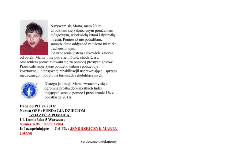 Nazywam się Marta, mam 20 lat. Urodziłam się z dziecięcym porażeniem mózgowym, wiotkością krtani i dystrofią mięśni. Ponieważ nie potrafiłam, samodzielnie oddychać założono mi rurkę tracheostomijną . Od urodzenia jestem całkowicie zależna od opieki Mamy ; nie potrafię mówić, chodzić, a z otoczeniem porozumiewam się za pomocą prostych gestów. Przez całe moje życie potrzebowałam i potrzebuje kosztownej, intensywnej rehabilitacjii usprawniającej, sprzętu medycznego i pobytu na turnusach rehebilitacyjnych. Dlatego ja i moja Mama zwracamy się z ogromną prośbą do wszystkich ludzi mających serce o pomoc i przekazanie 1% z podatku za 2011r. Dane do PIT za 2011r. Nazwa OPP : FUNDACJA DZIECIOM „ZDĄZYĆ Z POMOCĄ” Ul. Łomiańska 5 Warszawa Numer KRS : 0000037904 Inf uzupełniające – Cel 1% : JENDRZEJCZYK MARTA (14224) Serdecznie dziękujemy.