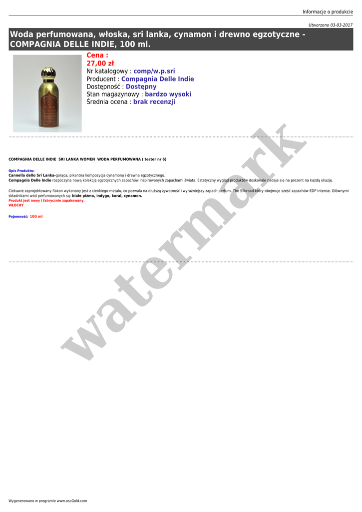 Informacje o produkcie Utworzono 03-03-2017 Woda perfumowana, włoska, sri lanka, cynamon i drewno egzotyczne COMPAGNIA DELLE INDIE, 100 ml. Cena : 27,00 zł er m ar k Nr katalogowy : comp/w.p.sri Producent : Compagnia Delle Indie Dostępność : Dostępny Stan magazynowy : bardzo wysoki Średnia ocena : brak recenzji COMPAGNIA DELLE INDIE SRI LANKA WOMEN WODA PERFUMOWANA ( tester nr 6) Opis Produktu: Cannella dello Sri Lanka-gorąca, pikantna kompozycja cynamonu i drewna egzotycznego. Compagnia Delle Indie rozpoczyna nową kolekcję egzotycznych zapachów inspirowanych zapachami świata. Estetyczny wygląd produktów doskonale nadaje się na prezent na każdą okazję. Ciekawie zaprojektowany flakon wykonany jest z cienkiego metalu, co pozwala na dłuższą żywotność i wyraźniejszy zapach perfum. The Silkroad który obejmuje sześć zapachów EDP Intense. Głównymi składnikami wód perfumowanych są: białe piżmo, indygo, koral, cynamon. Produkt jest nowy i fabrycznie zapakowany. WŁOCHY w at Pojemność: 100 ml Wygenerowano w programie www.oscGold.com