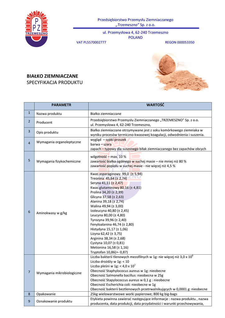 Przedsiębiorstwo Przemysłu Ziemniaczanego „Trzemeszno” Sp. z o.o. ul. Przemysłowa 4, 62-240 Trzemeszno POLAND VAT PL5570002777 REGON 000053350 BIAŁKO ZIEMNIACZANE SPECYFIKACJA PRODUKTU PARAMETR 1 Nazwa produktu 2 Producent 3 Opis produktu 4 Wymagania organoleptyczne 5 Wymagania fizykochemiczne 6 Aminokwasy w g/kg 7 Wymagania mikrobiologiczne 8 Opakowanie 9 Oznakowanie produktu WARTOŚĆ Białko ziemniaczane Przedsiębiorstwo Przemysłu Ziemniaczanego „TRZEMESZNO” Sp. z o.o. ul. Przemyslowa 4, 62-240 Trzemeszno, Białko ziemniaczane otrzymywane jest z soku komórkowego ziemniaka w wyniku procesów termiczno-kwasowej koagulacji, odwodnienia i suszenia. wygląd – sypki proszek barwa – szara zapach – typowy dla suszonego biłak ziemniaczanego bez zapachów obcych wilgotność – max. 10 % zawartość białka ogólnego w suchej masie – nie mniej niż 80 % zawartość popiołu w suchej masie - nie więcej niż 4,5 % Kwas asparaginowy 99,0 (± 5,94) Treonina 45,64 (± 2,74) Seryna 41,11 (± 2,47) Kwas glutaminowy 80,16 (± 4,81) Prolina 34,20 (± 2,39) Glicyna 37,58 (± 2,63) Alanina 39,18 (± 2,74) Walina 49,94 (± 3,00) Izoleucyna 40,80 (± 2,45) Leucyna 80,00 (± 4,80) Tyrozyna 39,96 (± 2,40) Fenyloalanina 46,74 (± 2,80) Histydyna 15,17 (± 1,06) Lizyna 62,42 (± 3,75) Arginina 38,34 (± 2,68) Cystyna 10,07 (± 0,81) Metionina 16,58 (± 1,16) Tryptofan 10,86(+- 0,87) 6 Liczba bakterii tlenowych mezofilnych w 1g: nie więcej niż 3,0 x 10 Liczba drożdży w 1g: < 10 1 Liczba pleśni w 1g: < 4,0 x 10 Obecność Staphylococus aureus w 1g: nieobecne Obecność Salmonella bacillus: nieobecna w 25g Obecność Stapylococcus aureus w 0,1 g : nieobecne Obecność Escherichia coli: nieobecne w 1g Obecność bakterii beztlenowych przetrwalnikujących w 0,0001 g: nieobecne 25kg wielowarstwowe worki papierowe; 800 kg big-bags Etykieta powinna zawierać następujące informacje : nazwa produktu , nazwa producenta, data produkcji, data przydatności i warunki przechowywania, 10 Warunki przechowywania 11 12 Termin przydatności do spożycia Numer weterynaryjny Zalecana wilgotność względna powietrza 60-75% Temperatura 0 - 20°C 24 miesiące od daty produkcji PL 3003166p 13 Norma odniesienia PN-92/R-64811 14 GMO Białko ziemniaczane nie jest produkowane z ziemniaków modyfikowanych genetycznie. Specyfikacja nr : wersja : Data : Aktualizacja: Przygotował i sprawdził: Dział Jakości Tel. 0048 614154350 ext. 62 Fax: 0048 614154351 [email protected] Dział Sprzedaży Tel. 0048 614154230 Fax: 0048 614154293 [email protected] odwiedź nas na: www.ppz.pl