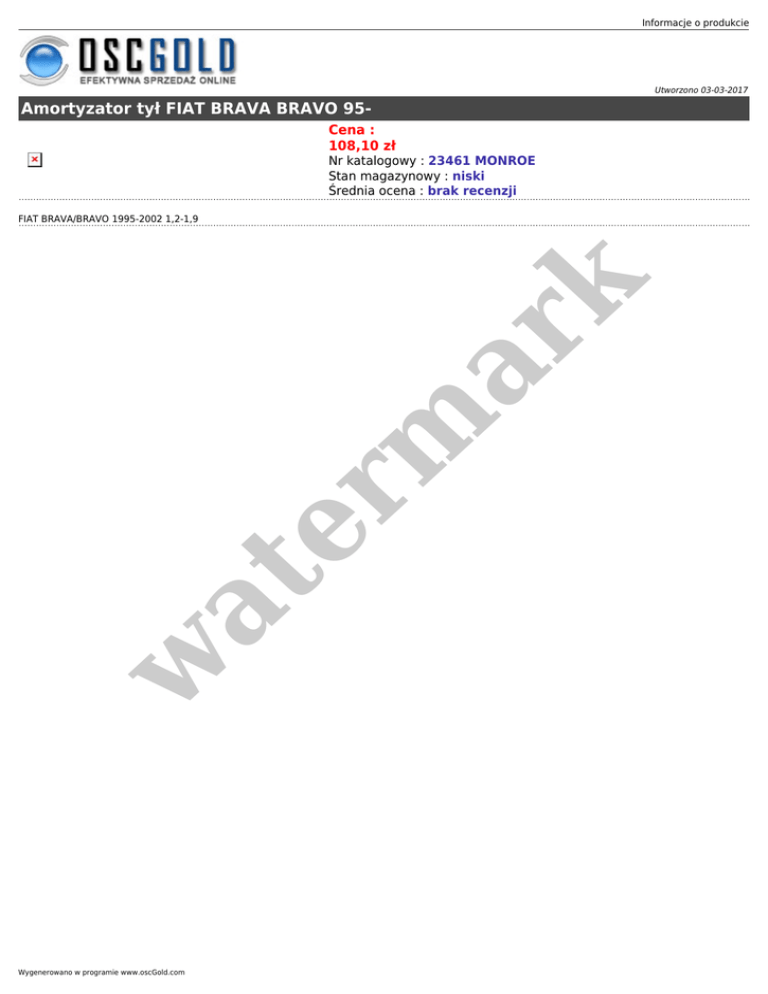 Informacje o produkcie Utworzono 03-03-2017 Amortyzator tył FIAT BRAVA BRAVO 95Cena : 108,10 zł Nr katalogowy : 23461 MONROE Stan magazynowy : niski Średnia ocena : brak recenzji w at er m ar k FIAT BRAVA/BRAVO 1995-2002 1,2-1,9 Wygenerowano w programie www.oscGold.com