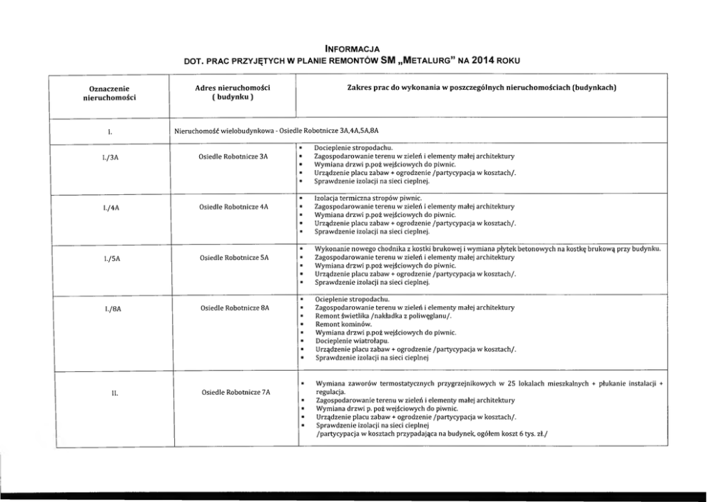 Informacje dot. prac przyjętych w planie remontów 2014r.