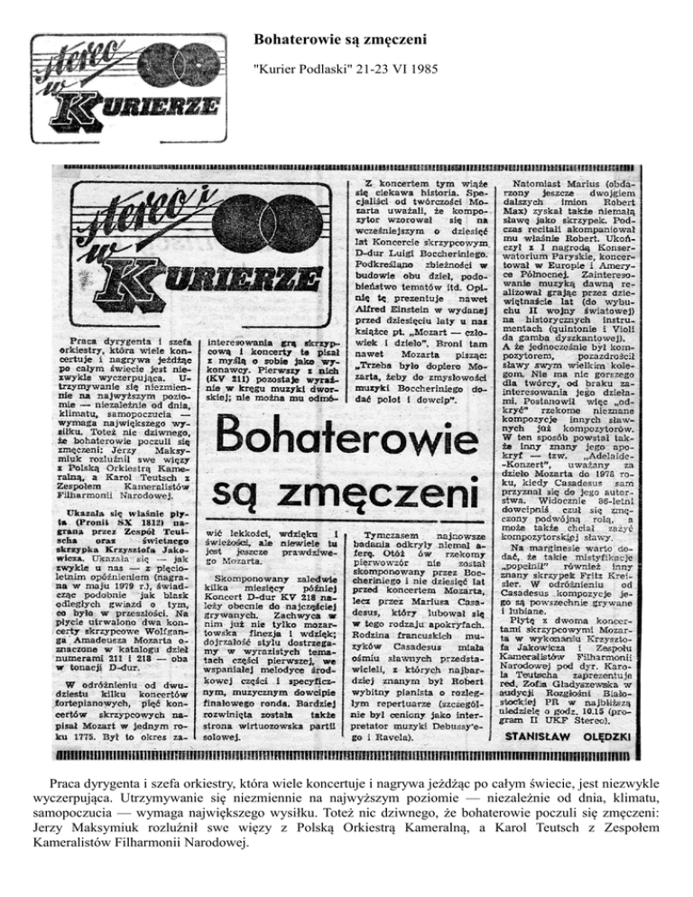 Bohaterowie są zmęczeni "Kurier Podlaski" 21-23 VI 1985 Praca dyrygenta i szefa orkiestry, która wiele koncertuje i nagrywa jeżdżąc po całym świecie, jest niezwykle wyczerpująca. Utrzymywanie się niezmiennie na najwyższym poziomie — niezależnie od dnia, klimatu, samopoczucia — wymaga największego wysiłku. Toteż nic dziwnego, że bohaterowie poczuli się zmęczeni: Jerzy Maksymiuk rozluźnił swe więzy z Polską Orkiestrą Kameralną, a Karol Teutsch z Zespołem Kameralistów Filharmonii Narodowej. Ukazała się właśnie płyta (Pronit SX 1812) nagrana przez Zespół Teutscha oraz świetnego skrzypka Krzysztofa Jakowicza. Ukazała się — jak zwykle u nas — z pięcioletnim opóźnieniem (nagrana w maju 1979r.), świadcząc podobnie jak blask odległych gwiazd o tym, co było w przeszłości. Na płycie utrwalono dwa koncerty skrzypcowe Wolfganga Amadeusza Mozarta oznaczone w katalogu dzieł (KV) numerami 211 i 213 — oba w tonacji D-dur. W odróżnieniu od dwudziestu kilku koncertów fortepianowych, pięć koncertów skrzypcowych napisał Mozart w jednym roku 1775. Był to okres zainteresowania grą skrzypcową i koncerty te pisał z myślą o sobie jako wykonawcy. Pierwszy z nich (KV 211) pozostaje wyraźnie w kręgu muzyki dworskiej; nie można mu odmówić lekkości, wdzięku i świeżości, ale niewiele tu jest jeszcze prawdziwego Mozarta. Skomponowany zaledwie kilka miesięcy później Koncert D-dur KV 218 należy obecnie do najczęściej grywanych. Zachwyca w nim już nie tylko mozartowska finezja i wdzięk; dojrzałość stylu dostrzegamy w wyrazistych tematach części pierwszej, we wspanialej melodyce środkowej części i specyficznym, muzycznym dowcipie finałowego ronda. Bardziej rozwinięta została także strona wirtuozowska partii solowej. Z koncertem tym wiąże się ciekawa historia. Specjaliści od twórczości Mozarta uważali, że kompozytor wzorował się na wcześniejszym o dziesięć lat Koncercie skrzypcowym D-dur Luigi Boccheriniego. Podkreślano zbieżności w budowie obu dzieł, podobieństwo tematów itd. Opinię tę prezentuje nawet Alfred Einstein w wydanej przed dziesięciu laty u nas książce pt. Mozart — człowiek i dzieło. Broni tam nawet Mozarta pisząc: "Trzeba było dopiero Mozarta, żeby do zmysłowości muzyki Boccheriniego dodać polot i dowcip". Tymczasem najnowsze badania odkryły niemal aferę. Otóż ów rzekomy pierwowzór nie został skomponowany przez Boccheriniego i nie dziesięć lat przed koncertem Mozarta, lecz przez Mariusa Casadesus, który lubował się w tego rodzaju apokryfach. Rodzina francuskich muzyków Casadesus miała ośmiu sławnych przedstawicieli, z których najbardziej znanym był Robert, wybitny pianista o rozległym repertuarze (szczególnie był ceniony jako interpretator muzyki Debussy'ego i Ravela). Natomiast Marius (obdarzony jeszcze dwojgiem dalszych imion Robert Max) zyskał także niemałą sławę jako skrzypek. Podczas recitali akompaniował mu właśnie Robert. Ukończył z I nagrodą Konserwatorium Paryskie, koncertował w Europie i Ameryce Północnej. Zainteresowanie muzyką dawną realizował grając przez dziewiętnaście lat (do wybuchu II wojny światowej) na historycznych instrumentach (quintonie i violi da gamba dyszkantowej). A że jednocześnie był kompozytorem, pozazdrościł sławy swym wielkim kolegom. Nie ma nic gorszego dla twórcy, od braku zainteresowania jego dziełami. Postanowił więc "odkryć" rzekomo nieznane kompozycje innych sławnych już kompozytorów. W ten sposób powstał także inny znany jego apokryf — tzw. "Adelaide-Konzert", uważany za dzieło Mozarta do 1978 roku, kiedy Casadesus sam przyznał się do jego autorstwa. Widocznie 86-letni dowcipniś czuł się zmęczony podwójną rolą, a może także chciał zażyć kompozytorskiej sławy. Na marginesie warto dodać, że takie mistyfikacje "popełnił" również inny znany skrzypek - Fritz Kreisler. W odróżnieniu od Casadesus kompozycje jego są powszechnie grywane i lubiane. Płytę z dwoma koncertami skrzypcowymi Mozarta w wykonani Krzysztofa Jakowicza i Zespołu Kameralistów Filharmonii Narodowej pod dyr. Karola Teutscha zaprezentuje red. Zofia Gładyszewska w audycji Rozgłośni Białostockiej PR w najbliższą niedzielę o godz. 10.15 (program II UKF Stereo). STANISŁAW OLĘDZKI