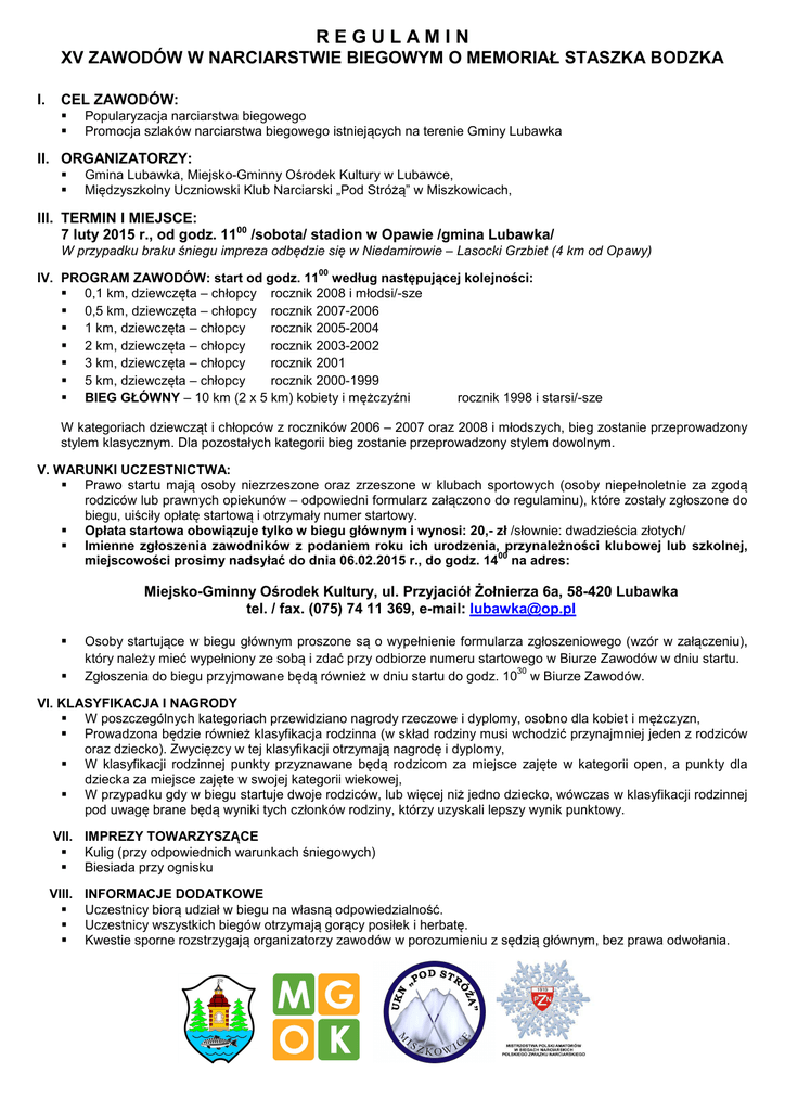 REGULAMIN XV ZAWODÓW W NARCIARSTWIE BIEGOWYM O MEMORIAŁ STASZKA BODZKA I. CEL ZAWODÓW: Popularyzacja narciarstwa biegowego Promocja szlaków narciarstwa biegowego istniejących na terenie Gminy Lubawka II. ORGANIZATORZY: Gmina Lubawka, Miejsko-Gminny Ośrodek Kultury w Lubawce, Międzyszkolny Uczniowski Klub Narciarski „Pod Stróżą” w Miszkowicach, III. TERMIN I MIEJSCE: 7 luty 2015 r., od godz. 1100 /sobota/ stadion w Opawie /gmina Lubawka/ W przypadku braku śniegu impreza odbędzie się w Niedamirowie – Lasocki Grzbiet (4 km od Opawy) 00 IV. PROGRAM ZAWODÓW: start od godz. 11 według następującej kolejności: 0,1 km, dziewczęta – chłopcy rocznik 2008 i młodsi/-sze 0,5 km, dziewczęta – chłopcy rocznik 2007-2006 1 km, dziewczęta – chłopcy rocznik 2005-2004 2 km, dziewczęta – chłopcy rocznik 2003-2002 3 km, dziewczęta – chłopcy rocznik 2001 5 km, dziewczęta – chłopcy rocznik 2000-1999 BIEG GŁÓWNY – 10 km (2 x 5 km) kobiety i mężczyźni rocznik 1998 i starsi/-sze W kategoriach dziewcząt i chłopców z roczników 2006 – 2007 oraz 2008 i młodszych, bieg zostanie przeprowadzony stylem klasycznym. Dla pozostałych kategorii bieg zostanie przeprowadzony stylem dowolnym. V. WARUNKI UCZESTNICTWA: Prawo startu mają osoby niezrzeszone oraz zrzeszone w klubach sportowych (osoby niepełnoletnie za zgodą rodziców lub prawnych opiekunów – odpowiedni formularz załączono do regulaminu), które zostały zgłoszone do biegu, uiściły opłatę startową i otrzymały numer startowy. Opłata startowa obowiązuje tylko w biegu głównym i wynosi: 20,- zł /słownie: dwadzieścia złotych/ Imienne zgłoszenia zawodników z podaniem roku ich urodzenia, przynależności klubowej lub szkolnej, 00 miejscowości prosimy nadsyłać do dnia 06.02.2015 r., do godz. 14 na adres: Miejsko-Gminny Ośrodek Kultury, ul. Przyjaciół Żołnierza 6a, 58-420 Lubawka tel. / fax. (075) 74 11 369, e-mail: [email protected] Osoby startujące w biegu głównym proszone są o wypełnienie formularza zgłoszeniowego (wzór w załączeniu), który należy mieć wypełniony ze sobą i zdać przy odbiorze numeru startowego w Biurze Zawodów w dniu startu. 30 Zgłoszenia do biegu przyjmowane będą również w dniu startu do godz. 10 w Biurze Zawodów. VI. KLASYFIKACJA I NAGRODY W poszczególnych kategoriach przewidziano nagrody rzeczowe i dyplomy, osobno dla kobiet i mężczyzn, Prowadzona będzie również klasyfikacja rodzinna (w skład rodziny musi wchodzić przynajmniej jeden z rodziców oraz dziecko). Zwycięzcy w tej klasyfikacji otrzymają nagrodę i dyplomy, W klasyfikacji rodzinnej punkty przyznawane będą rodzicom za miejsce zajęte w kategorii open, a punkty dla dziecka za miejsce zajęte w swojej kategorii wiekowej, W przypadku gdy w biegu startuje dwoje rodziców, lub więcej niż jedno dziecko, wówczas w klasyfikacji rodzinnej pod uwagę brane będą wyniki tych członków rodziny, którzy uzyskali lepszy wynik punktowy. VII. IMPREZY TOWARZYSZĄCE Kulig (przy odpowiednich warunkach śniegowych) Biesiada przy ognisku VIII. INFORMACJE DODATKOWE Uczestnicy biorą udział w biegu na własną odpowiedzialność. Uczestnicy wszystkich biegów otrzymają gorący posiłek i herbatę. Kwestie sporne rozstrzygają organizatorzy zawodów w porozumieniu z sędzią głównym, bez prawa odwołania. POZWOLENIE RODZICÓW/OPIEKUNÓW na start osoby niepełnoletniej (dziecka) ........................................................................................................................ FORMULARZ ZGŁOSZENIOWY dla startujących w biegu głównym 1. Imię: ……………………………………………………………………….………….. imię, nazwisko rodzica lub opiekuna prawnego 2. Nazwisko: …………………………………………………….………………..….. ........................................................................................................................ 3. Data urodzenia: ……………………………………………………………….. ........................................................................................................................ adres zamieszkania 4. Adres do korespondencji: …………………………………………..…………………………………..……………. Niniejszym wyrażam zgodę na start …………………………………………….……………………………………………..………. imię i nazwisko osoby niepełnoletniej (dziecka) w zawodach sportowych pn.: „XV Zawody w Narciarstwie Biegowym o Memoriał Staszka Bodzka”, organizowanych w dniu 7 lutego 2015 r. zgodnie z regulaminem zawodów. Oświadczam, iż zapoznałam/-em się z postanowieniami regulaminu zawodów oraz warunkami uczestnictwa w tej imprezie. Oświadczam, że wyrażam zgodę na przetwarzanie moich danych osobowych zawartych powyżej dla potrzeb niezbędnych do realizacji procesu zgłoszenia do uczestnictwa w zawodach (zgodnie z ustawą z dnia 29 sierpnia 1997 r. o ochronie danych osobowych). ……………………………………………………………..………………..……………. 5. Adres e-mail: …………………………………………..……………………..… 6. Miejscowość / Klub: ………………….……………………..………..……. Oświadczam, że wyrażam zgodę na przetwarzanie moich danych osobowych zawartych powyżej dla potrzeb niezbędnych do realizacji procesu zgłoszenia do uczestnictwa w zawodach (zgodnie z ustawą z dnia 29 sierpnia 1997 r. o ochronie danych osobowych). ................................... data i czytelny podpis zawodnika ................................... data i czytelny podpis rodzica / opiekuna Numer startowy: …………………………………………………………….