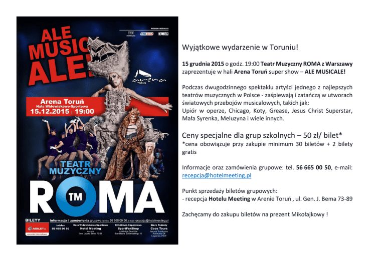 Wyjątkowe wydarzenie w Toruniu! 15 grudnia 2015 o godz. 19:00 Teatr Muzyczny ROMA z Warszawy zaprezentuje w hali Arena Toruń super show – ALE MUSICALE! Podczas dwugodzinnego spektaklu artyści jednego z najlepszych teatrów muzycznych w Polsce - zaśpiewają i zatańczą w utworach światowych przebojów musicalowych, takich jak: Upiór w operze, Chicago, Koty, Grease, Jesus Christ Superstar, Mała Syrenka, Meluzyna i wiele innych. Ceny specjalne dla grup szkolnych – 50 zł/ bilet* *cena obowiązuje przy zakupie minimum 30 biletów + 2 bilety gratis Informacje oraz zamówienia grupowe: tel. 56 665 00 50, e-mail: [email protected] Punkt sprzedaży biletów grupowych: - recepcja Hotelu Meeting w Arenie Toruń , ul. Gen. J. Bema 73-89 Zachęcamy do zakupu biletów na prezent Mikołajkowy !