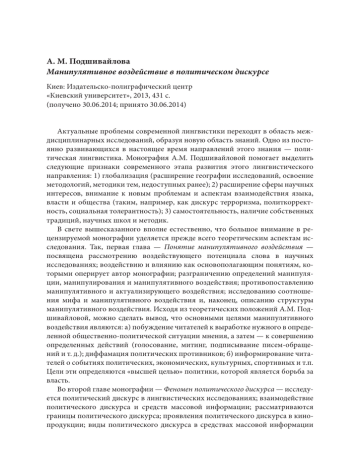 А. М. Подшивайлова Манипулятивное воздействие в политическом дискурсе Киев: Издательско-полиграфический центр «Киевский университет», 2013, 431 с. (получено 30.06.2014; принято 30.06.2014) Актуальные проблемы современной лингвистики переходят в область междисциплинарных исследований, образуя новую область знаний. Одно из постоянно развивающихся в настоящее время направлений этого знания — политическая лингвистика. Монография А.М. Подшивайловой помогает выделить следующие признаки современного этапа развития этого лингвистического направления: 1) глобализация (расширение географии исследований, освоение методологий, методики тем, недоступных ранее); 2) расширение сферы научных интересов, внимание к новым проблемам и аспектам взаимодействия языка, власти и общества (таким, например, как дискурс терроризма, политкорректность, социальная толерантность); 3) самостоятельность, наличие собственных традиций, научных школ и методик. В свете вышесказанного вполне естественно, что большое внимание в рецензируемой монографии уделяется прежде всего теоретическим аспектам исследования. Так, первая глава — Понятие манипулятивного воздействия — посвящена рассмотрению воздействующего потенциала слова в научных исследованиях; воздействию и влиянию как основополагающим понятиям, которыми оперирует автор монографии; разграничению определений манипуляции, манипулирования и манипулятивного воздействия; противопоставлению манипулятивного и актуализирующего воздействия; исследованию соотношения мифа и манипулятивного воздействия и, наконец, описанию структуры манипулятивного воздействия. Исходя из теоретических положений А.М. Подшивайловой, можно сделать вывод, что основными целями манипулятивного воздействия являются: а) побуждение читателей к выработке нужного в определенной общественно-политической ситуации мнения, а затем — к совершению определенных действий (голосование, митинг, подписывание писем-обращений и т. д.); диффамация политических противников; б) информирование читателей о событиях политических, экономических, культурных, спортивных и т.п. Цели эти определяются «высшей целью» политики, которой является борьба за власть. Во второй главе монографии — Феномен политического дискурса — исследуется политический дискурс в лингвистических исследованиях; взаимодействие политического дискурса и средств массовой информации; рассматриваются границы политического дискурса; проявления политического дискурса в кинопродукции; виды политического дискурса в средствах массовой информации 494Recenzje (в частности, выделяются: дискурс власти, оппозиционный дискурс, дискурс «иной / третьей силы»); анализируется тоталитаризм как политическое явление и его воплощение в языке прессы, в частности, аббревиатура как маркер языка тоталитаризма. Особенно ярко представлена в этом разделе монографии стратегия усиления в оппозиционном дискурсе, направленная на подчеркивание негативных сторон тех или иных общественно-политических фактов и явлений. В третьей главе, одной из самых значимых в исследовании, — Составляющие манипулятивного воздействия, — представлены слухи и их отражение в средствах массовой информации; комическое в политическом дискурсе; страх и воздействие посредством нагнетания страха; число в политическом дискурсе. С 