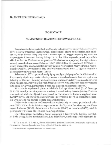 Bp JACEK JEZIERSKI, Olsztyn POSŁOWIE ZNACZENIE OBJAWIEŃ GIETRZWAŁDZKICH Warmińskie dziewczęta Barbara Samulowska i Justyna Szafryńska usłyszały w 1877 r. słowa przestrogi i napomnień, ale również i słowa pocieszenia: „nie smuć cie się, bo Ja zawsze będę przy was”1. Dziewczęta te przygotowywały się wówczas do przyjęcia I Komunii świętej. Miały 11 i 12 lat. Obie wyznały przed swymi bli skimi, wobec ks. Proboszcza Augustyna Weichsla oraz specjalnej komisji ustano wionej przez biskupa warmińskiego (1867-1885) Filipa Krementza († 1899), iż wi działy szczególną osobę. Identyfikowały ją jako Najświętszą Maryję Pannę Niepo kalanie Poczętą. Dwadzieścia trzy lata wcześniej papież Pius IX ogłosił dogmat o Niepokalanym Poczęciu Maryi (1854). Zdarzenia 1877 r. spowodowały żywy napływ pielgrzymów do Gietrzwałdu. Przyczyniły się do tego także relacje prasowe w trzech zaborach. Pod ich wpływem katolicy na Warmii i katolicy w diasporze na Mazurach, zdobyli się na odnowienie życia religijnego. Rozwinął się ruch trzeźwościowy. Na Mazurach zaczęto wznosić katolickie świątynie, korzystając z pomocy diecezji kolońskiej i innych.2 W stulecie wydarzeń gietrzwałdzkich Biskup Warmiński Józef Drzazga († 1978) uznał je za niesprzeczne z wiarą i moralnością chrześcijańską. Podczas uroczystości stulecia objawień maryjnych w Gietrzwałdzie kazanie wygłosił kard. Karol Wojtyła, abp metropolita krakowski (11 września 1977). Ta ważna teologicz nie wypowiedź nie została jeszcze przeanalizowana. Objawienia maryjne w Gietrzwałdzie wpisują się w szereg podobnych zda rzeń XIX i X X stulecia. Można wspomnieć tu choćby niektóre: dane np. św. Kata rzynie Laboure (1830), objawienia w La Salette (1846), w Lourdes (1858), a także późniejsze w Fatimie (1917) oraz nam współczesne. Dla właściwego odczytania treści objawień z Gietrzwałdu bardzo przydat ne będą uwagi, które zamieścił kard. Leo Scheffczyk, analizując treść objawień fa 1 B. T o m c z y k , S. R y ł k o , Siostra Miłosierdzia Barbara Stanisława Samulowska wizjonerka z Gietrzwałdu i inne osoby obdarzone łaską objawień, Kraków 1999, s. 20. 2 Tę działalność wspierał Związek św. Bonifacego. Bp JACEK JEZIERSKI 156 timskich.3 W stosunku do objawień, które wiążą się z osobą Jezusa, prawdziwe go człowieka i jedynego Syna Bożego (objawienie publiczne), objawienia maryj ne posiadają charakter niezobowiązujący, drugorzędny i podporządkowany (ob jawienia prywatne). Kard. L. Scheffczyk zauważa, iż często przesłanie maryjnych objawień prywat nych XIX i X X wieku jest uniwersalne.4 Bezpośrednimi świadkami i odbiorcami orędzia gietrzwałdzkiego było kilka osób. Dotyczyły one w pierwszym rzędzie pro blemów katolików warmińskich w państwie pruskim, gdzie dominowało wyzna nie luterańskie. Fenomen objawień maryjnych w języku polskim – rodzimym dla dużej części mieszkańców południowej Warmii – w Gietrzwałdzie, poruszył także głęboko katolików polskich trzech zaborów, a także część katolików Warmii o nie mieckiej świadomości narodowej. Kard. K. Wojtyła dostrzegł we wspomnianym już kazaniu uniwersalny charak ter orędzia z Gietrzwałdu. Mówił, bowiem, iż „Maryja na tym miejscu upomniała się o prawa człowieka i prawa narodu”.5 Orędzie maryjne bierze w obronę grupę katolików warmińskich, szczególnie polskojęzycznych, ograniczanych w ich pra wach przez ustawodawstwo państwowe po kulturkampfie. Inną cechą orędzia gietrzwałdzkiego jest jego anamnetyczny charakter. Nie sie ono, bowiem przypomnienie. Jest w nim wezwanie do pokuty i modlitwy, któ re występuje również np. w orędziu fatimskim. Objawienia gietrzwałdzkie mówią, że należy powrócić do wytrwałego praktykowania modlitwy, szczególnie rozwa żania tajemnic różańcowych. Nacisk pada tu na modlitwę prośby i przebłagania oraz modlitwę w intencji innych (wstawienniczą). „Widzące” Maryję w Gietrzwałdzie przekazywały swoim rodzinom i Kościo łowi wezwanie do pokuty oraz zmiany obyczajów. Było to przede wszystkim wo łanie o trzeźwość, a więc o wyzwolenie z uzależnienia alkoholowego. W orędziu gietrzwałdzkim nie ma objawienia nowych prawd religijnych. Jest natomiast przypomnienie istotnych wymagań Ewangelii, które w życiu chrześci jańskim często zanikają lub idą w zapomnienie. Objawienia maryjne w Gietrz wałdzie, tak jak objawienia analogiczne, są apelem o respektowanie i praktykowa nie całej, nie uszczuplonej w niczym Ewangelii.6 Stanowią mocne, pełne ekspre sji, a pod względem języka bardzo komunikatywne przypomnienie powinności 3 L. S c h e f f c z y k , Obietnica pokoju. Rozważania teologiczne wokół orędzia fatimskiego. T ł. L. B i czyk, Pallottinum 1995. 4 Tamże, s. 10. 5 K. W o j t y ł a , J a zawsze będę przy was”. Posłaniec Warmiński czyli Kalendarz Maryjny na rok 1988, Olsztyn 1987, s. 81-86; K. B r z o z o w s k i , S. B u d z y ń s k i , J. K o r c z , Sanktuarium M a ryjne w Gietrzwałdzie. 125. rocznica objawień NMP, Wydawnictwo „Adam”, Warszawa 2002. 6 L. S c h e f f c z y k , Obietnica pokoju, s. 11. ZNACZENIE OBJAWIEŃ GIETRZWAŁDZKICH 157 życia wg wskazań Jezusa Chrystusa i Kościoła, także tych trudnych i niepopular nych. Jest w orędziu gietrzwałdzkim wołanie o pełnię życia chrześcijańskiego, bez uproszczeń i namiastek. Orędzia objawień maryjnych XIX i XX wieku ukazują ideał życia chrześcijań skiego. Chodzi tu o pielęgnowanie daru wiary i zerwanie z grzechem. Tym samym niosą one krytykę niewłaściwych postaw. Są protestem wobec zastanej rzeczywi stości, obnażają ją i demaskują. Na tym polega właśnie ich rys profetyczny. Doty czy to również Gietrzwałdu. Kościół nie zobowiązuje nikogo do dawania wiary objawieniom prywatnym.7 Przyjmując jednak prawdziwość objawień maryjnych w Gietrzwałdzie można twier d