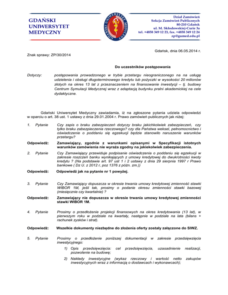 Dział Zamówień Sekcja Zamówień Publicznych 80-210 Gdańsk ul. M. Skłodowskiej-Curie 3a tel. +4858 349 12 23, fax. +4858 349 12 24 [email protected] GDAŃSKI UNIWERSYTET MEDYCZNY Gdańsk, dnia 06.05.2014 r. Znak sprawy: ZP/30/2014 Do uczestników postępowania Dotyczy: postępowania prowadzonego w trybie przetargu nieograniczonego na na usługę udzielenia i obsługi długoterminowego kredytu lub poŜyczki w wysokości 20 milionów złotych na okres 13 lat z przeznaczeniem na finansowanie inwestycji – tj. budowy Centrum Symulacji Medycznej wraz z adaptacją budynku pralni akademickiej na cele dydaktyczne. Gdański Uniwersytet Medyczny zawiadamia, iŜ na zgłoszone pytania udziela odpowiedzi w oparciu o art. 38 ust. 1 ustawy z dnia 29.01.2004 r. Prawo zamówień publicznych jak niŜej: Pytanie Czy zapis o braku zabezpieczeń dotyczy braku jakichkolwiek zabezpieczeń, czy tylko braku zabezpieczenia rzeczowego? czy dla Państwa weksel, pełnomocnictwo i oświadczenie o poddaniu się egzekucji będzie stanowiło naruszenie warunków przetargu? Odpowiedź: Zamawiający, zgodnie z warunkami opisanymi w Specyfikacji istotnych warunków zamówienia nie wyraŜa zgodny na jakiekolwiek zabezpieczenia. 2. Czy Zamawiający przewiduje podpisanie oświadczenia o poddaniu się egzekucji w zakresie roszczeń banku wynikających z umowy kredytowej do dwukrotności kwoty kredytu ? (Na podstawie art. 97 ust 1 i 2 ustawy z dnia 29 sierpnia 1997 r Prawo bankowe ( Dz U. z 2012 r, poz 1376 z póŜn. zm.)) 1. Pytanie Odpowiedź: Odpowiedź jak na pytanie nr 1 powyŜej. 3. Pytanie Czy Zamawiający dopuszcza w okresie trwania umowy kredytowej zmienność stawki WIBOR 1M, jeśli tak, prosimy o podanie okresu zmienności stawki bazowej (miesięcznie czy kwartalnie) ? Odpowiedź: Zamawiający nie dopuszcza w okresie trwania umowy kredytowej zmienności stawki WIBOR 1M. 4. Prosimy o przedłoŜenie projekcji finansowych na okres kredytowania (13 lat), w pierwszym roku w podziale na kwartały, następnie w podziale na lata (bilans + rachunek zysków i strat). Pytanie Odpowiedź: Wszelkie dokumenty niezbędne do złoŜenia oferty zostały załączone do SIWZ. 5. Prosimy o przedłoŜenie inwestycyjnego: Pytanie poniŜszej 1) Opis przedsięwzięcia: pozwolenie na budowę; cel dokumentacji w przedsięwzięcia, zakresie przedsięwzięcia uzasadnienie 2) Nakłady inwestycyjne (wykaz rzeczowy i wartość netto inwestycyjnych wraz z informacją o dostawcach i wykonawcach); realizacji, zakupów Dział Zamówień Sekcja Zamówień Publicznych 80-210 Gdańsk ul. M. Skłodowskiej-Curie 3a tel. +4858 349 12 23, fax. +4858 349 12 24 [email protected] GDAŃSKI UNIWERSYTET MEDYCZNY 3) Źródła finansowania, w tym sposób finansowania udziału własnego wraz z informacją o juŜ zgromadzonych środkach pienięŜnych i wydatkach poniesionych przed ogłoszeniem przetargu oraz o planowanych terminach wnoszenia udziału własnego; 4) Etapy realizacji przedsięwzięcia (terminy, zakres przedmiotowy); 5) Informacja o terminie oddania do eksploatacji przedmiotu przedsięwzięcia oraz osiągnięcia normalnego planowanego poziomu zdolności produkcyjnych. Odpowiedź: ad.1) ad.2) ad.3) ad.4) i ad.5) 6. Pytanie adaptacja budynku Pralni Akademickiej na cele dydaktyczne oraz budowa Centrum Symulacji Medycznej. Zamawiający posiada pozwolenie na budowę. wartość robót budowlanych, zgodnie z kosztorysem inwestorskim ok. 20 mln zł. udział własny: opracowanie dokumentacji projektowo-kosztorysowej. przewidywane okres realizacji budowy: 12 miesięcy od dnia podpisania umowy z generalnym Wykonawcą. Prosimy o wyraŜenie zgody na skrócenie okresu finansowania inwestycji z 13 do 10 lat. Odpowiedź: Zamawiający nie wyraŜa zgody na skrócenie okresu finansowania inwestycji. 7. W nawiązaniu do pkt. II.10., prosimy o potwierdzenie, Ŝe Zamawiający podda się dobrowolnie egzekucji w zakresie zobowiązań wynikających z umowy kredytu w trybie art. 97 ustawy Prawo Bankowe. Pytanie Odpowiedź: Odpowiedź jak na pytanie nr 1 powyŜej. 8. Pytanie Na potrzeby porównania ofert, prosimy Zamawiającego o podanie konkretnych terminów i kwoty uruchomienia poszczególnych transz kredytu, jak równieŜ ustalenie zasad obniŜania rat kredytu (patrz pkt. II.3.), albo przyjęcia, Ŝe raty te mają być spłacane w równych kwotach. Odpowiedź: Terminy i kwoty będą znane po rozstrzygnięciu postępowania przetargowego i podpisaniu umowy z Generalnym Wykonawcą. 9. Celem złoŜenia porównywalnych ofert, prosimy Zamawiającego o dołączenia do formularza ofert kalkulatora na potrzeby obliczenia naleŜności z tytułu kredyt. Pytanie Odpowiedź: Wszelkie dokumenty niezbędne do złoŜenia oferty zostały załączone do SIWZ. 10. Pytanie Czy Zamawiający dopuszcza dodatkowe nieruchomościach Zamawiającego. Odpowiedź: Odpowiedź jak na pytanie nr 1 powyŜej. 11. Pytanie Uprzejmie prosimy o udostępnienie prognoz finansowych (bilans, rachunek wyników i rachunek przepływów pienięŜnych) na okres objęty finansowaniem. Odpowiedź: Wszelkie dokumenty niezbędne do złoŜenia oferty zostały załączone do SIWZ zabezpieczenie kredytu np. na Dział Zamówień Sekcja Zamówień Publicznych 80-210 Gdańsk ul. M. Skłodowskiej-Curie 3a tel. +4858 349 12 23, fax. +4858 349 12 24 [email protected] GDAŃSKI UNIWERSYTET MEDYCZNY 12. Pytanie Czy Zamawiający wyraŜa zgodę na zabezpieczenie kredytu w postaci weksla in blanco wraz z deklaracją wekslową ? Odpowiedź: Odpowiedź jak na pytanie nr 1 powyŜej. 13. Pytanie Czy Zamawiający wyraŜa zgodę na złoŜenie oświadczenia o poddaniu się egzekucji? Odpowiedź: Odpowiedź jak na pytanie nr 1 powyŜej. 14. Pytanie Czy Zamawiający wyraŜa zgodę na udzielenie upowaŜnienia do rachunku bankowego pomocniczego otwartego w Banku, który wygra przetarg? Odpowiedź: Odpowiedź jak na pytanie nr 1 powyŜej. 15. Pytanie Czy Zamawiający wyraŜa zgodę na przedstawianie w okresie kredytowania kwartalnych sprawozdań finan
