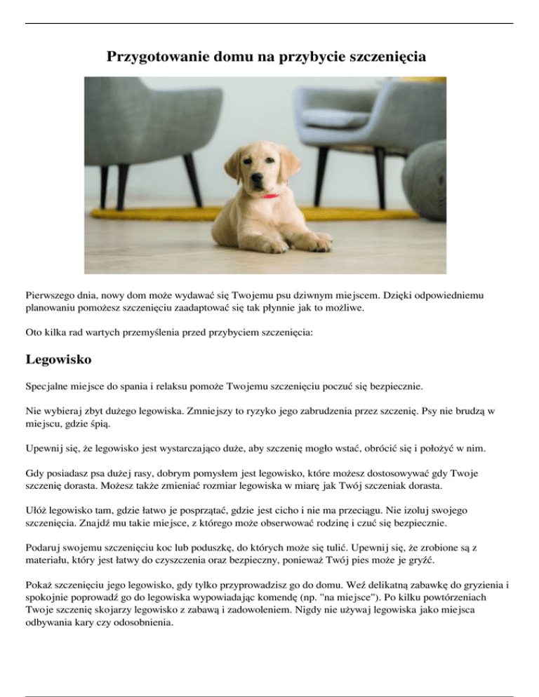 Przygotowanie domu na przybycie szczenięcia Pierwszego dnia, nowy dom może wydawać się Twojemu psu dziwnym miejscem. Dzięki odpowiedniemu planowaniu pomożesz szczenięciu zaadaptować się tak płynnie jak to możliwe. Oto kilka rad wartych przemyślenia przed przybyciem szczenięcia: Legowisko Specjalne miejsce do spania i relaksu pomoże Twojemu szczenięciu poczuć się bezpiecznie. Nie wybieraj zbyt dużego legowiska. Zmniejszy to ryzyko jego zabrudzenia przez szczenię. Psy nie brudzą w miejscu, gdzie śpią. Upewnij się, że legowisko jest wystarczająco duże, aby szczenię mogło wstać, obrócić się i położyć w nim. Gdy posiadasz psa dużej rasy, dobrym pomysłem jest legowisko, które możesz dostosowywać gdy Twoje szczenię dorasta. Możesz także zmieniać rozmiar legowiska w miarę jak Twój szczeniak dorasta. Ułóż legowisko tam, gdzie łatwo je posprzątać, gdzie jest cicho i nie ma przeciągu. Nie izoluj swojego szczenięcia. Znajdź mu takie miejsce, z którego może obserwować rodzinę i czuć się bezpiecznie. Podaruj swojemu szczenięciu koc lub poduszkę, do których może się tulić. Upewnij się, że zrobione są z materiału, który jest łatwy do czyszczenia oraz bezpieczny, ponieważ Twój pies może je gryźć. Pokaż szczenięciu jego legowisko, gdy tylko przyprowadzisz go do domu. Weź delikatną zabawkę do gryzienia i spokojnie poprowadź go do legowiska wypowiadając komendę (np. "na miejsce"). Po kilku powtórzeniach Twoje szczenię skojarzy legowisko z zabawą i zadowoleniem. Nigdy nie używaj legowiska jako miejsca odbywania kary czy odosobnienia. Obroża i smycz Upewnij się, że pierwsza obroża Twojego szczenięcia zrobiona jest z lekkiego nylonu lub skóry. Sprawdź, czy daje wystarczająco dużo miejsca na wzrost - powinna być na tyle duża, by zmieścić pod nią dwa palce. Załóż szczenięciu obrożę tak wcześnie, jak to możliwe. Będzie ona niezbędna, by nauczyć go chodzić na smyczy, co sprawi, że oboje będziecie cieszyć się bezpiecznym spacerem. Idealna do codziennego szkolenia i spacerów jest smycz o długości dwóch metrów i szerokości dostosowanej do wielkości psa (aby nie była zbyt ciężka). Miski Przygotuj dla Twojego szczenięcia oddzielne miski na wodę i jedzenie. Stal nierdzewna jest najlepsza i najłatwiejsza w czyszczeniu. Szukaj misek, które się łatwo nie przewracają. Zabawki Zabawa pomaga Twojemu szczenięciu uczyć się i skupić. Pomaga także w szkoleniu. Najlepsze są krótkie i częste okresy zabawy. Zabawki powinny być łatwe do gryzienia. Gryzienie pomaga Twojemu szczenięciu utrzymać zdrowe i czyste zęby. Wybierz zabawki stworzone dla szczeniąt, które nie mogą się rozbić, rozedrzeć czy zostać połknięte. Twarde piłki i nylonowe gryzaki są dobrymi zabawkami. Interaktywne kostki i piłki, do których możesz wrzucić granulki karmy dla szczeniąt wydobędą z Twojego psa naturalną ciekawość. Stare buty i ubrania to nie są najlepsze "zabawki" dla Twojego szczenięcia. Nie rozróżni, które buty są stare, a które nowe. Pielęgnacja Im wcześniej zaczniesz pielęgnację swojego szczenięcia, tym łatwiej uzna to za rutynę, która sprawi, że będzie się dobrze czuł i świetnie wyglądał. Czesanie utrzymuje jego sierść w czystości oraz dba o zdrowie skóry. Powoli przyzwyczajaj szczenię do kąpieli. Kąp szczenię tylko wtedy, gdy jest to potrzebne. Częste kąpiele wysuszają sierść i podrażniają delikatną skórę. Nie korzystaj z szamponów przeznaczonych dla ludzi, ani dorosłych ani niemowląt, tylko dla psów, dostosowane do rodzaju sierści Twojego ulubieńca. Produkty do pielęgnacji Kup szczotkę, która sprawi, że Twoje szczenię będzie świetnie wyglądać. Dla krótkowłosych ras kup szczotkę z naturalnego włosia lub rękawicę z gumowymi wypustkami. Dla szczenięcia rasy długowłosej upewnij się, że posiadasz wytrzymały metalowy grzebień o szeroko rozstawionych obrotowych ząbkach oraz trymer podszerstka. Rasy takie jak pudle czy spaniele raczej wymagają regularnych wizyt u psiego fryzjera. Zdrowie jamy ustnej Twojemu szczenięciu rosną stałe zęby około szóstego i siódmego miesiąca życia. Jednak mycie już na etapie tzw. zębów mlecznych pomoże mu przyzwyczaić się do tego zdrowego nawyku. Zacznij od delikatnego masażu palcami zębów i dziąseł Twojego szczenięcia. Następnie przemyj zewnętrzną stronę zębów gazikiem. Kiedy już przyzwyczai się do tego zabiegu, zastosuj szczoteczkę i pastę do zębów dla psów. Szczoteczka do zębów dla szczeniąt Specjalne szczoteczki i pasty do zębów dostępne są w sklepach zoologicznych lub u lekarzy weterynarii. Nie korzystaj z pasty do zębów dla ludzi, ponieważ może się pienić i powodować zaburzenia żołądkowe u psów. Mycie zębów każdego dnia zapobiega nadmiernemu nagromadzaniu się kamienia nazębnego, hamuje infekcje i chroni zdrowie jamy ustnej Twojego szczenięcia w trakcie jego rozwoju. Powered by TCPDF (www.tcpdf.org)