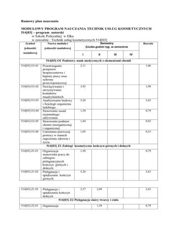 Ramowy plan nauczania MODUŁOWY PROGRAM NAUCZANIA TECHNIK USŁUG KOSMETYCZNYCH 514[03] – program autorski w Szkole Policealnej w Ełku w zawodzie : Technik usług kosmetycznych 514[03] Symbol Nazwa modułu i Semestry jednostki jednostki modułowej (Liczba godzin tyg. w semestrze modułowej I II Rocznie III IV 514[03] O1 Podstawy nauk medycznych z elementami chemii 514[03] O1.01 514[03] O1.02 514[03] O1.03 514[03] O1.04 514[03] O1.05 514[03] O1.06 514[03] Z1.01 514[03] Z1.02 2,11 Przestrzeganie przepisów bezpieczeństwa i higieny pracy oraz ochrony przeciwpożarowej 3,95 Nawiązywanie i utrzymywanie kontaktów międzyludzkich 5,26 Analizowanie budowy i fizjologii organizmu ludzkiego 1,58 Stosowanie zasad racjonalnego odżywiania 1,84 Stosowanie podstaw chemii nieorganicznej i organicznej 1,05 Udzielanie pierwszej pomocy w stanach zagrożenia zdrowia i życia. 514[03] Z1 Zabiegi kosmetyczne kończyn górnych i dolnych Organizacja stanowiska pracy do zabiegów pielęgnacyjnych kończyn górnych i dolnych. Pielęgnacja i upiększanie kończyn górnych. 1,06 1,98 2,63 0,79 0,92 0,53 1,58 0,79 5,26 2,63 514[03] Z1.03 2,37 2,89 Pielęgnacja i upiększanie kończyn dolnych 514[03] Z2 Pielęgnacja skóry twarzy i ciała 514[03] Z2.01 Organizacja 1,58 2,63 0,79 514[03] Z2.02 514[03] Z2.03 514[03]Z2.04 514[03] Z2.05 514[03]Z2.06 514[03] Z3.01 514[03] Z3.02 514[03] Z3.03 stanowiska pracy do zabiegów kosmetycznych. 4,21 Kosmetyczny masaż ciała. 2,89 Wykorzystanie zabiegów cieplnych i światła w kosmetyce. 4,21 Sporządzanie preparatów kosmetycznych do pielęgnacji skóry. 2,38 Pielęgnacja oczu i ich oprawy. 6,84 Pielęgnacja skóry twarzy, szyi dekoltu. 514[03] Z3 Kosmetyka lecznicza 2,11 1,45 2,11 1,19 3,42 4,21 Rodzaje defektów i chorób skóry. 5 Zastosowanie prądu i ultradźwięków w kosmetyce. 10,47 Pielęgnacja skóry zmienionej chorobowo. 514[03] Z4 Makijaż z elementami wizażu 514[03]Z4.01 Wykonanie makijażu. 514[03]Z4.02 Zdobienie ciała. 514[03]Z4.03 Sporządzanie preparatów kosmetycznych do upiększania. 514[03] Z5 Prowadzenie działalności zawodowej 514[03] Z5.01 Zakładanie działalności gospodarczej. Przygotowanie oferty i cennika usług kosmetycznych. Prowadzenie marketingu usług. Zawodowy język obcy. Wychowanie fizyczne 514[03] Z5.02 514[03] Z5.03 514[03]Z5.04 Razem 2,63 Wykonanie zabiegów z zakresu kosmetyki 2,5 5,24 3,84 3,24 2,69 1,35 5 2,5 4,61 2,31 2,69 1,35 1,92 0,96 4,25 3,47 3 3 3 3 6 28 28 28 28 50 514[03] Z6 Praktyka zawodowa – 140 g (4 tygodnie) 514[03] Z6.01 2,11 514[03] Z6.02 514[03] Z6.03 pielęgnacyjnej. Wykonanie zabiegów z zakresu kosmetyki leczniczej. Wykonanie zabiegów z zakresu kosmetyki upiększającej. Semestr IV