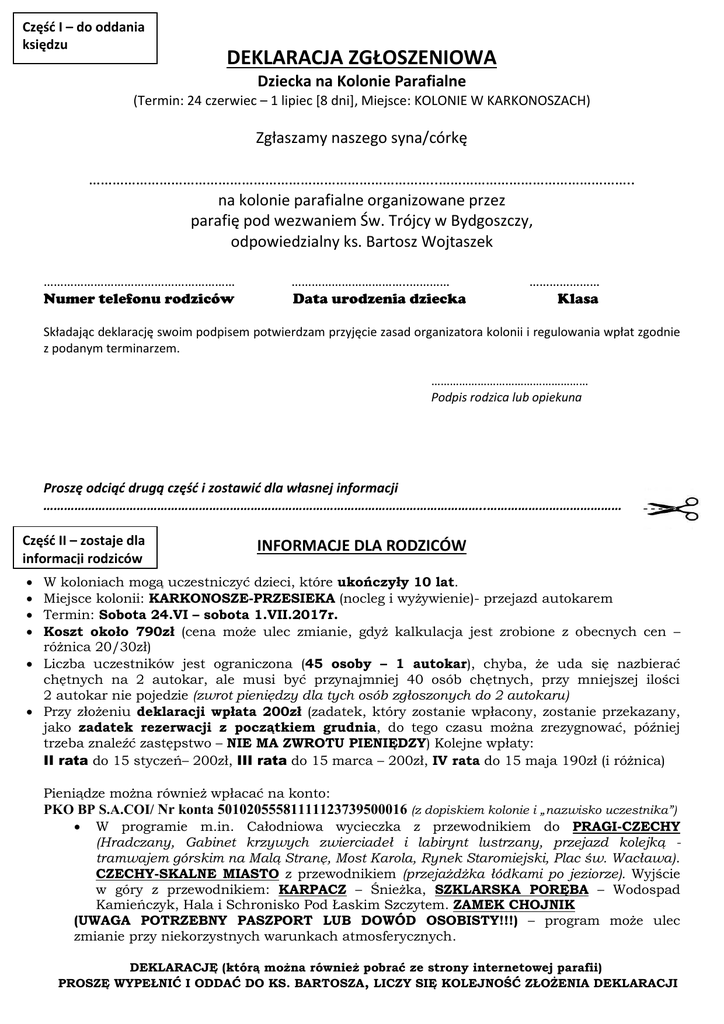 Część I – do oddania księdzu DEKLARACJA ZGŁOSZENIOWA Dziecka na Kolonie Parafialne (Termin: 24 czerwiec – 1 lipiec [8 dni], Miejsce: KOLONIE W KARKONOSZACH) Zgłaszamy naszego syna/córkę ……………………………………………………………………………..………………………………………….. na kolonie parafialne organizowane przez parafię pod wezwaniem Św. Trójcy w Bydgoszczy, odpowiedzialny ks. Bartosz Wojtaszek ………………………………………………… Numer telefonu rodziców ……………………………..………… Data urodzenia dziecka ………………… Klasa Składając deklarację swoim podpisem potwierdzam przyjęcie zasad organizatora kolonii i regulowania wpłat zgodnie z podanym terminarzem. …………………………………………… Podpis rodzica lub opiekuna Proszę odciąć drugą część i zostawić dla własnej informacji ………………………………………………………………………………………………………………..………………………………… Część II – zostaje dla informacji rodziców INFORMACJE DLA RODZICÓW W koloniach mogą uczestniczyć dzieci, które ukończyły 10 lat. Miejsce kolonii: KARKONOSZE-PRZESIEKA (nocleg i wyżywienie)- przejazd autokarem Termin: Sobota 24.VI – sobota 1.VII.2017r. Koszt około 790zł (cena może ulec zmianie, gdyż kalkulacja jest zrobione z obecnych cen – różnica 20/30zł) · Liczba uczestników jest ograniczona (45 osoby – 1 autokar), chyba, że uda się nazbierać chętnych na 2 autokar, ale musi być przynajmniej 40 osób chętnych, przy mniejszej ilości 2 autokar nie pojedzie (zwrot pieniędzy dla tych osób zgłoszonych do 2 autokaru) · Przy złożeniu deklaracji wpłata 200zł (zadatek, który zostanie wpłacony, zostanie przekazany, jako zadatek rezerwacji z początkiem grudnia, do tego czasu można zrezygnować, później trzeba znaleźć zastępstwo – NIE MA ZWROTU PIENIĘDZY) Kolejne wpłaty: II rata do 15 styczeń– 200zł, III rata do 15 marca – 200zł, IV rata do 15 maja 190zł (i różnica) · · · · Pieniądze można również wpłacać na konto: PKO BP S.A.COI/ Nr konta 50102055581111123739500016 (z dopiskiem kolonie i „nazwisko uczestnika”) · W programie m.in. Całodniowa wycieczka z przewodnikiem do PRAGI-CZECHY (Hradczany, Gabinet krzywych zwierciadeł i labirynt lustrzany, przejazd kolejką tramwajem górskim na Malą Stranę, Most Karola, Rynek Staromiejski, Plac św. Wacława). CZECHY-SKALNE MIASTO z przewodnikiem (przejażdżka łódkami po jeziorze). Wyjście w góry z przewodnikiem: KARPACZ – Śnieżka, SZKLARSKA PORĘBA – Wodospad Kamieńczyk, Hala i Schronisko Pod Łaskim Szczytem. ZAMEK CHOJNIK (UWAGA POTRZEBNY PASZPORT LUB DOWÓD OSOBISTY!!!) – program może ulec zmianie przy niekorzystnych warunkach atmosferycznych. DEKLARACJĘ (którą można również pobrać ze strony internetowej parafii) PROSZĘ WYPEŁNIĆ I ODDAĆ DO KS. BARTOSZA, LICZY SIĘ KOLEJNOŚĆ ZŁOŻENIA DEKLARACJI