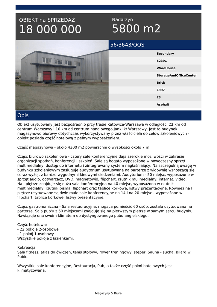 OBIEKT na SPRZEDAŻ 18 000 000 Nadarzyn 5800 m2 56/3643/OOS Secondary 52391 WareHouse StorageAndOfficeCenter Brick 1997 23 Asphalt Opis Obiekt usytuowany jest bezpośrednio przy trasie Katowice-Warszawa w odległości 23 km od centrum Warszawy i 10 km od centrum handlowego Janki k/ Warszawy. Jest to budynek magazynowo biurowy dotychczas wykorzystywany przez właściciela do cełów szkoleniowych obiekt posiada część hotelową z pełnym wyposażeniem. Część magazynowa - około 4300 m2 powierzchni o wysokości około 7 m. Część biurowo szkoleniowa - cztery sale konferencyjne dają szerokie możliwości w zakresie organizacji spotkań, konferencji i szkoleń. Sale są bogato wyposażone w nowoczesny sprzęt multimedialny, dostęp do internetu i zintegrowany system nagłaśniający. Na szczególną uwagę w budynku szkoleniowym zasługuje audytorium usytuowane na parterze z widownią wznoszącą się coraz wyżej, z bardzo wygodnymi kinowymi siedzeniami. Audytorium - 50 miejsc, wyposażone w sprzęt audio, odtwarzacz, DVD, magnetowid, flipchart, rzutnik mulimedialny, internet, video. Na I piętrze znajduje się duża sala konferencyjna na 40 miejsc, wyposażona w rzutnik multimedialny, rzutnik pisma, flipchart oraz tablice korkowe, listwy prezentacyjne. Również na I piętrze usytuowane są dwie małe sale konferencyjne na 14 i na 20 miejsc - wyposażone w flipchart, tablice korkowe, listwy prezentacyjne. Część gastronomiczna - Sala restauracyjna, mogąca pomieścić 60 osób, została usytuowana na parterze. Sala pub'u z 60 miejscami znajduje się na pierwszym piętrze w samym sercu budynku. Nawiązuje ona swoim klimatem do dystyngowanego pubu angielskiego. Część hotelowa: - 22 pokoje 2-osobowe - 1 pokój 1-osobowy Wszystkie pokoje z łazienkami. Rekreacja: Sala fitness, atlas do ćwiczeń, tenis stołowy, rower treningowy, steper. Sauna - sucha. Bilard w Pubie. Wszystkie sale konferencyjne, Restauracja, Pub, a także część pokoi hotelowych jest klimatyzowana. Magazyny & Biura Całość na działce o powierzchni 5,2 ha. Sprzedaż lub opcja wynajmu całego lub części obiektu. Oferowana cena sprzedaży jest zwolniona z podatku VAT. Agencja nie pobiera prowizji od Klienta poszukującego. Wynagrodzenie Agencji Magazyny&Biura pokrywa wyłącznie Właściciel Nieruchomości. Informacje zawarte w niniejszym ogłoszeniu nie stanowią oferty w rozumieniu art. 66 § 1 Kodeksu Cywilnego. Andrzej Markiewicz tel. 603 128 212 email: [email protected] Magazyny & Biura Powered by TCPDF (www.tcpdf.org)