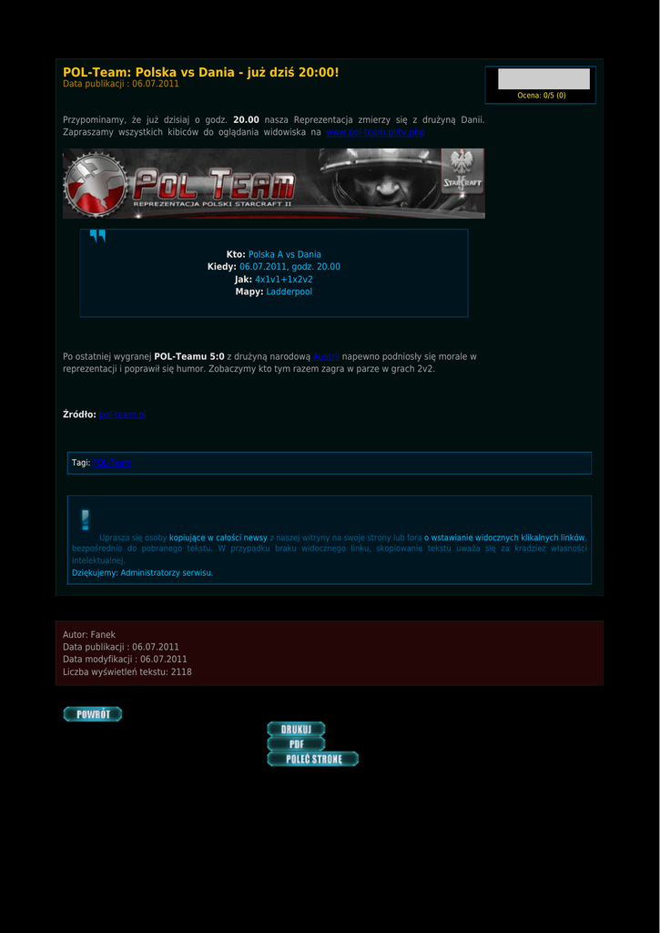 POL-Team: Polska vs Dania - już dziś 20:00! Data publikacji : 06.07.2011 Ocena: 0/5 (0) Przypominamy, że już dzisiaj o godz. 20.00 nasza Reprezentacja zmierzy się z drużyną Danii. Zapraszamy wszystkich kibiców do oglądania widowiska na www.pol-team.pl/tv.php Kto: Polska A vs Dania Kiedy: 06.07.2011, godz. 20.00 Jak: 4x1v1+1x2v2 Mapy: Ladderpool Po ostatniej wygranej POL-Teamu 5:0 z drużyną narodową Austrii napewno podniosły się morale w reprezentacji i poprawił się humor. Zobaczymy kto tym razem zagra w parze w grach 2v2. Źródło: pol-team.pl Tagi: POL-Team Uprasza się osoby kopiujące w całości newsy z naszej witryny na swoje strony lub fora o wstawianie widocznych klikalnych linków, bezpośrednio do pobranego tekstu. W przypadku braku widocznego linku, skopiowanie tekstu uważa się za kradzież własności intelektualnej. Dziękujemy: Administratorzy serwisu. Autor: Fanek Data publikacji : 06.07.2011 Data modyfikacji : 06.07.2011 Liczba wyświetleń tekstu: 2118 Komentarz (10) dodaj komentarz hej. nie dam rady obejrzeć pojedynku na zywo poprzez stream. gdzie będzie można zobaczyć powtórkę? na hdstarcraft, huskystarcraft czy day9tv pewnie nie :P ...~cosiu 2011/07/06 17:57 a Action Jesus będzie? xD~Kris7 2011/07/06 18:32 gl gg~czyzy 2011/07/06 19:39 A już miałem do Was pisać i przypomnieć. Taki event a tu news ledwie parę godzin przed? No ładnie... :]~DesoloAnimus 2011/07/06 19:39 Pisaliśmy wczoraj przy okazji wiadomości o wygranej z Austrią ;)~Phoenix Battlenet Network 2011/07/06 20:10 Tyle że o meczu z Austrią to był tylko news z wynikami. Podczas wyborów Pentagram o braku infa zwalił trochę na was. Fakt forum podupadło ale newsy szczególnie jak ten ostatni z występów Polaków by się przydały, żebym jeszcze miał po co trzymać Wasz portal na głównej stronie do wybierania w operze Jest gdzieś stream ?~marcqk 2011/07/06 20:15 Na stronie POL-Teamu: http://pol-team.pl/tv.php~Phoenix Battlenet Network 2011/07/06 20:40 dzięki. Fakt słabo widoczne to było ale się doczytałem~marcqk 2011/07/06 20:44 ale gra Nerchio v Ciara świetne ZvZ, must see!~Fanek 2011/07/06 22:05 ~Phoenix: pisaliście... co nie zmienia faktu,że gdzie jak gdzie ale na "Oficjalnej stronie fanowskiej o StarCraftcie 2" wspieranej przez Battlenet i z "błogosławieństwem" Blizzard Entertainment powinna wyszczególniona i podana odpowiednio wcześniej informacja o meczu narodowej reprezentacji. Mylę się? PS. Nie czepiam się, jeno zwracam uwagę na niedopatrzenie :). Może dobrze nawet wyszło bo w ciry dostaliśmy... :/~ DesoloAnimus 2011/07/06 23:54 dodaj komentarz 08.10.2015 Kampania "Szepty o zagładzie" dostępna za darmo (0 komentarzy) 27.09.2015 Kolejni bohaterowie w trybie Sprzymierzonych Dowódców (0 komentarzy) 22.09.2015 Cyfrowe gadżety za udział w BlizzCon 2015 (0 komentarzy) 15.07.2015 Legacy of the Void dostępne w przedsprzedaży! (0 komentarzy) 17.06.2015 Informacje z E3 - prolog kampanii Legacy of the Void (0 komentarzy) 30.05.2015 WCS Europe - sobota (30 maja) 18.00 grupa G - MaNa! (0 komentarzy) 07.05.2015 DreamHack Open France 2015 - już 8 maja - MaNa! (0 komentarzy) 03.05.2015 Na wesoło: postacie E-sportu 50 (0 komentarzy) 03.05.2015 IEM Katowice 2015 - jeszcze raz! (0 komentarzy) 03.05.2015 KeSPA Cup 2015 Season 1 - live! (0 komentarzy) 26.04.2015 Proleague - Top5 gier miesiąca (0 komentarzy) 26.04.2015 CJ Entus wygrywa 2 runde Proleague! (0 komentarzy) 18.04.2015 Wersja beta Legacy of the Void – aktualizacja 2.5.1 (0 komentarzy) 18.04.2015 WCS finals 2015 - galeria (0 komentarzy) 18.04.2015 Omówienie zmian w balansie Legacy of the Void (0 komentarzy) 11.04.2015 WCS Europe kwalifikacje z Polakami - dziś (sobota) 18.00 (0 komentarzy) 11.04.2015 Aktualizacja balansu Heart of the Swarm – 9 kwietnia (0 komentarzy) 11.04.2015 GSL Season1 2015 - galeria (0 komentarzy) 11.04.2015 Zbanowane konta w StarCraft II (0 komentarzy) 04.04.2015 Red Bull Battle Grounds powraca jesienią 2015 (0 komentarzy) (zobacz wszystkie)