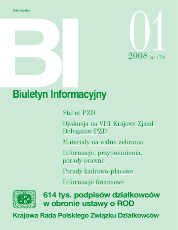 01 ISSN 1640-5854 2008 /nr 178/ Biuletyn Informacyjny Statut PZD Dyskusja na VIII Krajowy Zjazd Delegatów PZD Materiały na walne zebrania Informacje, przypomnienia, porady prawne Porady kadrowo-płacowe Informacje finansowe 614 tys. podpisów działkowców w obronie ustawy o ROD Krajowa Rada Polskiego Związku Działkowców SPIS TREŚCI I. Znowelizowany Statut PZD. . . . . . . . . . . . . . 1 II. VIII KRAJOWY ZJAZD DELEGATÓW PZD . . . . . . 23 IV. PRZYPOMNIENIA I INFORMACJE. . . . . . . . . . . .47 1. Konferencja delegatów w ROD . . . . . . . . . . . . . . . . . . . . . . . . . . . . . . . . . . . . . . 47 1. Minister Środowiska, Pan Maciej Nowicki . . . . . . . . . . . . . . . . . . . . . . . . . . . . . 23 2. Omówienie dyskusji. . . . . . . . . . . . . . . . . . . . . . . . . . . . . . . . . . . . . . . . . . . . . . . 24 A. Przemówienia wygłoszone. . . . . . . . . . . . . . . . . . . . . . . . . . . . . . . . . . . . . . . . 24 Wiesław Sawicki . . . . . . . . . . . . . . . . . . . . . . . . . . . . . . . . . . . . . . . . . . . . . . . . . 24 Józef Gałczyński . . . . . . . . . . . . . . . . . . . . . . . . . . . . . . . . . . . . . . . . . . . . . . . . . 24 Janusz Moszkowski. . . . . . . . . . . . . . . . . . . . . . . . . . . . . . . . . . . . . . . . . . . . . . . 25 Andrzej Cwojdziński. . . . . . . . . . . . . . . . . . . . . . . . . . . . . . . . . . . . . . . . . . . . . . 25 Maria Klimków . . . . . . . . . . . . . . . . . . . . . . . . . . . . . . . . . . . . . . . . . . . . . . . . . . 26 Jerzy Teluk. . . . . . . . . . . . . . . . . . . . . . . . . . . . . . . . . . . . . . . . . . . . . . . . . . . . . . 26 Wojciech Lewandowski. . . . . . . . . . . . . . . . . . . . . . . . . . . . . . . . . . . . . . . . . . . . 27 Jan Kut. . . . . . . . . . . . . . . . . . . . . . . . . . . . . . . . . . . . . . . . . . . . . . . . . . . . . . . . . 27 Stanisław Szczepanik. . . . . . . . . . . . . . . . . . . . . . . . . . . . . . . . . . . . . . . . . . . . . . 28 B. Wystąpienia zgłoszone do protokołu. . . . . . . . . . . . . . . . . . . . . . . . . . . . . . . . 28 Daniel Paciukanis. . . . . . . . . . . . . . . . . . . . . . . . . . . . . . . . . . . . . . . . . . . . . . . . . 28 Romuald Nocuń. . . . . . . . . . . . . . . . . . . . . . . . . . . . . . . . . . . . . . . . . . . . . . . . . . 28 Henryk Sobański . . . . . . . . . . . . . . . . . . . . . . . . . . . . . . . . . . . . . . . . . . . . . . . . . 29 Barbara Karolczuk. . . . . . . . . . . . . . . . . . . . . . . . . . . . . . . . . . . . . . . . . . . . . . . . 29 Józef Kasprzak. . . . . . . . . . . . . . . . . . . . . . . . . . . . . . . . . . . . . . . . . . . . . . . . . . . 29 Czesław Kozikowski . . . . . . . . . . . . . . . . . . . . . . . . . . . . . . . . . . . . . . . . . . . . . . 29 Jerzy Dzikowicz. . . . . . . . . . . . . . . . . . . . . . . . . . . . . . . . . . . . . . . . . . . . . . . . . . 30 Elżbieta Thomas. . . . . . . . . . . . . . . . . . . . . . . . . . . . . . . . . . . . . . . . . . . . . . . . . . 30 Piotr Wilms. . . . . . . . . . . . . . . . . . . . . . . . . . . . . . . . . . . . . . . . . . . . . . . . . . . . . . 30 Marian Rosiński. . . . . . . . . . . . . . . . . . . . . . . . . . . . . . . . . . . . . . . . . . . . . . . . . . 30 Józefa Romanowskiego. . . . . . . . . . . . . . . . . . . . . . . . . . . . . . . . . . . . . . . . . . . . 30 Mieczysław Górski. . . . . . . . . . . . . . . . . . . . . . . . . . . . . . . . . . . . . . . . . . . . . . . . 31 Zbigniew Rodak. . . . . . . . . . . . . . . . . . . . . . . . . . . . . . . . . . . . . . . . . . . . . . . . . . 31 Józef Kwiatkowski. . . . . . . . . . . . . . . . . . . . . . . . . . . . . . . . . . . . . . . . . . . . . . . . 31 Jan Kamiński. . . . . . . . . . . . . . . . . . . . . . . . . . . . . . . . . . . . . . . . . . . . . . . . . . . . 31 Antonina Boroń. . . . . . . . . . . . . . . . . . . . . . . . . . . . . . . . . . . . . . . . . . . . . . . . . . 32 C. Dyskusja w grupach. . . . . . . . . . . . . . . . . . . . . . . . . . . . . . . . . . . . . . . . . . . . . 32 1. Temat grupy: Przyszłość ustawy o ROD i ruchu ogrodnictwa działkowego w Polsce. . . . . . . . . . . . . . . . . . . . . . . . . . . . . . . . . . . . . . . . . . . . 32 2. Temat grupy – Stan prawny ogrodów działkowych. Polityka Związku w tej sprawie. . . . . . . . . . . . . . . . . . . . . . . . . . . . . . . . . . . . . . . . . . . . . . . . . . . 34 3. Temat grupy: Zagospodarowanie i modernizacja działek i ogrodów. Oświata ogrodnicza i ekologia. . . . . . . . . . . . . . . . . . . . . . . . . . . . . . . . . . . . . 35 4. Temat Grupy – Ekonomiczne podstawy funkcjonowania Związku. . . . . . . . . 36 5. Temat grupy – Promocja ruchu ogrodnictwa działkowego. . . . . . . . . . . . . . . 37 6. Temat grupy: Ocena Statutu PZD. Wnioski. . . . . . . . . . . . . . . . . . . . . . . . . . . 38 7. Temat grupy – Zarządzanie Związkiem i funkcjonowanie jego struktur. . . . . 40 8. Temat grupy: Porządek i bezpieczeństwo w ROD. . . . . . . . . . . . . . . . . . . . . . 41 2. Składka członkowska w 2008 r.. . . . . . . . . . . . . . . . . . . . . . . . . . . . . . . . . . . . . . 47 III. Z PRAC PREZYDIUM KR PZD. . . . . . . . . . . . . . 42 2. Dieta – 23 zł. . . . . . . . . . . . . . . . . . . . . . . . . . . . . . . . . . . . . . . . . . . . . . . . . . . . . 58 1. Prezydium KR PZD: . . . . . . . . . . . . . . . . . . . . . . . . . . . . . . . . . . . . . . . . . . . . . . 42 a) w dniu 27 listopada 2007 r. . . . . . . . . . . . . . . . . . . . . . . . . . . . . . . . . . . . . . . . 42 b) w dniu 28 grudnia 2007 r. . . . . . . . . . . . . . . . . . . . . . . . . . . . . . . . . . . . . . . . . 43 2. Dotacje dla ROD. . . . . . . . . . . . . . . . . . . . . . . . . . . . . . . . . . . . . . . . . . . . . . . . . . 44 • UCHWAŁA NR 194/2007 Prezydium KR PZD z dnia 27 listopada 2007 r. w sprawie przyznania dotacji na inwestycje i remonty ś