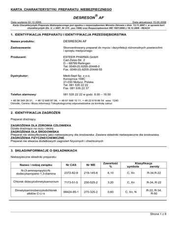 KARTA CHARAKTERYSTYKI PREPARATU NIEBEZPIECZNEGO ® DESRESON AF Data wydania 02.12.2005 Data aktualizacji 15.05.2008 Karta Charakterystyki Preparatu Niebezpiecznego jest zgodna z rozporządzeniem Ministra Zdrowia z dnia 13.11.2007 r. w sprawie kart charakterystyki (Dz. U. z 2007, Nr 215 , poz.1588) oraz Rozporządzeniem WE 1907/2006 z 18.12.2006 - REACH 1. IDENTYFIKACJA PREPARATU I IDENTYFIKACJA PRZEDSIĘBIORSTWA Nazwa produktu: DESRESON AF Zastosowanie: Skoncentrowany preparat do mycia i dezynfekcji różnorodnych powierzchni i sprzętu medycznego Producent: ESTEER PHARMA GmbH Carl-Zeiss-Str. 2 D – 68799 Reilingen Tel. 0049-(0) 6205-20448-0 Fax. 0049-(0) 6205-20448-55 Dystrybutor: Medi-Sept Sp. z o.o. Konopnica 159C 21-030 Motycz, Polska Tel. 081 535 22 22 Fax. 081 535 22 37 Telefon alarmowy: 081 535 22 22 w godz. 8.00 – 16.00 + 48 58 349 28 31, + 48 12 646 87 06, + 48 61 848 10 11, + 48 22 619 66 54 wew. 1240 Ośrodki, Centra i Biura Informacji Toksykologicznej odpowiedzialne za kontrolę zatruć 2. IDENTYFIKACJA ZAGROŻEŃ Preparat drażniący. ZAGROŻENIA DLA ZDROWIA CZŁOWIEKA Działa drażniąco na oczy i skórę. ZAGROŻENIA DLA ŚRODOWISKA Preparat nie sklasyfikowany jako niebezpieczny dla środowiska. Zawiera składniki niebezpieczne dla środowiska. ZAGROŻENIA FIZYCZNE/CHEMICZNE Preparat nie stwarza dodatkowych zagrożeń fizycznych i chemicznych 3. SKŁAD/INFORMACJE O SKŁADNIKACH Niebezpieczne składniki preparatu: Nazwa / rodzaj związku Nr CAS Nr WE Zawartość % Klasyfikacja symbole zwroty N-(3-aminopropylo)-Ndodecylopropano-1,3-diamina 2372-82-9 219-145-8 6,10 C, Xn R-34,R-22 Chlorek didecylodimetyloamonium 7173-51-5 230-525-2 3,20 C, Xn R-34, R-22 Dimetyloaminobenzylodichlorek alkilów C12-16 68424-85-1 270-325-2 0,60 C, Xn, N R-22, R-34, R-50 Strona 1 z 8 KARTA CHARAKTERYSTYKI PREPARATU NIEBEZPIECZNEGO ® DESRESON AF Data wydania 02.12.2005 Data aktualizacji 15.05.2008 Karta Charakterystyki Preparatu Niebezpiecznego jest zgodna z rozporządzeniem Ministra Zdrowia z dnia 13.11.2007 r. w sprawie kart charakterystyki (Dz. U. z 2007, Nr 215 , poz.1588) oraz Rozporządzeniem WE 1907/2006 z 18.12.2006 - REACH 4. PIERWSZA POMOC W PRZYPADKU KONTAKTU ZE SKÓRĄ Zdjąć zanieczyszczoną odzież, umyć zabrudzoną skórę wodą z mydłem, spłukać dokładnie wodą, w razie potrzeby skontaktować się z lekarzem. W PRZYPADKU KONTAKTU Z OCZAMI Przepłukać oczy przez kilka minut (ok. 15) dużą ilością wody, trzymając powieki szeroko rozwarte. Unikać silnego strumienia, ze względu na niebezpieczeństwo uszkodzenia rogówki, natychmiast skontaktować się z lekarzem. NARAŻENIE INHALACYJNE W razie zawrotów głowy lub nudności wyprowadzić poszkodowanego na świeże powietrze, w razie braku szybkiej poprawy zasięgnąć porady lekarza. W PRZYPADKU POŁKNIĘCIA Nie wywoływać wymiotów, przepłukać usta, podać do wypicia wodę, skontaktować się z lekarzem. 5. POSTĘPOWANIE W PRZYPADKU POŻARU PODSTAWOWE ZASADY POSTĘPOWANIA Preparat trudnopalny. Pojemniki znajdujące się w strefie pożaru chłodzić rozproszonym strumieniem wody, o ile jest to możliwe usunąć ze strefy zagrożenia. Nie należy przebywać w strefie pożaru bez odpowiedniego ubrania odpornego na działanie chemikaliów oraz aparatu do oddychania z niezależnym obiegiem powietrza. Nie dopuszczać do przedostania się wody gaśniczej do wód powierzchniowych, gruntowych i kanalizacji. ZALECANE ŚRODKI GAŚNICZE Piana alkoholoodporna lub suche proszki gaśnicze, dwutlenek węgla (gaśnica śniegowa), piasek lub ziemia, mgła wodna. Stosować metody gaśnicze odpowiednie do warunków otoczenia. NIEODPOWIEDNIE ŚRODKI GAŚNICZE Silny strumień wody, unikać stosowania halonów, aby nie skażać środowiska. Środki ochrony indywidualnej dla strażaków: w przypadku pożaru w zamkniętym pomieszczeniu należy stosować odzież ochronną i aparat oddechowy na sprężone powietrze. 6. POSTĘPOWANIE W PRZYPADKU NIEZAMIERZONEGO UWOLNIENIA DO ŚRODOWISKA Zawiadomić o awarii odpowiednie służby. Usunąć z obszaru zagrożenia osoby niebiorące udziału w likwidacji awarii. INDYWIDUALNE ŚRODKI OSTROŻNOŚCI Zadbać o wystarczające wietrzenie, stosować rękawice ochronne z kauczuku butylowego, gumy nitrylowej lub neoprenu, stosować kauczukowe obuwie ochronne oraz ubranie ochronne, stosować okulary ochronne lub maskę zabezpieczającą twarz w przypadku możliwości rozchlapywania produktu. OCHRONA ŚRODOWISKA Zapobiegać rozprzestrzenianiu się oraz przedostaniu do kanalizacji i zbiorników wodnych poprzez tworzenie barier z materiałów wiążących ciecze (piasek, ziemia), poinformować władze lokalne w przypadku niemożności zapewnienia ochrony. METODY USUWANIA ZANIECZYSZCZEŃ Usuwać poprzez zebranie na materiale absorpcyjnym (piasek, trociny, ziemia okrzemkowa, absorbent uniwersalny), zanieczyszczony materiał umieścić w odpowiednio oznakowanych pojemnikach w celu utylizacji zgodnie z obowiązującymi przepisami. Punkt 13 karty. 7. POSTĘPOWANIE Z PREPARATEM I JEGO MAGAZYNOWANIE POSTĘPOWANIE Z PREPARATEM Stosować w pomieszczeniach dobrze wentylowanych. Unikać kontaktu z oczami. Unikać rozlewania. Unikać źródeł zapłonu, podwyższonej temperatury, gorących powierzchni i otwartego ognia. Unikać wdychania oparów produktu. Do wszystkich specyficznych rekomendacji kontrolowania zagrożeń przeprowadzić ocenę ryzyka zawodowego na stanowisku pracy w celu ustalenia środków zaradczych właściwych dla konkretnych warunków pracy. Strona 2 z 8 KARTA CHARAKTERYSTYKI PREPARATU NIEBEZPIECZNEGO ® DESRESON AF Data wydania 02.12.2005 Data aktualizacji 15.05.2008 Karta Charakterystyki Preparatu Niebezpiecznego jest zgodna z rozporządzeniem Ministra Zdrowia z dnia 13.11.2007 r. w sprawie kart charakterystyki (Dz. U. z 2007, Nr 215 , poz.1588) oraz Rozporządzeniem WE 1907/2006 z 18.12.2006 - REACH MAGAZYNOWANIE Przechowywać w chłodnym, suchym, dobrze wentylowanym pomieszczeniu w prawidłowo oznakow