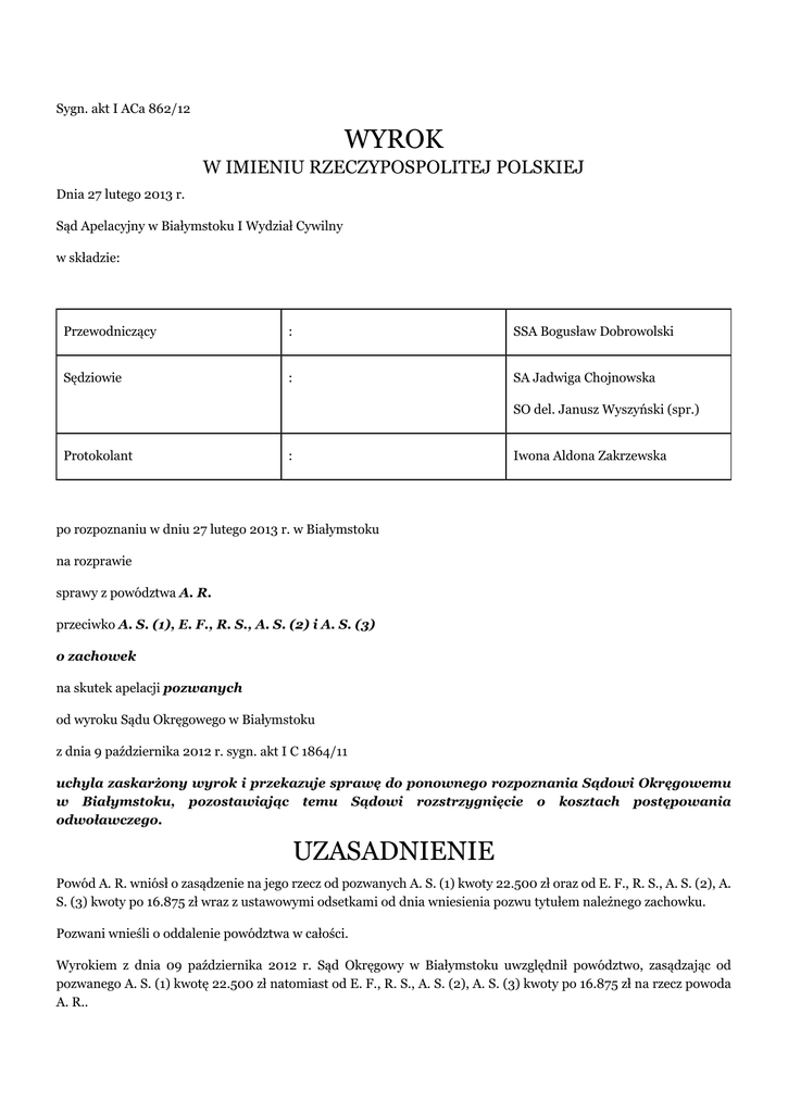 Sygn. akt I ACa 862/12 WYROK W IMIENIU RZECZYPOSPOLITEJ POLSKIEJ Dnia 27 lutego 2013 r. Sąd Apelacyjny w Białymstoku I Wydział Cywilny w składzie: Przewodniczący : SSA Bogusław Dobrowolski Sędziowie : SA Jadwiga Chojnowska SO del. Janusz Wyszyński (spr.) Protokolant : Iwona Aldona Zakrzewska po rozpoznaniu w dniu 27 lutego 2013 r. w Białymstoku na rozprawie sprawy z powództwa A. R. przeciwko A. S. (1), E. F., R. S., A. S. (2) i A. S. (3) o zachowek na skutek apelacji pozwanych od wyroku Sądu Okręgowego w Białymstoku z dnia 9 października 2012 r. sygn. akt I C 1864/11 uchyla zaskarżony wyrok i przekazuje sprawę do ponownego rozpoznania Sądowi Okręgowemu w Białymstoku, pozostawiając temu Sądowi rozstrzygnięcie o kosztach postępowania odwoławczego. UZASADNIENIE Powód A. R. wniósł o zasądzenie na jego rzecz od pozwanych A. S. (1) kwoty 22.500 zł oraz od E. F., R. S., A. S. (2), A. S. (3) kwoty po 16.875 zł wraz z ustawowymi odsetkami od dnia wniesienia pozwu tytułem należnego zachowku. Pozwani wnieśli o oddalenie powództwa w całości. Wyrokiem z dnia 09 października 2012 r. Sąd Okręgowy w Białymstoku uwzględnił powództwo, zasądzając od pozwanego A. S. (1) kwotę 22.500 zł natomiast od E. F., R. S., A. S. (2), A. S. (3) kwoty po 16.875 zł na rzecz powoda A. R.. Sąd ten ustalił, że w dniu 28 czerwca 2008 r. przed notariuszem został sporządzony testament, mocą którego N. I. powołała do całości spadku swoją siostrę A. S. (4) oraz wydziedziczyła swego wnuka A. R., z uwagi na niedopełnienie przez niego względem spadkodawczyni obowiązków rodzinnych, nie utrzymywanie kontaktów, brak opieki i zainteresowania. Jednoczenie aktem notarialnym z dnia 9 lipca 2008 r. należący do N. I. lokal mieszkalny położony w B. przy ul. (...) darowała ona na rzecz siostry A. S. (4). W dniu 9 września 2008 r. zmarła A. S. (4), a spadek po niej na mocy postanowienia z dnia 15 stycznia 2009 r. nabyli mąż A. S. (1) w 1/4 części oraz dzieci A. S. (2), A. S. (3), E. F. i R. S. po 3/16 części. Następnie w wyniku umowy o podział majątku wspólnego, częściowy dział spadku i zniesienie współwłasności lokal mieszkalny położony przy ul. (...) w B., przyznany został na wyłączną własność A. S. (1). W dniu 2 grudnia 2010 r. zmarła spadkodawczyni N. I., a spadek po niej na mocy prawomocnego postanowienia z dnia 9 sierpnia 2011 r. sygn. akt II Ns 3825/11 nabył wnuk - powód w niniejszej sprawie A. R.. Sąd Okręgowy ustalił także, że pozwany A. S. (1) wystąpił z wnioskiem o uchylenie postanowienia o stwierdzeniu nabycia spadku po N. I., który jednak postanowieniem z dnia 5 września 2012 r. został oddalony. W uzasadnieniu postanowienia Sąd wskazał, że testament z dnia 9 lipca 2008 r. jest ważny, jednak prawnie bezskuteczny, bowiem testatorka nie powołała spadkobiercy testamentowego na wypadek gdyby A. S. (4), powołana jako spadkobierca testamentowy nie mogła być spadkobiercą. Mając powyższe ustalenia na uwadze Sąd Okręgowy uznał, że powództwo o zachowek zasługuje na uwzględnienie. Z uwagi na bezskuteczność wskazanego testamentu i zawartego w nim wydziedziczenia powoda, nabył on prawo do spadku po N. I. z mocy ustawy, co zostało stwierdzone postanowieniem z dnia 9 sierpnia 2011 r., sygn. akt II Ns 3825/11. Powód był jedynym spadkobiercą zmarłej N. I., jak też osobą uprawnioną do zachowku, co do zasady mógł zatem wystąpić z roszczeniem o zachowek. W ocenie Sądu spór w sprawie dotyczył kwestii zasadności skierowania przez powoda swego roszczenia w stosunku do spadkobierców obdarowanej A. S. (4), a zważywszy, że darowizna należącego do spadkodawczyni lokalu wyczerpała cały majątek spadkowy, skierowanie przez powoda roszczeń do spadkodawców obdarowanej było zasadne. W razie rozporządzenia przez obdarowanego przedmiotem darowizny lub korzyścią z niej wynikającą bezpłatnie, obowiązek zwrotu nie przechodzi na osobę trzecią. Dlatego też odpowiedzialni są także pozwani. Aby ustalić wartość masy spadkowej w postaci mieszkania położonego w B. przy ul. (...) dopuścił dowód z opinii biegłej z zakresu szacowania nieruchomości, która ustaliła wartość nieruchomości na kwotę 183.000 zł, a więc zbliżoną do tej wskazanej przez powoda (180.000 zł). W związku z faktem, że powództwo nie zostało rozszerzone na ustaloną opinią kwotę, Sąd związany był żądaniem pozwu. Wskazał, że zgodnie z przepisem art. 991 § 1 k.c. wartość należnego powodowi zachowku to połowa wartości udziału jaki przypadłby mu w spadku. Przyjmując, że wartość masy spadkowej to kwota 180.000 zł, należny powodowi zachowek to kwota 90.000 zł, a zobowiązani do jej zapłaty są pozwani jako spadkodawcy obdarowanej A. S. (4) stosowanie do wartości udziałów spadkowych. Orzeczenie wydano na podstawie art. 991 § 1 kc w zw. z art. 1000 § 1 kc, w zakresie odsetek ma mocy art. 481 k.c., a w zakresie kosztów na zasadzie art. 98 kpc. Apelację od powyższego orzeczenia w całości na mocy przepisu art. 367 kpc wnieśli pozwani A. S. (1), E. F., R. S., A. S. (2) i A. S. (3) zarzucając: I. Naruszenie przepisów prawa materialnego, a w szczególności przepisu art. 991 § 1 kc w zw. z art. 1000 § 1 kc poprzez błędną wykładnię polegającą na przyjęciu, że powód A. R. jest osobą uprawnioną do zachowku, podczas gdy został on w sposób ważny i skuteczny pozbawiony prawa do zachowku po zmarłej N. I.; II. Naruszenie prawa materialnego poprzez niezastosowanie w sprawie przepisu art. 994 § 1 kc i brak rozważenia przez Sąd, czy darowizna dokonana przez N. I. na rzecz A. S. (4) powinna być doliczona do spadku po N. I., w sytuacji gdy A. S. (4) nie należała do kręgu spadkobierców ustawowych po N. I. i nie byłaby uprawniona do zachowku po niej; III. Naruszenie prawa materialnego poprzez niezastosowanie w sprawie art. 5 kc w sytuacji, gdy pozwani podnosili, że pieniądze na w