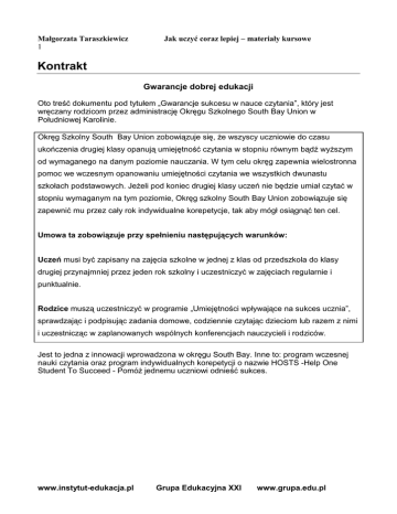 Małgorzata Taraszkiewicz 1 Jak uczyć coraz lepiej – materiały kursowe Kontrakt Gwarancje dobrej edukacji Oto treść dokumentu pod tytułem „Gwarancje sukcesu w nauce czytania”, który jest wręczany rodzicom przez administrację Okręgu Szkolnego South Bay Union w Południowej Karolinie. Okręg Szkolny South Bay Union zobowiązuje się, Ŝe wszyscy uczniowie do czasu ukończenia drugiej klasy opanują umiejętność czytania w stopniu równym bądź wyŜszym od wymaganego na danym poziomie nauczania. W tym celu okręg zapewnia wielostronna pomoc we wczesnym opanowaniu umiejętności czytania we wszystkich dwunastu szkołach podstawowych. JeŜeli pod koniec drugiej klasy uczeń nie będzie umiał czytać w stopniu wymaganym na tym poziomie, Okręg szkolny South Bay Union zobowiązuje się zapewnić mu przez cały rok indywidualne korepetycje, tak aby mógł osiągnąć ten cel. Umowa ta zobowiązuje przy spełnieniu następujących warunków: Uczeń musi być zapisany na zajęcia szkolne w jednej z klas od przedszkola do klasy drugiej przynajmniej przez jeden rok szkolny i uczestniczyć w zajęciach regularnie i punktualnie. Rodzice muszą uczestniczyć w programie „Umiejętności wpływające na sukces ucznia”, sprawdzając i podpisując zadania domowe, codziennie czytając dzieciom lub razem z nimi i uczestnicząc w zaplanowanych wspólnych konferencjach nauczycieli i rodziców. Jest to jedna z innowacji wprowadzona w okręgu South Bay. Inne to: program wczesnej nauki czytania oraz program indywidualnych korepetycji o nazwie HOSTS -Help One Student To Succeed - PomóŜ jednemu uczniowi odnieść sukces. www.instytut-edukacja.pl Grupa Edukacyjna XXI www.grupa.edu.pl Małgorzata Taraszkiewicz Jak uczyć coraz lepiej – materiały kursowe 2 Tom Rudmik, kierownik szkoły Master’s Academy and College, jeszcze śmielej formułuje cele własnej szkoły: wykształcenie Mistrzów nauki, którzy będą światłymi pracownikami XXI wieku – młodymi ludźmi o wielkiej wiedzy i szlachetnym charakterze. W szkole kładzie się duŜy nacisk na budowanie systemu wartości, jakość pracy i wykorzystywanie nowoczesnych technologii, a przede wszystkim na pozytywne, śmiałe i twórcze myślenie. Szkoła daje rodzicom następujące gwarancje: ● KaŜdy uczeń stanie się „Mistrzem nauki”, zanim skończy dwanaście lub trzynaście lat. ● Uczniowie będą potrafili zrozumieć i zastosować filozofię ciągłego doskonalenia do własnego procesu uczenia się. ● 95% dzieci stanie się bardzo dobrymi uczniami. ● Uczniowie będą mieli dostęp do zaawansowanej technologii. ● Absolwenci liceum przewyŜszą umiejętnością myślenia i przetwarzania informacji wielu absolwentów uniwersytetu. ● Uczniowie będą zanurzeni w kulturze opartej na tradycjach i wartościach. ● PrzewyŜszymy wszystkie aktualne standardy ustalone przez kuratorium oświaty Alberty. ● WyposaŜymy naszych uczniów w umiejętności, które pozwolą im odnieść sukces w ciągle zmieniającym się świecie. www.instytut-edukacja.pl Grupa Edukacyjna XXI www.grupa.edu.pl Małgorzata Taraszkiewicz 3 Jak uczyć coraz lepiej – materiały kursowe Szablon do przygotowywania KONTRAKTU Z UCZNIAMI i RODZICAMI Refleksja wstępna: zastanówmy się w jaki sposób szkoła odpowiada za produkt, który “sprzedaje”, czyli edukację? W zasadzie na kaŜdy produkt, który kupujemy otrzymujemy “gwarancję”. Gwarancja zawsze ma treść, w której opisane są reguły postępowania optymalizujące pracę urządzenia oraz często takŜe jest lista nieprawidłowych czynności uŜytkownika, które zdejmują odpowiedzialność za dobre działanie urządzenia z gwaranta. Czy uczeń i jego rodzice mogliby otrzymać taką gwarancję na edukację, którą “kupują” od szkoły? Od Ciebie? Zerknij do “ściągawki” tj. dokumentów szkoły (przeczytaj dokładnie misję szkoły), statut. Pamiętaj o myśleniu językiem “atrakcyjnych korzyści” Co moŜesz zagwarantować uczniom i ich rodzicom w zakresie: Wiedzy Umiejętności Klimatu uczenia się Innych spraw związanych z rozwojem umiejętności Ŝyciowych, społecznych itd Co zrobisz, aby zrealizować własne zobowiązania? Na co mogą uczniowie liczyć? Na jakie wsparcie, pomoc od Ciebie? Co uczniowie mają robić/zrobić, aby “działała Twoja gwarancja”? Jakie są Twoje warunki, wymagania, oczekiwania? Jakiego wsparcia oczekujesz od rodziców? Co mają konkretnego robić? www.instytut-edukacja.pl Grupa Edukacyjna XXI www.grupa.edu.pl Małgorzata Taraszkiewicz 4 Jak uczyć coraz lepiej – materiały kursowe Refleksja wstępna: zastanówmy się w jaki sposób szkoła odpowiada za produkt, który “sprzedaje”, czyli edukację? Kontrakt powinien być dokładnie, wspólnie dopracowany a wszelkie załoŜenia, zasady, reguły szczegółowo wyjaśnione KaŜdy uczeń i rodzic otrzymuje kontrakt do podpisania Ewentualne zmiany czy łamanie kontraktu kaŜdorazowo negocjujemy. W tej sytuacji wszyscy są odpowiedzialni za prowadzony proces edukacji, w warunkach i zasadach określonych wyraźnie i zrozumiale dla kaŜdego. www.instytut-edukacja.pl Grupa Edukacyjna XXI www.grupa.edu.pl