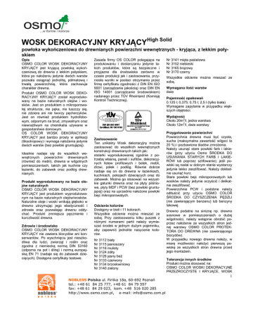 WOSK DEKORACYJNY KRYJĄCYHigh Solid powłoka wykończeniowa do drewnianych powierzchni wewnętrznych - kryjąca, z lekkim połyskiem Opis OSMO COLOR WOSK DEKORACYJNY KRYJĄCY jest kryjącą powłoką wykończeniową do drewna z lekkim połyskiem, która po nałoŜeniu jedynie dwóch warstw pozwala osiągnąć jednolitą, półmatową i trwałą powierzchnię, która zachowuje charakter drewna. Produkt OSMO COLOR WOSK DEKORACYJNY KRYJĄCY został wyprodukowany na bazie naturalnych olejów i wosków. Jest on produktem o mikroporowatej strukturze, nie pęka, nie łuszczy się, nie zdziera ani nie tworzy pęcherzyków. Jest on równieŜ produktem hydrofobowym, odpornym na brud, zmywalnym oraz niewraŜliwym na chemikalia uŜywane w gospodarstwie domowym. OS COLOR WOSK DEKORACYJNY KRYJĄCY jest bardzo prosty w aplikacji (tiksotropowy) i wymaga nałoŜenia jedynie dwóch warstw (bez powłoki gruntującej). Idealnie nadaje się do wszelkich wewnętrznych powierzchni drewnianych (równieŜ do mebli), drewna w wilgotnych pomieszczeniach, takich jak kuchnie czy łazienki, do zabawek oraz podłóg drewnianych. Produkt wyprodukowany na bazie olejów naturalnych OSMO COLOR WOSK DEKORACYJNY KRYJĄCY jest produktem wyprodukowanym na bazie naturalnych olejów/wosków. Naturalne oleje i woski wnikają głęboko w drewno utrzymując jego elastyczność i zdrowie oraz pozwalając drewnu oddychać. Produkt zmniejsza pęcznienie i kurczliwość drewna. Zdrowie i środowisko OSMO COLOR WOSK DEKORACYJNY KRYJĄCY nie zawiera biocydów ani konserwantów. Po wyschnięciu jest nieszkodliwa dla ludzi, zwierząt i roślin oraz zgodna z niemiecką normą DIN 53160 (odporna na pot i ślinę) i normą europejską EN 71 (nadaje się do zabawek dziecięcych). Dostępne certyfikaty testowe. Zasada firmy OS COLOR polegająca na produkowaniu i dostarczaniu jedynie takich produktów, które są bezpieczne i przyjazne dla środowiska zarówno w czasie produkcji jak i zastosowania, przyniosła wyniki w postaci otrzymania przez firmę certyfikatu zgodności z DIN EN ISO 9001 (zarządzanie jakością) oraz DIN EN ISO 14001 (zarządzanie środowiskiem) nadanego przez TÜV Rheinland (Komisję Kontroli Technicznej). Nr 3141 mięta pastelowa Nr 3152 niebieski Nr 3165 brązowy Nr 3170 czarny Wszystkie odcienie moŜna mieszać ze sobą. Wymagana ilość warstw dwie Pojemność opakowań 0.125 l; 0,375; 0,75 l; 2,5 l (tylko biała) Wymagane zapytanie w przypadku większych objętości. Wydajność Około 20m2/l, jedna warstwa 2 Około 12m /l, dwie warstwy Zastosowanie Ten unikalny Wosk dekoracyjny moŜna zastosować do wszelkich wewnętrznych konstrukcji drewnianych takich jak: stolarki wyprodukowanej zgodnie z potrzebą własną, paneli i sufitów, dekoracyjnych listew profilowych i belek, mebli, drzwi, półek i podłóg. Równie dobrze nadaje się on do drewna w łazienkach, kuchniach, pokojach dziecięcych oraz do zabawek. MoŜna go stosować na wszystkie gatunki drewna oraz na płyty pilśniowe, płyty MDF i PCW (bez powłoki gruntującej) oraz na uprzednio nałoŜone powłoki bejc mikroporowatych. Odcienie kolorów Dostępny w bieli i 11 kolorach. Wszystkie odcienie moŜna mieszać ze sobą. Przy zastosowaniu kilku puszek z róŜnymi numerami partii naleŜy wymieszać środek w jednym duŜym pojemniku, aby zapewnić jednolite nasycenie kolorów. Nr 3112 biały Nr 3115 jasnoszary Nr 3116 mulisty Nr 3124 Ŝółty Nr 3126 jasny beŜ Nr 3133 czerwony Nr 3134 brzoskwiniowy Nr 3140 zielony NOBLESS Polska ul. Firlika 18a, 60-692 Poznań tel.: +48 61 84 25 777, +48 61 84 79 597 fax: +48 61 84 29 023, kom. +48 516 020 285 http://www.osmo.com.pl, e-mail: [email protected] Przygotowanie powierzchni Powierzchnia drewna musi być czysta, sucha (maksymalna zawartość wilgoci to 20 %) i pozbawiona śladów zmroŜenia. NaleŜy usunąć stare powłoki farb i lakierów (przy uŜyciu Osmo ŚRODKA DO USUWANIA STARYCH FARB I LAKIERÓW lub poprzez szlifowanie); jeśli powłoki są nadal w dobrym stanie wystarczy jedynie lekko zeszlifować. NaleŜy dokładnie usunąć kurz. Stare powłoki bejc mikroporowatych lub wosków naleŜy jedynie oczyścić i delikatnie zeszlifować. Powierzchnie PCW i podobne naleŜy odtłuścić przy uŜyciu OSMO COLOR ŚRODKA DO CZYSZCZENIA PĘDZLI (nie zawierającym benzenu) lub benzyny lakowej. Drewno podatne na siniznę np. drewno sosnowe w pomieszczeniach o duŜej wilgotności, naleŜy wstępnie obrobić poprzez nałoŜenie ze wszystkich stron jednej warstwy OSMO COLOR PROTEKTORA DO DREWNA (nie zawierajęcego biocydów). W przypadku nowego drewna naleŜy, w miarę moŜliwości nałoŜyć pierwszą powłokę ze wszystkich stron drewna przed jego montaŜem. Tolerancja innych środków Produkt moŜna stosować na: OSMO COLOR WOSKI DEKORACYJNE PRZEZROCZYSTE I KRYJĄCE, WOSK 1 TWARDY OLEJNY, OSMO COLOR LAZURA JEDNORAZOWA, PRZEZROCZYSTA LAZURA OLEJNA DO DREWNA; OLEJE KRYJĄCE oraz inne powłoki mikroporowate, OSMO COLOR PROTEKTOR DREWNA (nie zawierającego biocydów i przeznaczonego do uŜytku wewnętrznego), OSMO COLOR FARBA DO OKIEN, OSMO COLOR FARBA KRYJĄCA DO DREWNA i podobne powłoki wykończeniowe. Korozja W pomieszczeniach o duŜej wilgotności zaleca się stosowanie cynkowanych i nieoksydujących gwoździ i mocowań. Sposób uŜycia OSMO COLOR WOSK DEKORACYJNY KRYJĄCY jest produktem gotowym do uŜycia. Nie rozcieńczać. Dobrze rozmieszać. Do aplikacji naleŜy stosować sztywną szczotkę/pędzel i nakładać cienką warstwę wzdłuŜ włókien drewna na czystą i suchą powierzchnię. Pozostawić do wyschnięcia przez ok. 12 godzin zapewniając dobrą wentylację. Następnie nałoŜyć drugą warstwę. Profesjonalne wykończenie półmatowe (do mebli): NaleŜy dokładnie wyrównać papierem ściernym powierzchnię drewna. NałoŜyć pierwszą warstwę jak wyŜej. Pozostawić do całkowitego wyschnięcia. Wyrównać drobnym papierem ściernym. NałoŜyć kolejną warstwę. (Czynność moŜna powtórzyć w miarę potr