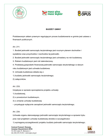 BUDŻET GMINY Podstawowym aktem prawnym regulującym proces budżetowania w gminie jest ustawa o finansach publicznych. Art. 211. 1. Budżet jednostki samorządu terytorialnego jest rocznym planem dochodów i wydatków oraz przychodów i rozchodów tej jednostki. 2. Budżet jednostki samorządu terytorialnego jest uchwalany na rok budżetowy. 3. Rokiem budżetowym jest rok kalendarzowy. 4. Podstawą gospodarki finansowej jednostki samorządu terytorialnego w danym roku budżetowym jest uchwała budżetowa. 5. Uchwała budżetowa składa się z: 1) budżetu jednostki samorządu terytorialnego; 2) załączników. Art. 233. Inicjatywa w sprawie sporządzenia projektu uchwały: 1) budżetowej, 2) o prowizorium budżetowym, 3) o zmianie uchwały budżetowej – przysługuje wyłącznie zarządowi jednostki samorządu terytorialnego. Art. 234. Uchwała organu stanowiącego jednostki samorządu terytorialnego w sprawie trybu prac nad projektem uchwały budżetowej określa w szczególności: 1) wymaganą szczegółowość projektu budżetu jednostki samorządu terytorialnego; 2) terminy obowiązujące w toku prac nad projektem uchwały budżetowej jednostki samorządu terytorialnego; 3) wymogi dotyczące uzasadnienia i materiały informacyjne, które zarząd przedłoży organowi stanowiącemu jednostki samorządu terytorialnego wraz z projektem uchwały budżetowej. PROCEDURA TWORZENIA BUDŻETU Budżet w gminie oparty jest o procedurę jego tworzenia. Procedura powinna zawierać opis poszczególnych kroków przy tworzeniu budżetu oraz przybliżone terminy tych kroków. Procedura uchwalania budżetu JST Schemat procedury uchwalania budżetu gminy oraz jego treść określa ustawa o finansach publicznych. Ustawa nakłada na organy gminy szereg obowiązków. Rada zobowiązana jest do określenia w odpowiedniej uchwale trybu pracy, terminów i obowiązków jednostek organizacyjnych gminy w toku prac nad projektem budżetu, wymaganą szczegółowość objaśnień oraz dodatkowe materiały informacyjne, które wójt powinien przedłożyć wraz z projektem uchwały budżetowej. Wójt gminy zobowiązany jest do przedłożenia - do 15 listopada roku poprzedzającego rok budżetowy - radzie gminy oraz Regionalnej Izbie Obrachunkowej projektu uchwały budżetowej wraz z objaśnieniami i informacją o stanie mienia komunalnego radzie gminy w celu zaopiniowania przez te instytucje. Projekt budżetu przygotowuje wójt/burmistrz/prezydent. Po przygotowaniu budżetu przez wójta trafia on do oceny przez komisję budżetową oraz ewentualnie dodatkowo inne komisje. Radni podczas prac w komisjach dyskutują i oceniają projekt budżetu. Jeśli projekt jest odpowiedni jest on poddawany pod głosowanie Rady Gminy. Rada Gminy może dokonać zmian w projekcie budżetu zaproponowanym przez wójta. Jednak bez zgody wójta, nie mogą to być zmiany zwiększające deficyt budżetowy czyli zwiększenie wydatków bez określenia ich źródeł w dochodach gminy. Uchwałę budżetową rada przyjmuje w głosowaniu jawnym zwykłą większością głosów w obecności co najmniej połowy ustawowego jej składu (kworum). „W trakcie prac nad budżetem żaden przepis nie obliguje formalnie ani organu wykonawczego ani rady do poddawania projektu budżetu opiniowaniu czy tez konsultacjom społecznym. Jednocześnie też żaden przepis tego nie zabrania”.(Długosz) A zatem, jako mieszkańcy gminy, możemy podejmować takie działania, które zachęcą władze samorządowe do rzetelnego konsultowania budżetu z mieszkańcami. Wszystko zależy od nas i od dobrej woli władz. Tryb prac nad projektem budżetu może obejmować także: procedurę konsultacji projektu z instytucjami, organizacjami, podmiotami i obywatelami poprzez przeprowadzenie ankiet, spotkania wójta z ww. podmiotami itp.; konsultacje te nie ograniczają ostatecznych decyzji zarządu i rady; informowanie zarządu (w toku prac nad budżetem) przez jednostki organizacyjne JST o wnioskach, opiniach, petycjach itp. składanych do tych jednostek w związku z realizacją zadań samorządu oraz budżetu. Komplementarnym elementem projektu uchwały budżetowej są objaśnienia, bez których tak radni, jak i mieszkańcy nie są w stanie zrozumieć zawartych w projekcie budżetu dochodów i wydatków. Objaśnienia powinny zawierać opis każdej pozycji (m.in. ich podstawę prawną, sposób kalkulacji). Każdy wydatek powinien być w objaśnieniu uzasadniony, porównany z wydatkiem poniesionym w roku poprzednim. „Nie ma żadnych przeszkód, aby objaśnienie, opis i uzasadnienie nie zawierały informacji na temat przeprowadzanych w trakcie roku budżetowego lub w trakcie prac organu wykonawczego konsultacji tytułów dochodów i wydatków z instytucjami konsultacyjnymi, organizacjami społecznymi czy indywidualnymi obywatelami oraz zgłaszane w ciągu roku opinii, skargi i wnioski dotyczące dochodów i wydatków JST.” (KTO?) Cykl budżetowy Tak zwany cykl budżetowy, czyli kolejne działania władz publicznych dotyczące budżetu jako instrumentu realizacji celów publicznych i planu finansowego obejmuje następujące cztery etapy tworzenia budżetu: I. Tworzenie projektu budżetu (Do 15 listopada) Proces tworzenia budżetu obejmuje wszelkie prace związane z przygotowaniem projektu budżetu gminy. W Polsce za przygotowanie budżetu odpowiada zarząd gminy (wójt, burmistrz, prezydent). Jest to wyłączna kompetencja tego organu, co oznacza, że zarząd może lecz nie musi uwzględniać propozycji mieszkańców. Nic nie stoi jednak na przeszkodzie aby zarząd gminy konsultował się z mieszkańcami w czasie przygotowywania projektu budżetu. Projekt budżetu musi zostać opracowany do 15 listopada, roku poprzedzającego rok budżetowy. Projekt do tego czasu musi zostać przedłożony radzie gminy oraz Regionalnej Izbie Obrachunkowej, która sprawuje nadzór nad gospodarką finansową gminy. Proces tworzenia projektu budżetu jest najlepszym momentem do wprowadzania rozwi