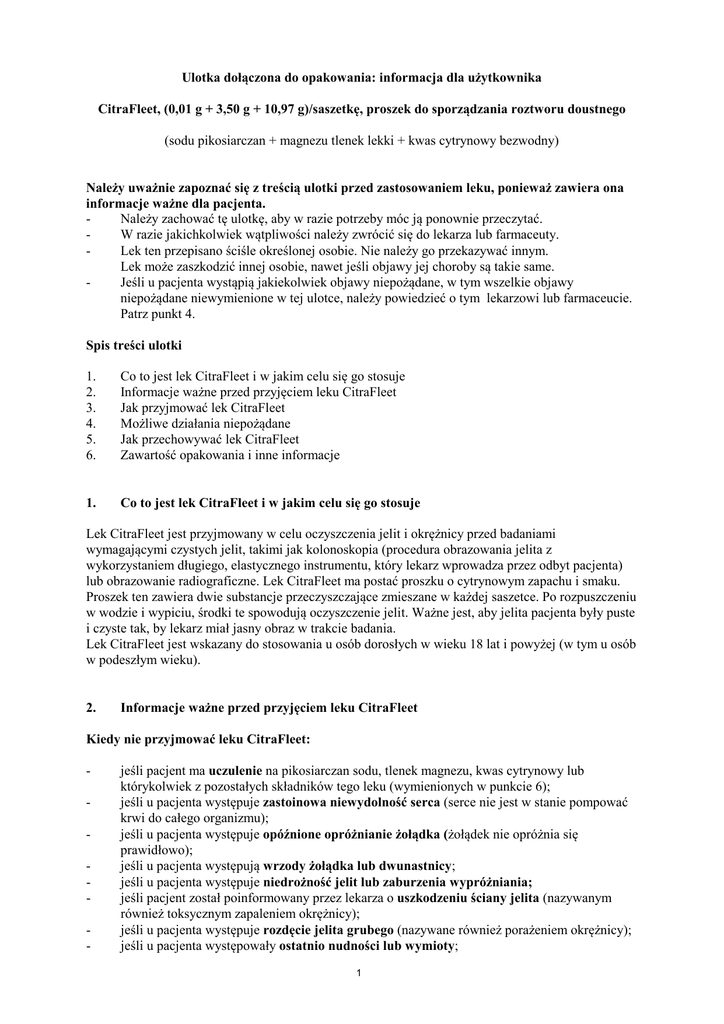 Ulotka dołączona do opakowania: informacja dla użytkownika CitraFleet, (0,01 g + 3,50 g + 10,97 g)/saszetkę, proszek do sporządzania roztworu doustnego (sodu pikosiarczan + magnezu tlenek lekki + kwas cytrynowy bezwodny) Należy uważnie zapoznać się z treścią ulotki przed zastosowaniem leku, ponieważ zawiera ona informacje ważne dla pacjenta. Należy zachować tę ulotkę, aby w razie potrzeby móc ją ponownie przeczytać. W razie jakichkolwiek wątpliwości należy zwrócić się do lekarza lub farmaceuty. Lek ten przepisano ściśle określonej osobie. Nie należy go przekazywać innym. Lek może zaszkodzić innej osobie, nawet jeśli objawy jej choroby są takie same. Jeśli u pacjenta wystąpią jakiekolwiek objawy niepożądane, w tym wszelkie objawy niepożądane niewymienione w tej ulotce, należy powiedzieć o tym lekarzowi lub farmaceucie. Patrz punkt 4. Spis treści ulotki 1. 2. 3. 4. 5. 6. Co to jest lek CitraFleet i w jakim celu się go stosuje Informacje ważne przed przyjęciem leku CitraFleet Jak przyjmować lek CitraFleet Możliwe działania niepożądane Jak przechowywać lek CitraFleet Zawartość opakowania i inne informacje 1. Co to jest lek CitraFleet i w jakim celu się go stosuje Lek CitraFleet jest przyjmowany w celu oczyszczenia jelit i okrężnicy przed badaniami wymagającymi czystych jelit, takimi jak kolonoskopia (procedura obrazowania jelita z wykorzystaniem długiego, elastycznego instrumentu, który lekarz wprowadza przez odbyt pacjenta) lub obrazowanie radiograficzne. Lek CitraFleet ma postać proszku o cytrynowym zapachu i smaku. Proszek ten zawiera dwie substancje przeczyszczające zmieszane w każdej saszetce. Po rozpuszczeniu w wodzie i wypiciu, środki te spowodują oczyszczenie jelit. Ważne jest, aby jelita pacjenta były puste i czyste tak, by lekarz miał jasny obraz w trakcie badania. Lek CitraFleet jest wskazany do stosowania u osób dorosłych w wieku 18 lat i powyżej (w tym u osób w podeszłym wieku). 2. Informacje ważne przed przyjęciem leku CitraFleet Kiedy nie przyjmować leku CitraFleet: - jeśli pacjent ma uczulenie na pikosiarczan sodu, tlenek magnezu, kwas cytrynowy lub którykolwiek z pozostałych składników tego leku (wymienionych w punkcie 6); jeśli u pacjenta występuje zastoinowa niewydolność serca (serce nie jest w stanie pompować krwi do całego organizmu); jeśli u pacjenta występuje opóźnione opróżnianie żołądka (żołądek nie opróżnia się prawidłowo); jeśli u pacjenta występują wrzody żołądka lub dwunastnicy; jeśli u pacjenta występuje niedrożność jelit lub zaburzenia wypróżniania; jeśli pacjent został poinformowany przez lekarza o uszkodzeniu ściany jelita (nazywanym również toksycznym zapaleniem okrężnicy); jeśli u pacjenta występuje rozdęcie jelita grubego (nazywane również porażeniem okrężnicy); jeśli u pacjenta występowały ostatnio nudności lub wymioty; 1 - jeśli pacjent odczuwa silne pragnienie lub może być poważnie odwodniony; jeśli pacjent został poinformowany przez lekarza o wystąpieniu obrzęku w obrębie jamy brzusznej w związku z gromadzeniem się płynów (nazywanym wodobrzuszem); jeśli pacjent przechodził ostatnio zabiegi chirurgiczne w obrębie jamy brzusznej, np. z powodu zapalenia wyrostka robaczkowego; jeśli u pacjenta mogło dojść do perforacji/uszkodzenia lub niedrożności jelit; jeśli pacjent został poinformowany przez lekarza o czynnej, zapalnej chorobie jelit (takiej jak choroba Leśniowskiego-Crohna lub wrzodziejące zapalenie okrężnicy); jeśli pacjent został poinformowany przez lekarza o uszkodzeniu tkanki mięśniowej, przy którym produkty rozpadu przedostają się do krwi (rabdomioliza); jeśli u pacjenta występują ciężkie schorzenia nerek lub lekarz stwierdził zbyt duże stężenie magnezu we krwi (hipermagnezemia). Ostrzeżenia i środki ostrożności Przed rozpoczęciem przyjmowania CitraFleet należy omówić z lekarzem: jeśli u pacjenta niedawno przeprowadzono zabieg chirurgiczny jelit; jeśli u pacjenta występują choroby nerek lub serca; jeśli u pacjenta występują zaburzenia równowagi wodno-elektrolitowej (sodu lub potasu) lub pacjent przyjmuje leki, które mogą wpływać na równowagę wodno-elektrolitową (sodu lub potasu), takie jak diuretyki, kortykosteroidy lub lit; jeśli u pacjenta stwierdzono padaczkę lub drgawki w wywiadzie; jeśli u pacjenta występuje niskie ciśnienie krwi (niedociśnienie); jeśli pacjent odczuwa pragnienie lub przypuszcza, że może być odwodniony w stopniu umiarkowanym; jeśli pacjent jest w podeszłym wieku lub jest słaby fizycznie; jeśli u pacjenta kiedykolwiek występowało małe stężenie sodu lub potasu we krwi (hiponatremia lub hipokaliemia). Lek CitraFleet a inne leki Należy powiedzieć lekarzowi lub farmaceucie o wszystkich lekach przyjmowanych przez pacjenta obecnie lub ostatnio, a także o lekach, które pacjent planuje przyjmować. Jednoczesne przyjmowanie leku CitraFleet z innymi lekami może wpływać na ich działanie. Inne leki mogą również wpływać na działanie leku CitraFleet. Jeśli pacjent przyjmuje leki należące do którejkolwiek wymienionej poniżej grupy, lekarz może zdecydować o podaniu innego leku lub dostosowaniu dawki leku. W związku z tym, jeśli pacjent nie rozmawiał jeszcze z lekarzem o wymienionych poniżej lekach, powinien wrócić do lekarza i zapytać jak należy postępować: - - doustne środki antykoncepcyjne, ponieważ ich działanie może być osłabione; leki stosowane w cukrzycy lub w leczeniu padaczki (drgawki), ponieważ ich działanie może być osłabione; antybiotyki, ponieważ ich działanie może być osłabione; inne środki przeczyszczające, w tym otręby; diuretyki, takie jak furosemid (leki moczopędne); kortykosteroidy takie jak prednizon stosowane w chorobach takich jak zapalenie stawów, astma, katar sienny, zapalenie skóry oraz zapalna choroba jelit; digoksyna, stosowana w leczeniu niewydo