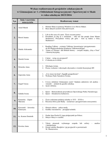 Wykaz realizowanych projektów edukacyjnych w Gimnazjum nr 1 z Oddziałami Integracyjnymi i Sportowymi w Skale w roku szkolnym 2015/2016 Lp. Imię i nazwisko nauczyciela Realizowany temat Anioł Marek 1. Montaż filmu za pomocą Windows Live Movie Maker. 2. Baza danych uczniów klas pierwszych. Boroń Joanna 1. Life in the eyes of a poet. /Życie oczyma poety/. 2. Presidents as big as a mountain – who are the people from Mount Rushmore? /Prezydenci wielcy jak góra – kim są ludzie z Góry Rushmore?/ 3. Dańda Aleksander 1. Reading Tolkien – czytamy Tolkiena /inscenizacja i przygotowanie do III Międzyszkolnego Konkursu Tolkienowskiego/. 2. ‘Game of Thrones’ and British history – związki między „Grą o Tron” i historią brytyjską. 4. Doniek Iwona 1. Cukier – wróg czy przyjaciel? 2. Z chemią na co dzień. 5. Dziurska Anna 1. Mitologia świata. 2. Prawa, wolności i obowiązki obywatela w świetle Konstytucji RP. 6. Gajewska Anna 1. „Czy znasz ten kraj?. Zagadki geograficzne”. 2. Wybrane Parki Narodowe Świata. 7. Gogól Teresa 1. Co/czy młodzież Gimnazjum czyta? /badania ankietowe ich analiza – wnioski/ – artykuł do gazetki szkolnej. 2. Język reklamy. 8. Gubała Iwona 1. Quest – Różnorodność przyrodnicza Ojcowskiego Parku Narodowego. 2. Quest – Dziedzictwo kulturowe. 9. Konarska – Zapart Marzena 1. Życie codzienne polskiej szlachty w XVI – XVII w. 2. Rocznica bitwy pod Skałą – scenariusz i przygotowanie uroczystości. 10. Korzonek – Jaworska Katarzyna 1. Historia ubioru – pokaz mody. 2. Grafika warsztatowa – przegląd techniki. 11. ks. Koston Dominik 1. Osoba Jana Pawła II i jego pielgrzymki po Polsce. 2. Motyw Maryi w rzeźbie. Kowina Anna 1. Teksty piosenek wybranego zespołu lub solisty i interpretacja. 2. Dzieje rodziny Borejków i jej przyjaciół w powieściach M. Musierowicz. 1. 2. 12. – analiza 1 Wykaz realizowanych projektów edukacyjnych w Gimnazjum nr 1 z Oddziałami Integracyjnymi i Sportowymi w Skale w roku szkolnym 2015/2016 Lp. Imię i nazwisko nauczyciela Realizowany temat 13. Kozień Joanna 1. Łańcuch przeżycia – działanie systemu ratownictwa w Polsce. 2. Wybrane podmioty odpowiadające za ochronę państwa i jego obywateli – geneza powstania, główne zadania. 14. Koźbiał Katarzyna 1. Zasady gry w piłce siatkowej + makieta boiska. 2. Grzyby jadalne i trujące OPN. 15. Nieckula Zofia 1. Polscy nobliści literaccy. 2. Nagrody IBBY – prezentacja multimedialna. 16. Puget Anna 1. Matematyka w sztuce, sztuka w matematyce. 2. Matematyka w obiektywie. 17. Rodek Grażyna 1. Dzień folkowy w naszej szkole /plastyka, muzyka, zajęcia artystyczne/. 2. Kolędy i pastorałki polskie /muzyka/. 18. Smalec Justyna 1. Fizyka wokół nas. 2. Maria Skłodowska – Curie i jej rola w rozwoju fizyki. 19. 1. Arcydzieło życia i śmierci Salomei Piastówny… czyli jak być wartościową osobą, w niesprzyjających warunkach, gdy nie można decydować o swoim losie!!! (W projekcie przewiduje się warsztaty z zakresu publicznej prezentacjitworzenia jej scenariusza i realizacji z wykorzystaniem multimediów, częściowo w ramach koła teatralnego). 2. Szaleństwo i mądrość epoki średniowiecza przez pryzmat sztuki życia i śmierci Salomei Piastówny – osobowości na miarę wyzwań XXI-wszego wieku. (W projekcie przewiduje się warsztaty z zakresu publicznej prezentacjitworzenia jej scenariusza i realizacji z wykorzystaniem multimediów, częściowo w ramach koła teatralnego). Szandor – Wilk Halina 20. Szkutnik Natalia 1. Historia wybranej dyscypliny sportowej – siatkówka. 2. Znane sylwetki polskich sportowców jako czynnik kształtujący pozytywne postaw wobec sportu wśród dzieci i młodzieży. 21. Świda Ewa 1. 2. 22. Trzcionka Małgorzata 1. Kodeks walki z rakiem. 2. Czy wiesz co jesz? Życie i twórczość Jana Kochanowskiego. Mistrz ortografii. 2 Wykaz realizowanych projektów edukacyjnych w Gimnazjum nr 1 z Oddziałami Integracyjnymi i Sportowymi w Skale w roku szkolnym 2015/2016 Lp. Imię i nazwisko nauczyciela 23. Trzcionka Małgorzata 3. Kodeks walki z rakiem. 4. Czy wiesz co jesz? 24. Wrona Beata 1. Wielościany. 2. Matematyka wokół nas. 25. Zastawnik Piotr 1. Udział Polaków w nowożytnych igrzyskach olimpijskich. 26. Ziarkowska Magdalena 1. „Wigilijna ulica” czyli Jasełka XXI w. 2. Zbieramy pieniądze na klasową / szkolną wycieczkę. 27. Żak Barbara 1. Jaka jest rola matematyki w poezji, malarstwie i muzyce? 2. Nasze miasto w liczbach. Realizowany temat 3