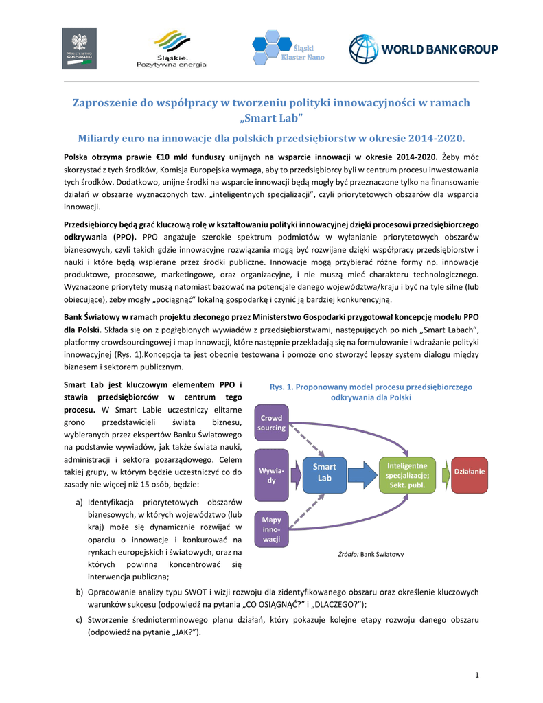 Zaproszenie do współpracy w tworzeniu polityki innowacyjności w ramach „Smart Lab” Miliardy euro na innowacje dla polskich przedsiębiorstw w okresie 2014-2020. Polska otrzyma prawie €10 mld funduszy unijnych na wsparcie innowacji w okresie 2014-2020. Żeby móc skorzystać z tych środków, Komisja Europejska wymaga, aby to przedsiębiorcy byli w centrum procesu inwestowania tych środków. Dodatkowo, unijne środki na wsparcie innowacji będą mogły być przeznaczone tylko na finansowanie działań w obszarze wyznaczonych tzw. „inteligentnych specjalizacji”, czyli priorytetowych obszarów dla wsparcia innowacji. Przedsiębiorcy będą grać kluczową rolę w kształtowaniu polityki innowacyjnej dzięki procesowi przedsiębiorczego odkrywania (PPO). PPO angażuje szerokie spektrum podmiotów w wyłanianie priorytetowych obszarów biznesowych, czyli takich gdzie innowacyjne rozwiązania mogą być rozwijane dzięki współpracy przedsiębiorstw i nauki i które będą wspierane przez środki publiczne. Innowacje mogą przybierać różne formy np. innowacje produktowe, procesowe, marketingowe, oraz organizacyjne, i nie muszą mieć charakteru technologicznego. Wyznaczone priorytety muszą natomiast bazować na potencjale danego województwa/kraju i być na tyle silne (lub obiecujące), żeby mogły „pociągnąć” lokalną gospodarkę i czynić ją bardziej konkurencyjną. Bank Światowy w ramach projektu zleconego przez Ministerstwo Gospodarki przygotował koncepcję modelu PPO dla Polski. Składa się on z pogłębionych wywiadów z przedsiębiorstwami, następujących po nich „Smart Labach”, platformy crowdsourcingowej i map innowacji, które następnie przekładają się na formułowanie i wdrażanie polityki innowacyjnej (Rys. 1).Koncepcja ta jest obecnie testowana i pomoże ono stworzyć lepszy system dialogu między biznesem i sektorem publicznym. Smart Lab jest kluczowym elementem PPO i stawia przedsiębiorców w centrum tego procesu. W Smart Labie uczestniczy elitarne grono przedstawicieli świata biznesu, wybieranych przez ekspertów Banku Światowego na podstawie wywiadów, jak także świata nauki, administracji i sektora pozarządowego. Celem takiej grupy, w którym będzie uczestniczyć co do zasady nie więcej niż 15 osób, będzie: a) Identyfikacja priorytetowych obszarów biznesowych, w których województwo (lub kraj) może się dynamicznie rozwijać w oparciu o innowacje i konkurować na rynkach europejskich i światowych, oraz na których powinna koncentrować się interwencja publiczna; Rys. 1. Proponowany model procesu przedsiębiorczego odkrywania dla Polski Źródło: Bank Światowy b) Opracowanie analizy typu SWOT i wizji rozwoju dla zidentyfikowanego obszaru oraz określenie kluczowych warunków sukcesu (odpowiedź na pytania „CO OSIĄGNĄĆ?” i „DLACZEGO?”); c) Stworzenie średnioterminowego planu działań, który pokazuje kolejne etapy rozwoju danego obszaru (odpowiedź na pytanie „JAK?”). 1 Rezultaty „Smart Labu” będą wkładem dla działań Ministerstwa Gospodarki oraz Urzędu Marszałkowskiego Woj. Śląskiego. Forma i zaawansowanie wypracowanych rozwiązań zależeć będzie od stopnia zaangażowania uczestników i poziomu ich wzajemnego zaufania. Charakter i szczegółowość rezultatów SL może wymagać częściowego utajnienia informacji wrażliwych, o czym będą decydować uczestnicy. Czas wypracowania rezultatów będzie zależał od szybkości postępu prac i intensywności spotkań. Zakłada się, że rezultaty zostaną wypracowane w ciągu kilku spotkań (Rys. 2), które odbędą się na przestrzeni kilku miesięcy (ok. 4-6 m-cy). Rezultaty powinny wykraczać swoim zasięgiem poza grono uczestników SL i oddziaływać na jak najszerszą grupę podmiotów gospodarczych, aby zapewnić możliwie największy pozytywny efekt społeczno-gospodarczy. Niezależny ekspercki „komitet inwestycyjny” oceni rezultaty prac SL i potencjał przedstawionych planów i przekaże rekomendację do samorządu województwa dot. potrzeby wsparcia dla danego obszaru. Przedsiębiorcy biorący udział w SL mogą liczyć na następujące korzyści: 1. Wpływ na politykę innowacyjną poprzez wskazanie obszarów priorytetowych (w zakresie obecnych inteligentnych specjalizacji oraz przyszłych), na których powinno koncentrować się wsparcie publiczne; 2. Poznanie profesjonalnych partnerów do współpracy (firmy, jednostki B+R, instytucje otoczenia biznesu) i oferowanych przez nich usług; 3. Pogłębienie wiedzy na temat swojego obszaru aktywności biznesowej, w tym jego mocnych i słabych stron (SWOT) oraz kluczowych czynników sukcesu (ang. key success factors, KSF). Jednym z elementów procesu SL będzie opracowanie przez zewnętrznego konsultanta biznesowego analizy rynkowo-technologicznej dla obszaru, nad którym pracują członkowie SL. Raport z analizy wzmocni produkty wypracowane przez SL i pomoże lepiej określić potencjał i potrzeby danego obszaru biznesowego; 4. Uzyskanie informacji na temat potencjalnych źródeł finansowania dla rozwoju obszaru biznesowego. Ze swojej stron, przedsiębiorcy muszą ponieść koszty w formie poświęcenia swojego czasu, zaangażowania w spotkania SL i wypracowania wspólnych rezultatów. Rys. 2. Schemat modelu SL W województwie śląskim odbędzie się pilotaż SL w trzech obszarach tematycznych pod roboczymi nazwami „nano”, „automotive” i „wydobycie”. W SL uczestniczyć będą wybrane firmy (planujemy 6-8 przedsiębiorców); jednostki naukowe (2), instytucje otoczenia biznesu (2), administracja (2) oraz moderatorzy ze strony Banku Światowego. Robocze tematy SL będą doprecyzowane w czasie pierwszego spotkania, które prowadzone będzie w j. polskim i będzie trwało ok. 4 godz. To od Państwa teraz zależy jak innowacje będą się rozwijać w woj. śląskim i w Polsce. Liczymy na Państwa aktywne i konstruktywne wsparcie w tym ważnym i innowacyjnym przedsięwzięciu