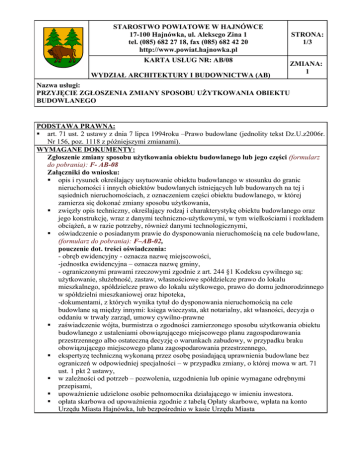 STAROSTWO POWIATOWE W HAJNÓWCE 17-100 Hajnówka, ul. Alekscgo Zina 1 tel. (085) 682 27 18, fax (085) 682 42 20 http://www.powiat.hajnowka.pl KARTA USŁUG NR: AB/08 WYDZIAŁ ARCHITEKTURY I BUDOWNICTWA (AB) STRONA: 1/3 ZMIANA: 1 Nazwa usługi: PRZYJĘCIE ZGŁOSZENIA ZMIANY SPOSOBU UŻYTKOWANIA OBIEKTU BUDOWLANEGO PODSTAWA PRAWNA: art. 71 ust. 2 ustawy z dnia 7 lipca 1994roku –Prawo budowlane (jednolity tekst Dz.U.z2006r. Nr 156, poz. 1118 z późniejszymi zmianami). WYMAGANE DOKUMENTY: Zgłoszenie zmiany sposobu użytkowania obiektu budowlanego lub jego części (formularz do pobrania): F- AB-08 Załączniki do wniosku: opis i rysunek określający usytuowanie obiektu budowlanego w stosunku do granic nieruchomości i innych obiektów budowlanych istniejących lub budowanych na tej i sąsiednich nieruchomościach, z oznaczeniem części obiektu budowlanego, w której zamierza się dokonać zmiany sposobu użytkowania, zwięzły opis techniczny, określający rodzaj i charakterystykę obiektu budowlanego oraz jego konstrukcję, wraz z danymi techniczno-użytkowymi, w tym wielkościami i rozkładem obciążeń, a w razie potrzeby, również danymi technologicznymi, oświadczenie o posiadanym prawie do dysponowania nieruchomością na cele budowlane, (formularz do pobrania): F–AB-02, pouczenie dot. treści oświadczenia: - obręb ewidencyjny - oznacza nazwę miejscowości, -jednostka ewidencyjna – oznacza nazwę gminy, - ograniczonymi prawami rzeczowymi zgodnie z art. 244 §1 Kodeksu cywilnego są: użytkowanie, służebność, zastaw, własnościowe spółdzielcze prawo do lokalu mieszkalnego, spółdzielcze prawo do lokalu użytkowego, prawo do domu jednorodzinnego w spółdzielni mieszkaniowej oraz hipoteka, -dokumentami, z których wynika tytuł do dysponowania nieruchomością na cele budowlane są między innymi: księga wieczysta, akt notarialny, akt własności, decyzja o oddaniu w trwały zarząd, umowy cywilno-prawne zaświadczenie wójta, burmistrza o zgodności zamierzonego sposobu użytkowania obiektu budowlanego z ustaleniami obowiązującego miejscowego planu zagospodarowania przestrzennego albo ostateczną decyzję o warunkach zabudowy, w przypadku braku obowiązującego miejscowego planu zagospodarowania przestrzennego, ekspertyzę techniczną wykonaną przez osobę posiadającą uprawnienia budowlane bez ograniczeń w odpowiedniej specjalności – w przypadku zmiany, o której mowa w art. 71 ust. 1 pkt 2 ustawy, w zależności od potrzeb – pozwolenia, uzgodnienia lub opinie wymagane odrębnymi przepisami, upoważnienie udzielone osobie pełnomocnika działającego w imieniu inwestora. opłata skarbowa od upoważnienia zgodnie z tabelą Opłaty skarbowe, wpłata na konto Urzędu Miasta Hajnówka, lub bezpośrednio w kasie Urzędu Miasta STAROSTWO POWIATOWE W HAJNÓWCE 17-100 Hajnówka, ul. Alekscgo Zina 1 tel. (085) 682 27 18, fax (085) 682 42 20 http://www.powiat.hajnowka.pl KARTA USŁUG NR: AB/08 WYDZIAŁ ARCHITEKTURY I BUDOWNICTWA (AB) STRONA: 2/3 ZMIANA: 1 Nazwa usługi: PRZYJĘCIE ZGŁOSZENIA ZMIANY SPOSOBU UŻYTKOWANIA OBIEKTU BUDOWLANEGO OPŁATY: Nie podlega opłacie skarbowej. Opłatę za wydane postanowienie, określoną w ustawie o opłacie skarbowej, wnosi się na konto: Urząd Miasta Hajnówka 17-200 Hajnówka ul. Aleksego Zina 1 PKO BP SA O/HAJNÓWKA 46 1020 1332 0000 1602 0276 4058 lub bezpośrednio w kasie Urzędu Miasta Hajnówka pokój nr 13 (parter) z dopiskiem"opłata skarbowa" za... Opłaty skarbowe: od upoważnienia – 17 zł. od zaświadczenia o braku sprzeciwu wobec zmiany sposobu użytkowania – 17zł. TERMIN ZAŁATWIENIA SPRAWY: Zmiana sposobu użytkowania może nastąpić, jeżeli w terminie 30 dni od dnia doręczenia zgłoszenia organ nie wniesie, w drodze decyzji, sprzeciwu. Ważność zgłoszenia Zmiana sposobu użytkowania powinna nastąpić nie później niż po upływie 2 lat od doręczenia do organu zgłoszenia. WYDZIAŁ ODPOWIEDZIALNY ZA ZAŁATWIENIE SPRAWY: Wydział Architektury i Budownictwa 17-200 Hajnówka ul. A.Zina 1 I piętro, pokój nr 24 tel. 682-30-50, 682-53-70 e-mail: [email protected] Wniosek wraz z załącznikami należy złożyć w sekretariacie Starostwa, tj: w pok. nr 19, natomiast po odbiór dokumentacji należy zgłosić się w pok. nr 24 /tel.682-30-50/. Kiedy: Codziennie w Wydziale Architektury i Budownictwa w godzinach pracy Starostwa tj: w poniedziałki od 800 do 1600 natomiast w wtorek-piątek od 730do 1530 TRYB ODWOŁAWCZY: Od decyzji wnoszącej sprzeciw do dokonanego zgłoszenia zmiany sposobu użytkowania przysługuje stronie odwołanie do Wojewody Podlaskiego za pośrednictwem organu wydającego decyzję w terminie 14 dni od dnia doręczenia decyzji. STAROSTWO POWIATOWE W HAJNÓWCE 17-100 Hajnówka, ul. Alekscgo Zina 1 tel. (085) 682 27 18, fax (085) 682 42 20 http://www.powiat.hajnowka.pl KARTA USŁUG NR: AB/08 WYDZIAŁ ARCHITEKTURY I BUDOWNICTWA (AB) STRONA: 3/3 ZMIANA: 1 Nazwa usługi: PRZYJĘCIE ZGŁOSZENIA ZMIANY SPOSOBU UŻYTKOWANIA OBIEKTU BUDOWLANEGO UWAGI: Przez zmianę sposobu użytkowania obiektu budowlanego lub jego części rozumie się w szczególności: przeróbkę pomieszczenia z przeznaczeniem na pobyt ludzi albo przeznaczenie do użytku publicznego lokalu lub pomieszczenia, które uprzednio miało inne przeznaczenie lub było budowane w innym celu, w tym także przeznaczenie pomieszczeń mieszkalnych na cele niemieszkalne, podjęcie bądź zaniechanie w obiekcie budowlanym lub jego części działalności zmieniającej warunki: bezpieczeństwa pożarowego, powodziowego, pracy, zdrowotne, higieniczno-sanitarne, ochrony środowiska bądź wielkość lub układ obciążeń. Zgłoszenia należy dokonać przed dokonaniem zmiany sposobu użytkowania obiektu budowlanego lub jego części. Zmiana sposobu użytkowania może nastąpić, jeżeli w terminie 30 dni od dnia doręczenia zgłoszenia właściwy organ nie wniesie sprzeciwu, w drodze decyzji i nie później, niż po upływie 2 lat od dor
