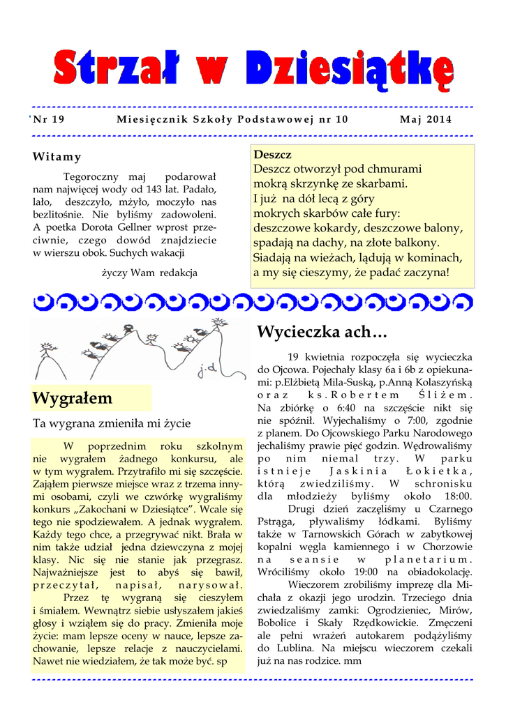 Nr 19 Miesięcznik Szkoły Podstawowej nr 10 Witam y Tegoroczny maj podarował nam najwięcej wody od 143 lat. Padało, lało, deszczyło, mżyło, moczyło nas bezlitośnie. Nie byliśmy zadowoleni. A poetka Dorota Gellner wprost przeciwnie, czego dowód znajdziecie w wierszu obok. Suchych wakacji życzy Wam redakcja Maj 2014 Deszcz Deszcz otworzył pod chmurami mokrą skrzynkę ze skarbami. I już na dół lecą z góry mokrych skarbów całe fury: deszczowe kokardy, deszczowe balony, spadają na dachy, na złote balkony. Siadają na wieżach, lądują w kominach, a my się cieszymy, że padać zaczyna! Wycieczka ach… Wygrałem Ta wygrana zmieniła mi życie W poprzednim roku szkolnym nie wygrałem żadnego konkursu, ale w tym wygrałem. Przytrafiło mi się szczęście. Zająłem pierwsze miejsce wraz z trzema innymi osobami, czyli we czwórkę wygraliśmy konkurs „Zakochani w Dziesiątce”. Wcale się tego nie spodziewałem. A jednak wygrałem. Każdy tego chce, a przegrywać nikt. Brała w nim także udział jedna dziewczyna z mojej klasy. Nic się nie stanie jak przegrasz. Najważniejsze jest to abyś się bawił, przeczytał, napisał, narysował. Przez tę wygraną się cieszyłem i śmiałem. Wewnątrz siebie usłyszałem jakieś głosy i wziąłem się do pracy. Zmieniła moje życie: mam lepsze oceny w nauce, lepsze zachowanie, lepsze relacje z nauczycielami. Nawet nie wiedziałem, że tak może być. sp 19 kwietnia rozpoczęła się wycieczka do Ojcowa. Pojechały klasy 6a i 6b z opiekunami: p.Elżbietą Mila-Suską, p.Anną Kolaszyńską oraz ks.Robertem Śliżem. Na zbiórkę o 6:40 na szczęście nikt się nie spóźnił. Wyjechaliśmy o 7:00, zgodnie z planem. Do Ojcowskiego Parku Narodowego jechaliśmy prawie pięć godzin. Wędrowaliśmy po ni m ni e mal tr zy . W par k u istnieje Jaskinia Łokietka, którą zwiedziliśmy. W schr oni sku dla młodzieży byliśmy około 18:00. Drugi dzień zaczęliśmy u Czarnego Pstrąga, pływaliśmy łódkami. Byliśmy także w Tarnowskich Górach w zabytkowej kopalni węgla kamiennego i w Chorzowie na seansie w planetarium. Wróciliśmy około 19:00 na obiadokolację. Wieczorem zrobiliśmy imprezę dla Michała z okazji jego urodzin. Trzeciego dnia zwiedzaliśmy zamki: Ogrodzieniec, Mirów, Bobolice i Skały Rzędkowickie. Zmęczeni ale pełni wrażeń autokarem podążyliśmy do Lublina. Na miejscu wieczorem czekali już na nas rodzice. mm Kwa kwa pasje Strzał w Dziesiątkę 2 Mnóstwo kaczek Kaczkopasja Myślę, że większości z was kaczka kojarzy się tylko z ptakiem. Ale ja pomyślałam o zupełnie innej kaczce, o kaczce dziennikarskiej*. Jest niezwykłą plotkarą. Oczywiście wszystkie jej historie są nieprawdziwe. Opowiada je tylko po to, by być popularna i lubiana. Niektórzy nawet jej wierzą! Jest niewychowana. A co najgorsze, to wcale nie jest jej wina tylko dziennikarzy, którzy zamiast solidnego artykułu wklejają taką gadułę do gazety. as Rozmowę z Michałem Lipskim przeprowadziły Gabriela Chodoń i Emilia Cieślik. Emilia Cieślik/Gabriela Chodoń: Skąd u ciebie pasja do kaczek? Michał Lipski: Nie wiem. Jak byłem mały dostałem od jednej pani z Warszawy, znajomej rodziców, gęś. Nie znałem się i pomyślałem, że to kaczka. Zabierałem ją zawsze w plecaku do przedszkola. E.C/G.C.: Jak ją rozwinąłeś, tę pasję? M.L.: Tata mi kupił kaczkę pluszową i koc z kaczkami. Leżały w sklepie przy sobie. Poza tym rysuję kaczki. Mam też kilka książek. Mama mi kupiła. E.C/G.C.: Gdzie się spotykasz z kaczkami? M.L.: Z prawdziwymi nad Bystrzycą. E.C./G.C.: Czy znasz ich rasy? M.L.: Krzyżówka, dzika, czarna kaczka z fryzurką, więcej zapomniałem. E.C./G.C.: Czy twoje są żywe czy plastikowe? M.L.: Na razie mam różne plastikowe i inne. Ale będę miał też żywe. Jak się przeprowadzimy do domu, bo w bloku nie można. *Kaczk a d zi enni k ar sk a — wiadomość nieprawdziwa, wierutny fałsz, kłamstwo podane na łamach gazet lub w innych mediach. E.C/G.C.: Opowiedz o swojej kolekcji. M.L Mój pokój wygląda tak: moje biurko, szafa, brata biurko, łóżko naprzeciwko. Koło brata biurka jest kosz z kaczkami. On też ma kształt kaczki. Na moim biurku jest też trochę kaczek, w łazience jest kilka przy wannie. To są kaczki kąpielowe. W kuchni są kaczki z gliny i materiałów podobnych, w korytarzu też dwie, trzy kaczki z gliny, tworzyw. Mam powyżej setki kaczek. Są wśród nich drewniane, na szczoteczce do zębów, plastikowe, mam żółte kapcie z dziobem, kubek z kaczką, pidżamę w kaczki, poduszkę z kaczką, miskę w kaczki. Spoza kolekcji są dwie gęsi, łabędź, czapla i kura. A grube kurczę spadło za łóżko i nigdy go nie znalazłem. Koniec i początek Wyjazd na wakacje Rok temu było tak. Ciekawe jak w tym będzie... Już dawno tata powiedział mi, że jedziemy do mojej siostry ciotecznej Kasi. Mieszka ona w Świnoujściu. Tata musiał mi zainstalować w laptopie nowe gry, ponieważ podróż miała trwać bardzo długo. Następnego dnia obudził mnie o godzinie 6:00. Ubrałam się, umyłam zęby, uczesałam się. Śniadania nie jedliśmy, żeby było szybciej. Zeszliśmy na dół, wpakowaliśmy walizki do auta i jedziemy. W drodze ciągle grałam, bo było nudno za oknami. Kiedy skończył się dzień, a do Świnoujścia ciągle było daleko, tata zapytał, czy zatrzymujemy się w hotelu, czy jedziemy dalej. Powiedziałam – jedziemy do hotelu. Spałam mocno i nie czułam, kiedy gryzły mnie komary. Rano byłam strasznie pogryziona. Po południu wreszcie dojechaliśmy na miejsce. Bolały mnie kości. Rozciągałam się chyba przez godzinę. ik Strzał w Dziesiątkę 3 Nauki z nauki Kończę szósta klasę. Warto by podsumować moją podstawowa edukację. Powinnam znaleźć plusy i minusy. O właśnie! Mam już jeden pozytywny aspekt, umiem to zrobić. Co zrobiłam przez te sześć lat? Po pierwsze - nauczyłam się liczyć do sześciu. Po drugie pisać. Po trzecie