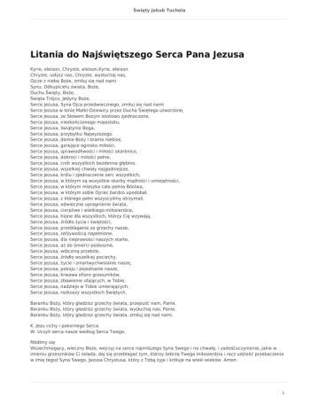 Święty Jakub Tuchola Litania do Najświętszego Serca Pana Jezusa Kyrie, eleison, Chryste, eleison,Kyrie, eleison. Chryste, usłysz nas, Chryste, wysłuchaj nas, Ojcze z nieba Boże, zmiłuj się nad nami Synu, Odkupicielu świata, Boże, Duchu Święty, Boże, Święta Trójco, Jedyny Boże, Serce Jezusa, Syna Ojca przedwiecznego, zmiłuj się nad nami Serce Jezusa w łonie Matki-Dziewicy przez Ducha Świętego utworzone, Serce Jezusa, ze Słowem Bożym istotowo zjednoczone, Serce Jezusa, nieskończonego majestatu, Serce Jezusa, świątynio Boga, Serce Jezusa, przybytku Najwyższego. Serce Jezusa, domie Boży i bramo niebios, Serce Jezusa, gorejące ognisko miłości, Serce Jezusa, sprawiedliwości i miłości skarbnico, Serce Jezusa, dobroci i miłości pełne, Serce Jezusa, cnót wszystkich bezdenna głębino, Serce Jezusa, wszelkiej chwały najgodniejsze, Serce Jezusa, królu i zjednoczenie serc wszystkich, Serce Jezusa, w którym są wszystkie skarby mądrości i umiejętności, Serce Jezusa, w którym mieszka cała pełnia Bóstwa, Serce Jezusa, w którym sobie Ojciec bardzo upodobał, Serce Jezusa, z którego pełni wszyscyśmy otrzymali, Serce Jezusa, odwieczne upragnienie świata, Serce Jezusa, cierpliwe i wielkiego miłosierdzia, Serce Jezusa, hojne dla wszystkich, którzy Cię wzywają, Serce Jezusa, źródło życia i świętości, Serce Jezusa, przebłaganie za grzechy nasze, Serce Jezusa, zelżywością napełnione, Serce Jezusa, dla nieprawości naszych starte, Serce Jezusa, aż do śmierci posłuszne, Serce Jezusa, włócznią przebite, Serce Jezusa, źródło wszelkiej pociechy, Serce Jezusa, życie i zmartwychwstanie nasze, Serce Jezusa, pokoju i pojednanie nasze, Serce Jezusa, krwawa ofiaro grzeszników, Serce Jezusa, zbawienie ufających, w Tobie, Serce Jezusa, nadziejo w Tobie umierających, Serce Jezusa, rozkoszy wszystkich Świętych, Baranku Boży, który gładzisz grzechy świata, przepuść nam, Panie. Baranku Boży, który gładzisz grzechy świata, wysłuchaj nas, Panie. Baranku Boży, który gładzisz grzechy świata, zmiłuj się nad nami. K. Jezu cichy i pokornego Serca. W. Uczyń serca nasze według Serca Twego. Módlmy się Wszechmogący, wieczny Boże, wejrzyj na serce najmilszego Syna Swego i na chwałę, i zadośćuczynienie, jakie w imieniu grzeszników Ci składa, daj się przebłagać tym, którzy żebrzą Twego miłosierdzia i racz udzielić przebaczenia w imię tegoż Syna Swego, Jezusa Chrystusa, który z Tobą żyje i króluje na wieki wieków. Amen. 1