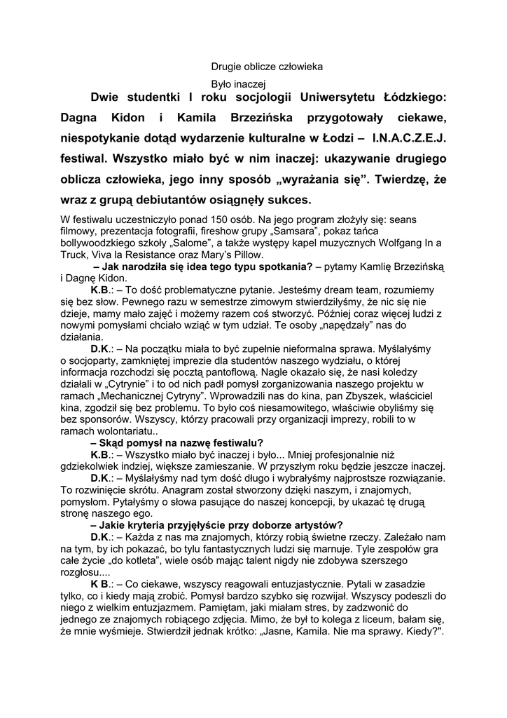 Drugie oblicze człowieka Było inaczej Dwie studentki I roku socjologii Uniwersytetu Łódzkiego: Dagna Kidon i Kamila Brzezińska przygotowały ciekawe, niespotykanie dotąd wydarzenie kulturalne w Łodzi – I.N.A.C.Z.E.J. festiwal. Wszystko miało być w nim inaczej: ukazywanie drugiego oblicza człowieka, jego inny sposób „wyrażania się”. Twierdzę, że wraz z grupą debiutantów osiągnęły sukces. W festiwalu uczestniczyło ponad 150 osób. Na jego program złożyły się: seans filmowy, prezentacja fotografii, fireshow grupy „Samsara”, pokaz tańca bollywoodzkiego szkoły „Salome”, a także występy kapel muzycznych Wolfgang In a Truck, Viva la Resistance oraz Mary’s Pillow. – Jak narodziła się idea tego typu spotkania? – pytamy Kamlię Brzezińską i Dagnę Kidon. K.B.: – To dość problematyczne pytanie. Jesteśmy dream team, rozumiemy się bez słow. Pewnego razu w semestrze zimowym stwierdziłyśmy, że nic się nie dzieje, mamy mało zajęć i możemy razem coś stworzyć. Później coraz więcej ludzi z nowymi pomysłami chciało wziąć w tym udział. Te osoby „napędzały” nas do działania. D.K.: – Na początku miała to być zupełnie nieformalna sprawa. Myślałyśmy o socjoparty, zamkniętej imprezie dla studentów naszego wydziału, o której informacja rozchodzi się pocztą pantoflową. Nagle okazało się, że nasi koledzy działali w „Cytrynie” i to od nich padł pomysł zorganizowania naszego projektu w ramach „Mechanicznej Cytryny”. Wprowadzili nas do kina, pan Zbyszek, właściciel kina, zgodził się bez problemu. To było coś niesamowitego, właściwie obyliśmy się bez sponsorów. Wszyscy, którzy pracowali przy organizacji imprezy, robili to w ramach wolontariatu.. – Skąd pomysł na nazwę festiwalu? K.B.: – Wszystko miało być inaczej i było... Mniej profesjonalnie niż gdziekolwiek indziej, większe zamieszanie. W przyszłym roku będzie jeszcze inaczej. D.K.: – Myślałyśmy nad tym dość długo i wybrałyśmy najprostsze rozwiązanie. To rozwinięcie skrótu. Anagram został stworzony dzięki naszym, i znajomych, pomysłom. Pytałyśmy o słowa pasujące do naszej koncepcji, by ukazać tę drugą stronę naszego ego. – Jakie kryteria przyjęłyście przy doborze artystów? D.K.: – Każda z nas ma znajomych, którzy robią świetne rzeczy. Zależało nam na tym, by ich pokazać, bo tylu fantastycznych ludzi się marnuje. Tyle zespołów gra całe życie „do kotleta”, wiele osób mając talent nigdy nie zdobywa szerszego rozgłosu.... K B.: – Co ciekawe, wszyscy reagowali entuzjastycznie. Pytali w zasadzie tylko, co i kiedy mają zrobić. Pomysł bardzo szybko się rozwijał. Wszyscy podeszli do niego z wielkim entuzjazmem. Pamiętam, jaki miałam stres, by zadzwonić do jednego ze znajomych robiącego zdjęcia. Mimo, że był to kolega z liceum, bałam się, że mnie wyśmieje. Stwierdził jednak krótko: „Jasne, Kamila. Nie ma sprawy. Kiedy?". D.K.: – Jeśli chodzi, na przykład o muzykę, byli to przede wszystkim znajomi z socjologii. Początkowo w grę wchodzić miała jedna kapela, później, gdy ustaliłyśmy, że będzie więcej czasu, stanęło na trzech. Członkowie wszystkich zespołów się znali i zgodnie oświadczyli, że chcą wystąpić razem. Była to dla nich wielka próba. Nigdy nie prezentowali się bowiem w takim miejscu i przed tak żywo reagującą publicznością. Zespoły bardzo dobrze ze sobą współpracowały, co przyniosło efekty. Jedna z kapel, „Wolfgang In a Truck", gra już drugi koncert w klubie De Mode. – Zapewne podejmowałyście jakieś przedsięwzięcia mające na celu promocję festiwalu, tak aby informacja o nim dotarła do jak najszerszego grona odbiorców? K.B.: – Prawie go nie propagowałyśmy. Na tydzień przed imprezą same narysowałyśmy kredkami plakaty i rozwiesiłyśmy na każdym z uniwersyteckich wydziałów. Większość uczestników festiwalu dowiedziało się o niej głównie od znajomych. Niemalże w przeddzień festiwalu powstała strona internetowa www.inaczejfestiwal.glt.pl. Obecnie jest tam dostępna galeria zdjęć z tej imprezy. – Czy macie gotową receptę lub rady dla tych, którzy być może zechcą zorganizować podobne przedsięwzięcie korzystając z waszych doświadczeń? K.B.: – To ciężka praca, ale dająca wiele satysfakcji. Slideshow, na przykład, organizowałyśmy w następujący sposób: Karolina Dębowska, Marta Wieczorek, Piotr Romanowski, Adam Wicher i Marcin Wójtowicz przesłali nam wybór własnych zdjęć. Układałyśmy je przez całą noc. Porozumiewałyśmy się przez skype do ósmej rano, po czym na trzy godziny poszłyśmy spać, by natychmiast pojawić się w „Cytrynie” i przygotowywać wszystko na miejscu. W tym roku chyba nie w pełni udało nam się ukazać główne założenie przedsięwzięcia – drugie oblicze człowieka. Jest to jednak doświadczenie na przyszłość. D.K.: – Tuż przed imprezą nawalił sprzęt, okazało się, że nie mamy laptopa. Koledzy z „Cytryny” pojechali po własny komputer. Wielkie podziękowania dla nich. Przykładem pomocnej dłoni jest na przykład Kamil, człowiek, który skończył pracę, został jednak do końca festiwalu i bardzo nam pomógł. Chciałyśmy podziękować wszystkim, którzy poświęcili nam swój czas, energię, służyli radą i pracowali razem z nami: Jankowi Rostockiemu, Joannie Jagielskiej, a także znajomym z Politechniki Łódzkiej, którzy między innymi zrobili stronę internetową i pomogli przy nagłośnieniu sali. JAROSŁAW BOŻYK