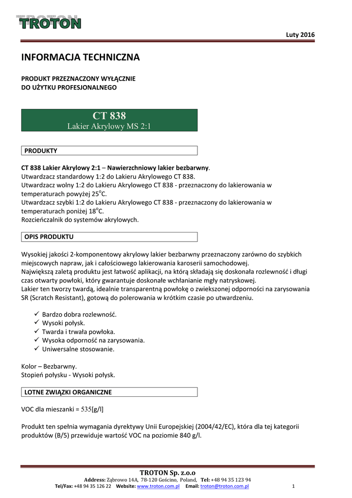 Luty 2016 INFORMACJA TECHNICZNA PRODUKT PRZEZNACZONY WYŁĄCZNIE DO UŻYTKU PROFESJONALNEGO CT 838 Lakier Akrylowy MS 2:1 PRODUKTY CT 838 Lakier Akrylowy 2:1 – Nawierzchniowy lakier bezbarwny. Utwardzacz standardowy 1:2 do Lakieru Akrylowego CT 838. Utwardzacz wolny 1:2 do Lakieru Akrylowego CT 838 - przeznaczony do lakierowania w temperaturach powyżej 25oC. Utwardzacz szybki 1:2 do Lakieru Akrylowego CT 838 - przeznaczony do lakierowania w temperaturach poniżej 18oC. Rozcieńczalnik do systemów akrylowych. OPIS PRODUKTU Wysokiej jakości 2-komponentowy akrylowy lakier bezbarwny przeznaczony zarówno do szybkich miejscowych napraw, jak i całościowego lakierowania karoserii samochodowej. Największą zaletą produktu jest łatwość aplikacji, na którą składają się doskonała rozlewność i długi czas otwarty powłoki, który gwarantuje doskonałe wchłanianie mgły natryskowej. Lakier ten tworzy twardą, idealnie transparentną powłokę o zwiekszonej odporności na zarysowania SR (Scratch Resistant), gotową do polerowania w krótkim czasie po utwardzeniu. Bardzo dobra rozlewność. Wysoki połysk. Twarda i trwała powłoka. Wysoka odporność na zarysowania. Uniwersalne stosowanie. Kolor – Bezbarwny. Stopień połysku - Wysoki połysk. LOTNE ZWIĄZKI ORGANICZNE VOC dla mieszanki = 535[g/l] Produkt ten spełnia wymagania dyrektywy Unii Europejskiej (2004/42/EC), która dla tej kategorii produktów (B/5) przewiduje wartość VOC na poziomie 840 g/l. TROTON Sp. z.o.o Address: Ząbrowo 14A, 78-120 Gościno, Poland, Tel: +48 94 35 123 94 Tel/Fax: +48 94 35 126 22 Website: www.troton.com.pl Email: [email protected] 1 Luty 2016 PRZYGOTOWANIE PODŁOŻA 2-komponentowe Lakiery Akrylowe mogą być aplikowane na: Lakiery bazowe. Stare powłoki w dobrym stanie po zmatowaniu i odtłuszczeniu. PROCES LAKIEROWANIA Zastosowanie Naprawy lakiernicze karoserii, które wymagają trwałego wykończenia. Proporcje mieszania objętościowo Lakier Utwardzacz Rozcieńczalnik 2 1 10% Lepkość natryskowa 15÷17 sekund w 20oC. Żywotność mieszanki około 5 godzin w 20oC. Liczba warstw 2 pełne warstwy, 50÷70 µm suchej powłoki. Parametry dla pistoletu RP Dysza: 1.3÷1.4 mm; Ciśnienie na wejściu: 2,0÷2,2 bar. Parametry dla pistoletu HVLP Dysza: 1.3÷1.4 mm; Ciśnienie wlotowe: 2,0 bar. Czasy odparowania Pomiędzy warstwami: Przed wygrzewaniem: około 5 minut około 10 minut TROTON Sp. z.o.o Address: Ząbrowo 14A, 78-120 Gościno, Poland, Tel: +48 94 35 123 94 Tel/Fax: +48 94 35 126 22 Website: www.troton.com.pl Email: [email protected] 2 Luty 2016 Czas utwardzania w temperaturze 20oC Pyłosuchy: po około 30 minutach. Gotowy do polerowania: po schnięciu przez noc. Czas utwardzania w temperaturze obiektu 60°C Lakier gotowy do polerowania po około 30 minutach wygrzewania i schłodzeniu powłoki (około 2 godzin). Temperatura poniżej 20oC znacznie wydłuża czas schnięcia. Suszenie promiennikiem IR 10÷20 minut fal krótkich, w zależności od grubości warstwy i rodzaju promiennika. WYDAJNOŚĆ 1 litr mieszanki wystarcza do pomalowania 10÷12 m2 powierzchni warstwą o grubości 50 μm. CIENIOWANIE Upewnij się, że pokryłeś cały obszar lakieru bazowego i cieniuj tylko na przygotowanym obszarze. Użyj rozcieńczalnika do cieniowania FADE OUT THINNER, aby wtopić odkurz osiadający wokół powierzchni reperowanej oraz zniwelować optyczne różnice połysku w miejscu styku starej powłoki lakierowej i nowo nałożonego lakieru akrylowego. POLEROWANIE I USUWANIE WTRĄCEŃ Polerowanie zazwyczaj nie jest potrzebne, jako że lakier bezbarwny CT 838 daje doskonały wygląd powłoki od razu po aplikacji. Jeśli pojawiły się wtrącenia brudu, zaleca się usunięcie ich na mokro papierem o gradacji 1500-2000 i późniejsze polerowanie za pomocą pasty polerskiej. Polerowanie powłok 2K najłatwiejsze jest od 1 do 24 godzin po ostygnięciu powłoki. UWAGI OGÓLNE Nie przekraczać zalecanych ilości utwardzacza! Najlepsze rezultaty osiągnie się lakierując w temperaturze pokojowej. Temperatura otoczenia i temperatura produktu aplikowanego powinny być zbliżone. Podczas pracy z produktami 2-komponentowymi zaleca się używać sprzętu ochrony osobistej. Chronić oczy i drogi oddechowe. Pomieszczenia powinny być dobrze wentylowane. Narzędzia powinny być myte bezpośrednio po aplikacji. Uwaga: W celu zachowania bezpieczeństwa należy zawsze postępować zgodnie z instrukcjami zawartymi w karcie MSDS produktu TROTON Sp. z.o.o Address: Ząbrowo 14A, 78-120 Gościno, Poland, Tel: +48 94 35 123 94 Tel/Fax: +48 94 35 126 22 Website: www.troton.com.pl Email: [email protected] 3 Luty 2016 MAGAZYNOWANIE Składniki produktu należy przechowywać w szczelnie zamkniętych opakowaniach, w pomieszczeniach suchych i chłodnych, z dala od źródeł ognia. Nie narażać na bezpośrednie działanie promieni słonecznych. Uwaga: 1. Zamykać pojemniki natychmiast po użyciu produktu. 2. Chronić utwardzacz przed mrozem i wilgocią! OKRES GWARANCJI CT 838 Lakier Akrylowy 2:1 – 12 miesięcy od daty produkcji. Utwardzacze 1:2 do Lakieru Akrylowego CT 838 – 9 miesięcy od daty produkcji. Wszystkie informacje opierają się na skrupulatnych badaniach laboratoryjnych i długoletnim doświadczeniu. Ugruntowana pozycja na rynku nie zwalnia nas z ciągłej kontroli jakości naszych produktów. Jednak nie ponosimy odpowiedzialności za końcowe efekty przy niewłaściwym przechowywaniu lub użytkowaniu naszych wyrobów oraz za pracę niezgodną ze sztuką dobrego rzemiosła. TROTON Sp. z o.o. Ząbrowo, Poland. TROTON Sp. z.o.o Address: Ząbrowo 14A, 78-120 Gościno, Poland, Tel: +48 94 35 123 94 Tel/Fax: +48 94 35 126 22 Website: www.troton.com.pl Email: [email protected] 4